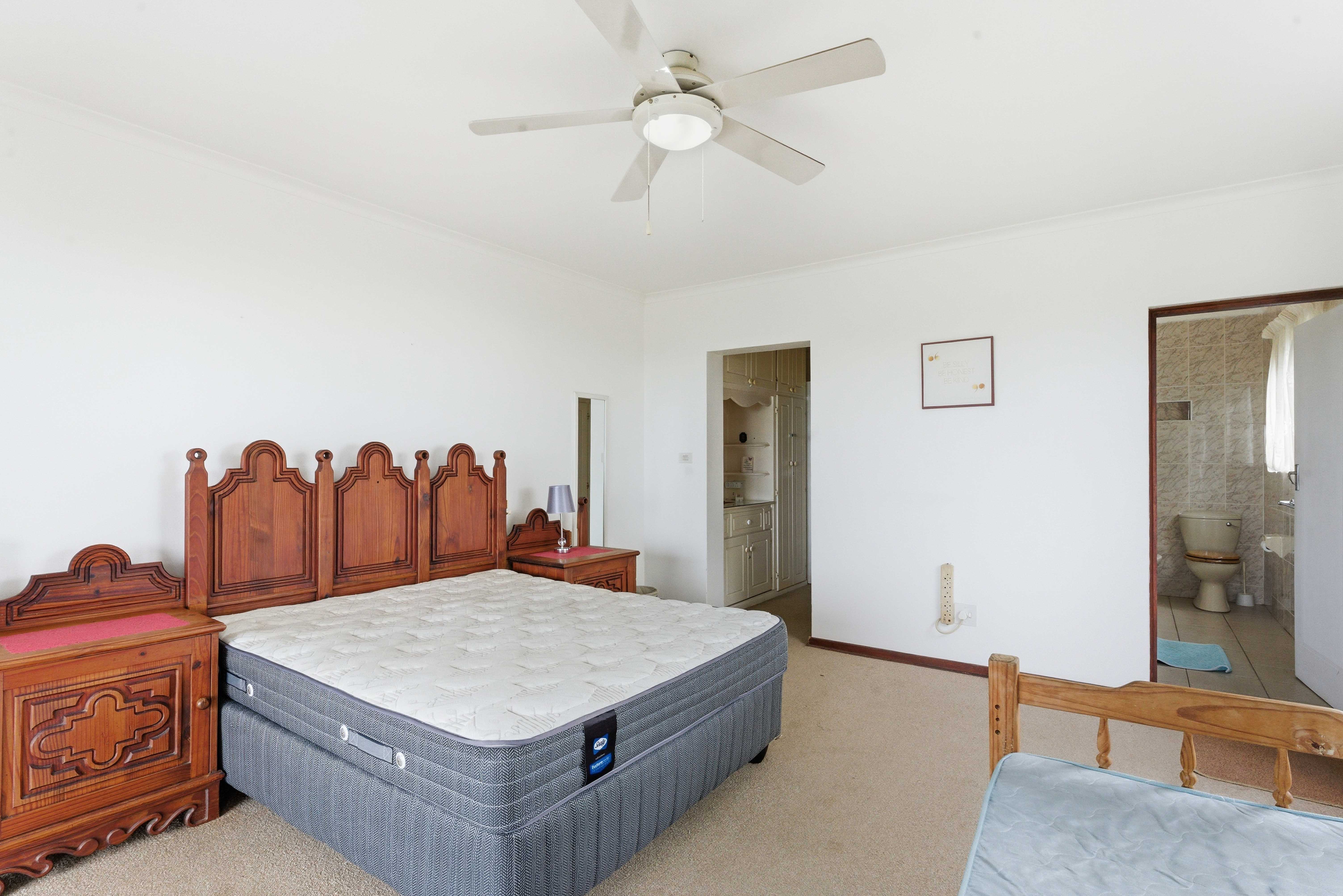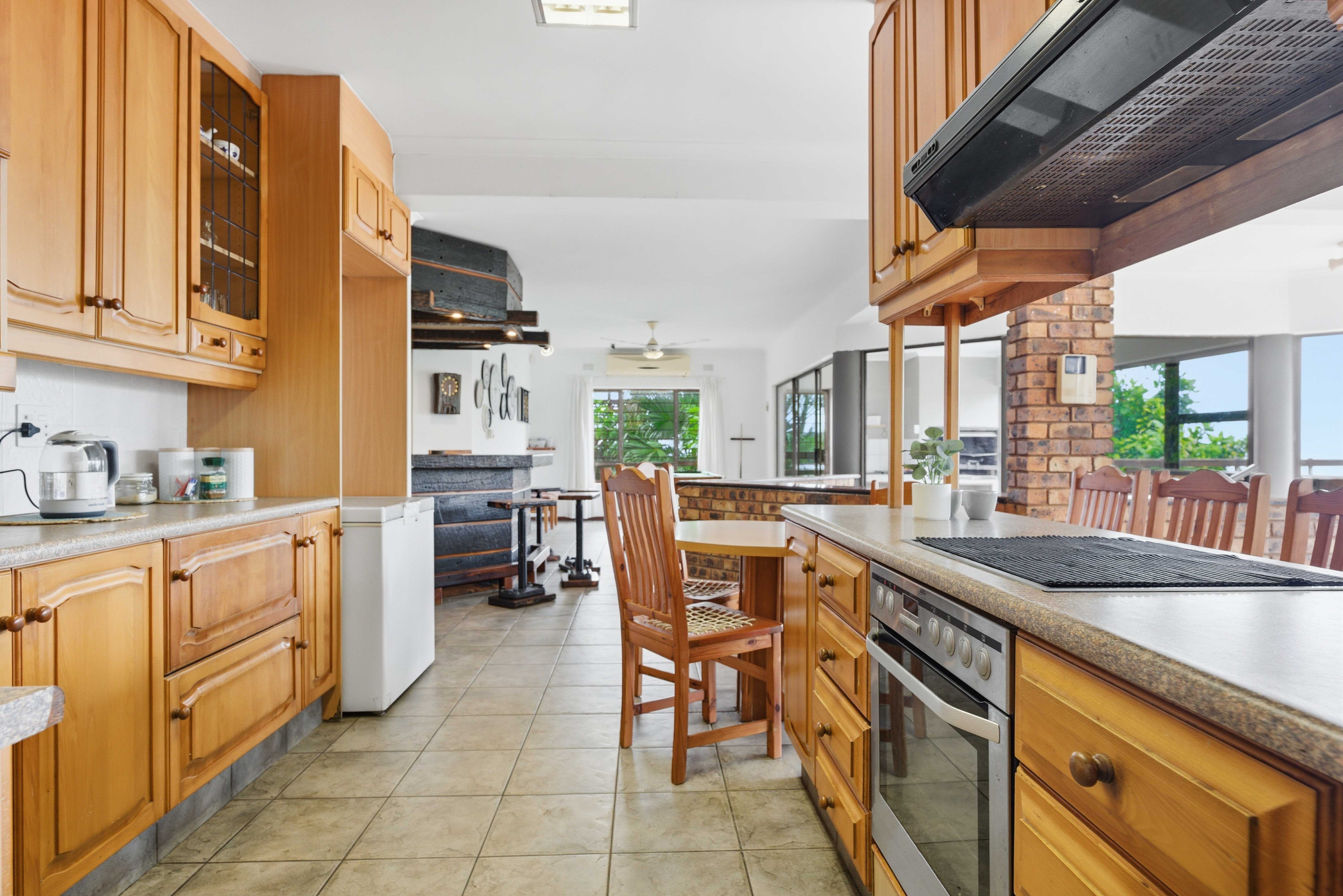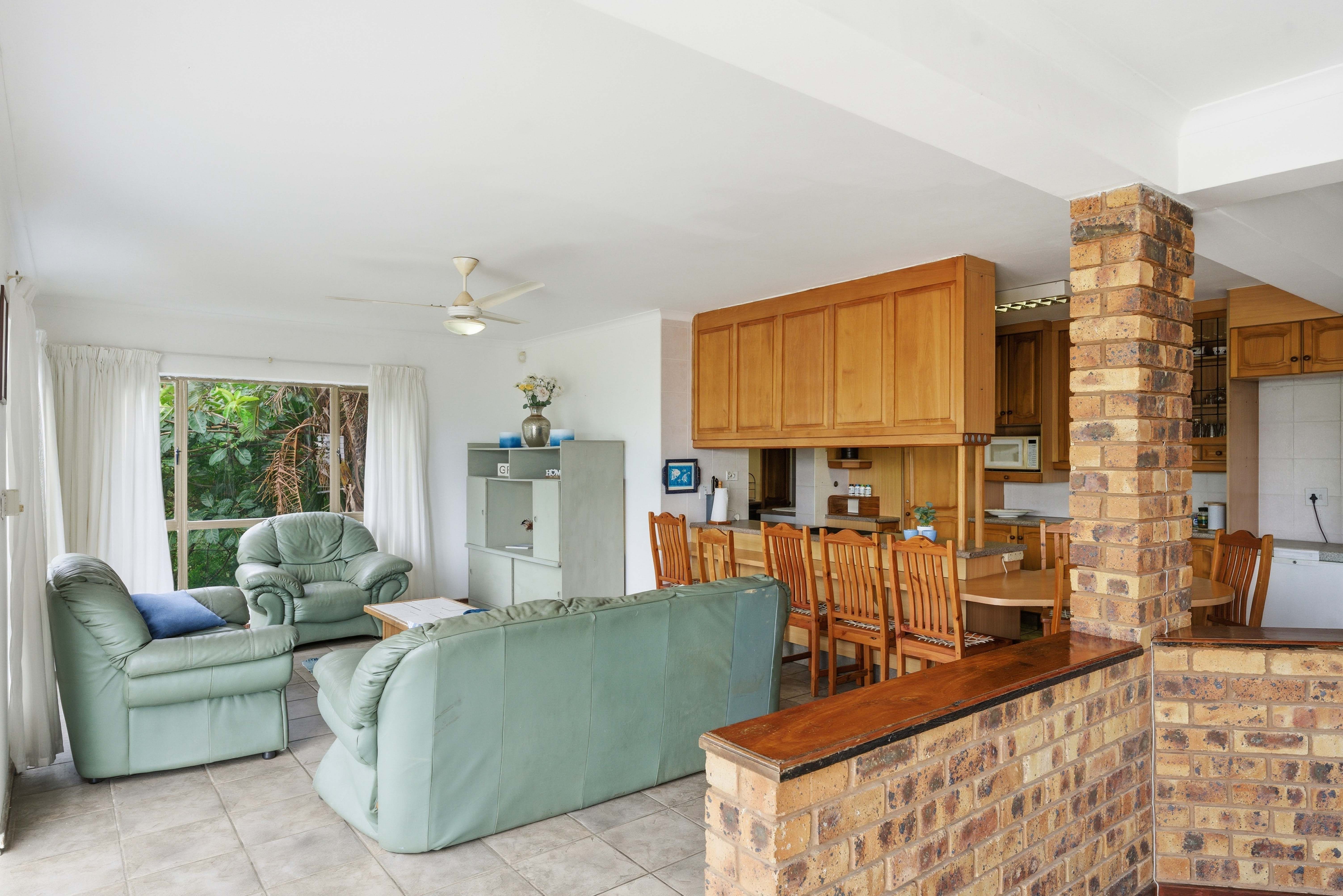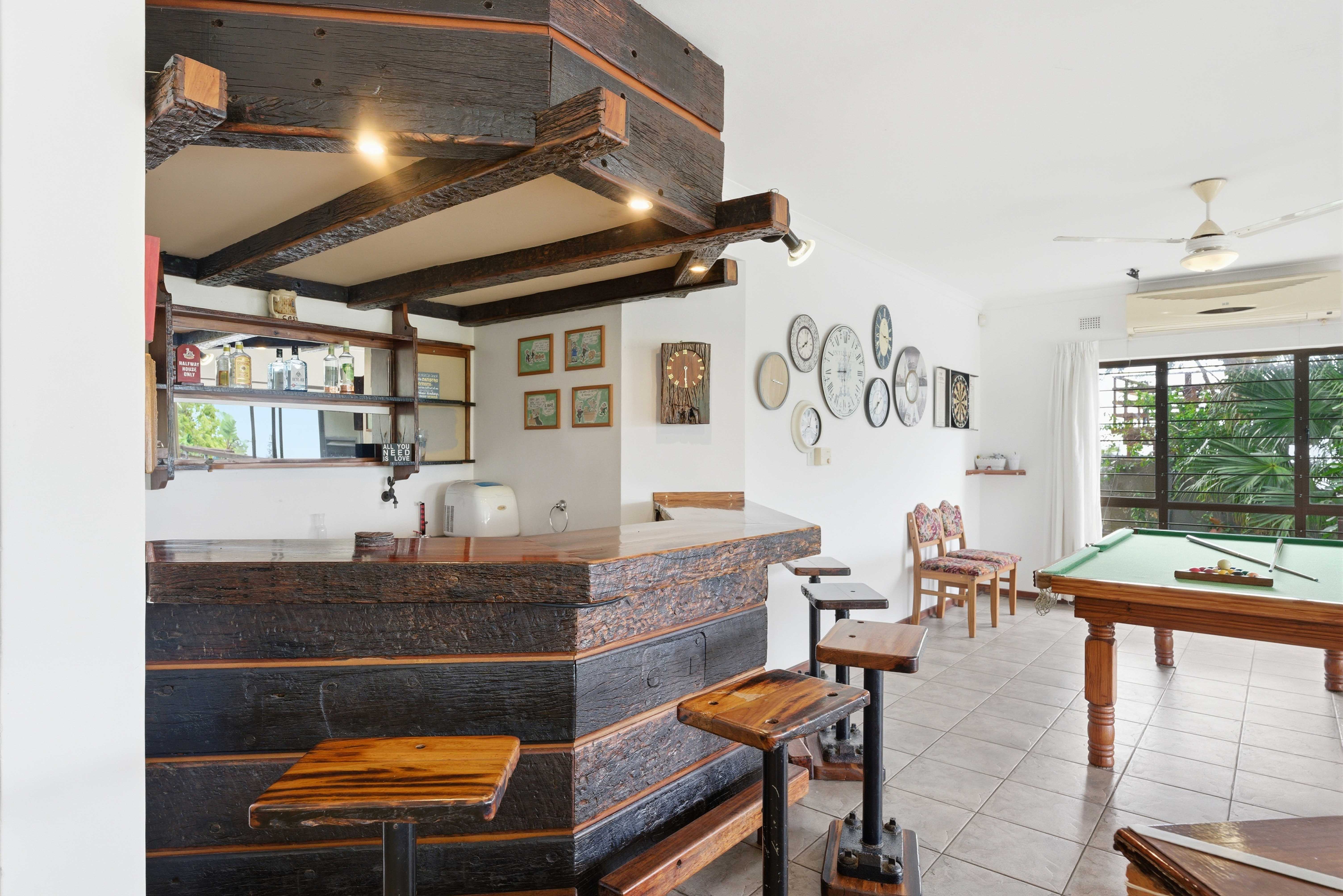 The home features an expansive open-plan design, where a spacious, well-appointed kitchen flows seamlessly into a bar area and indoor braai, creating an ideal setting for entertaining. These living spaces open onto a large open-air patio and entertainment area, overlooking a neat, easy-to-maintain swimming pool — perfect for relaxed coastal living.