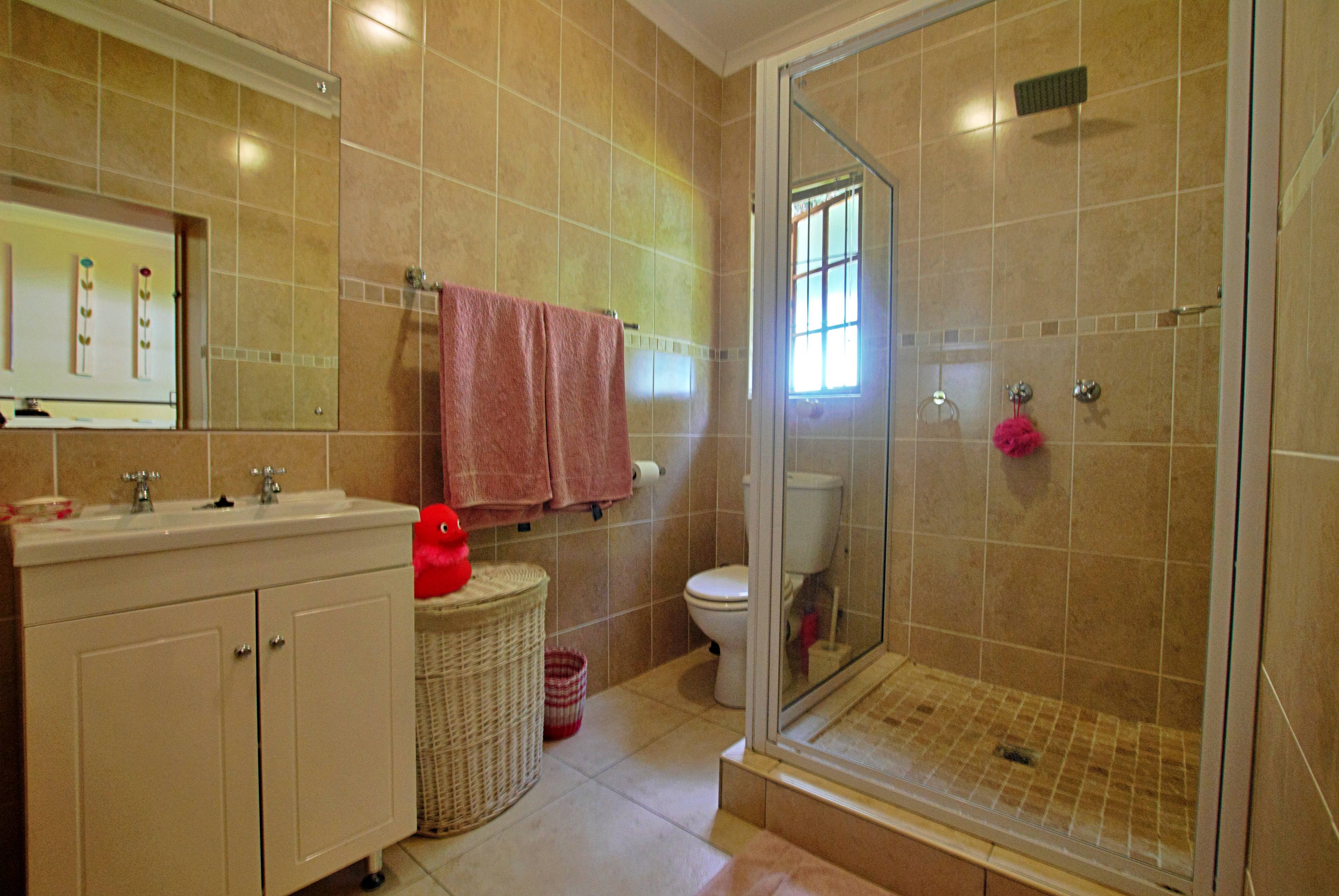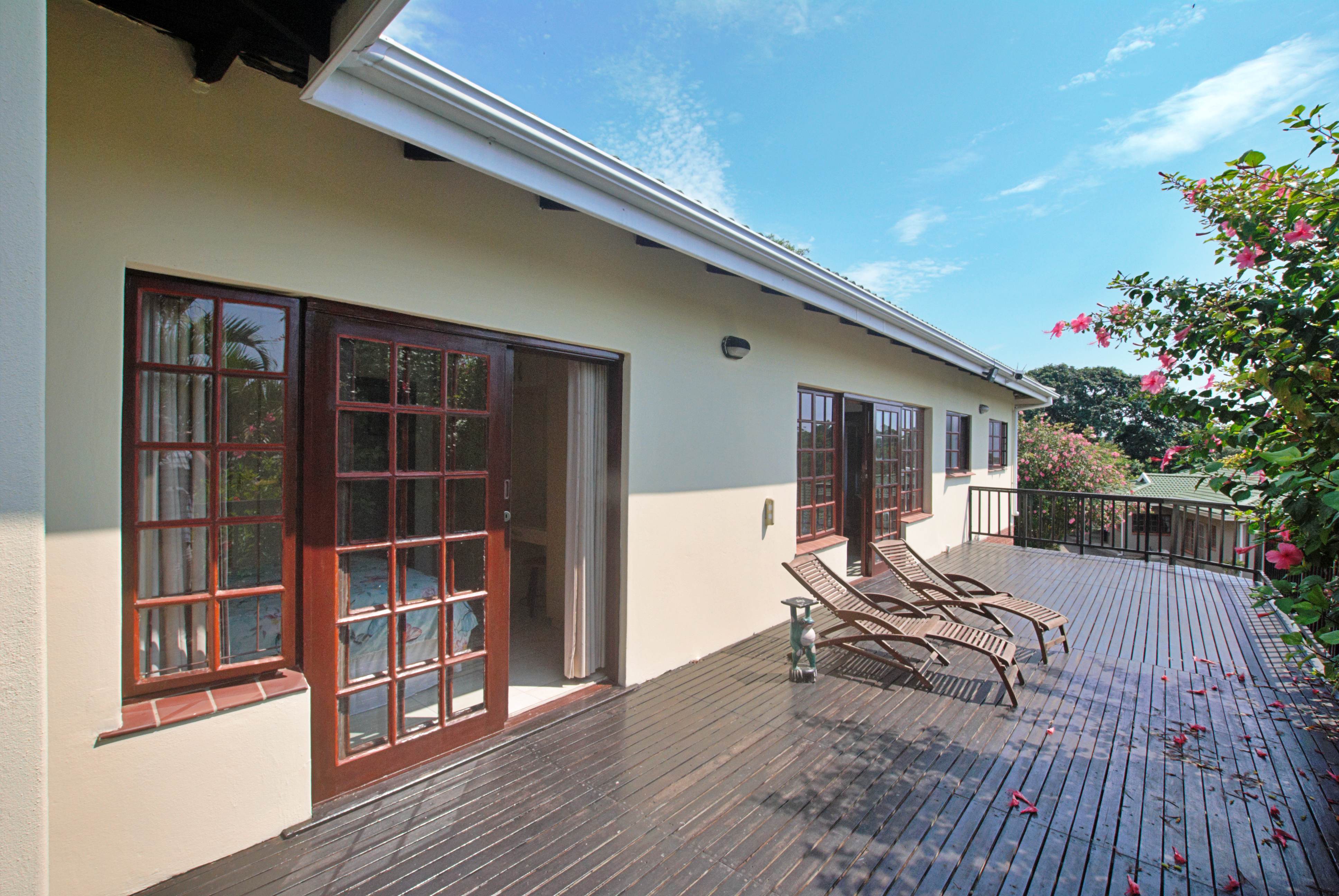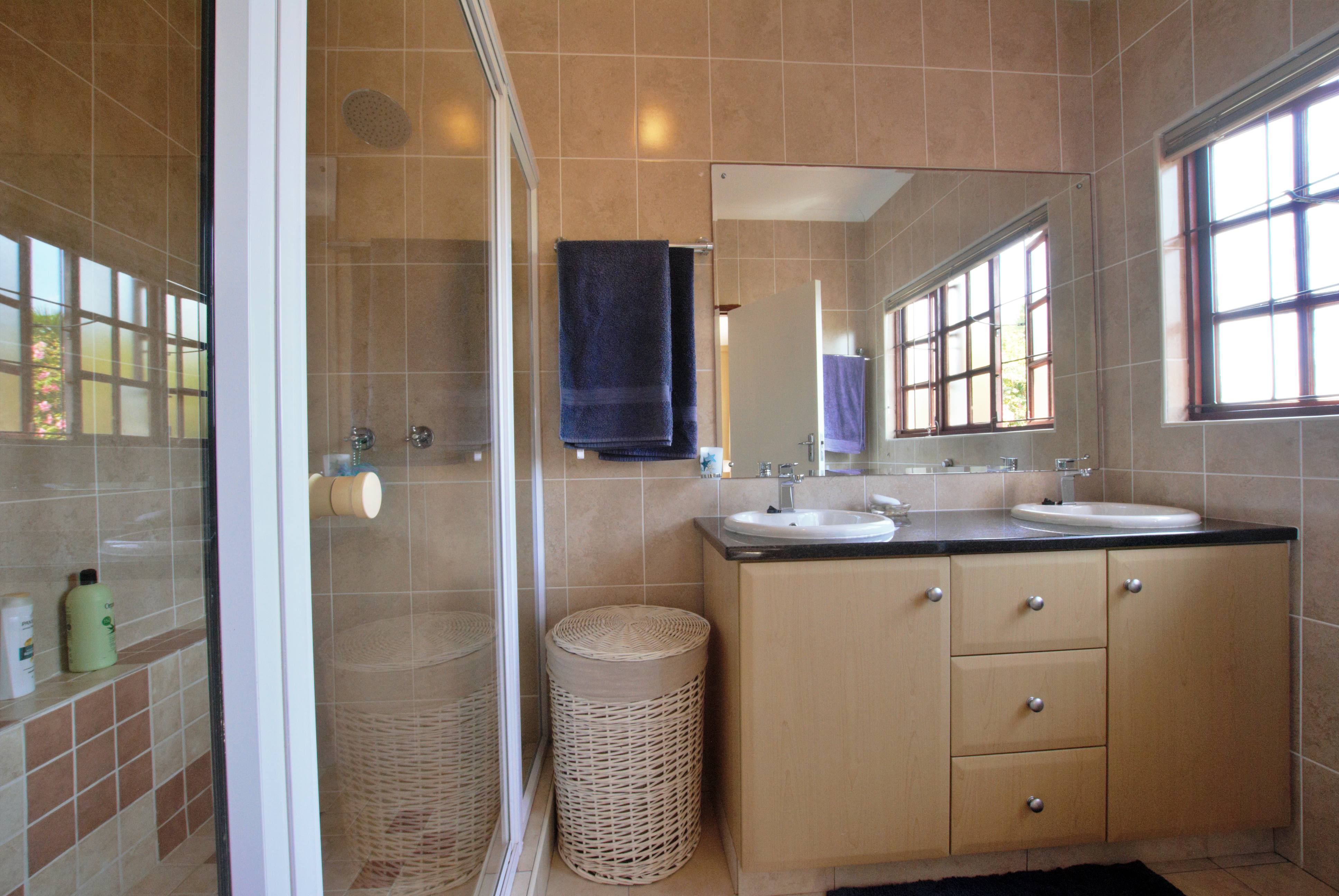 Accommodation includes four tiled bedrooms with built-in cupboards, two of which open onto the deck via sliding doors. The main bedroom is generously sized and boasts a modern en-suite bathroom complete with a double shower, his-and-hers basins, toilet, and granite finishes. The fourth bedroom also enjoys its own en-suite bathroom with shower. In addition, there is a third bathroom fitted with a bath, basin, and toilet — ideal for family or guests. A linen cupboard in the passage provides additional storage.