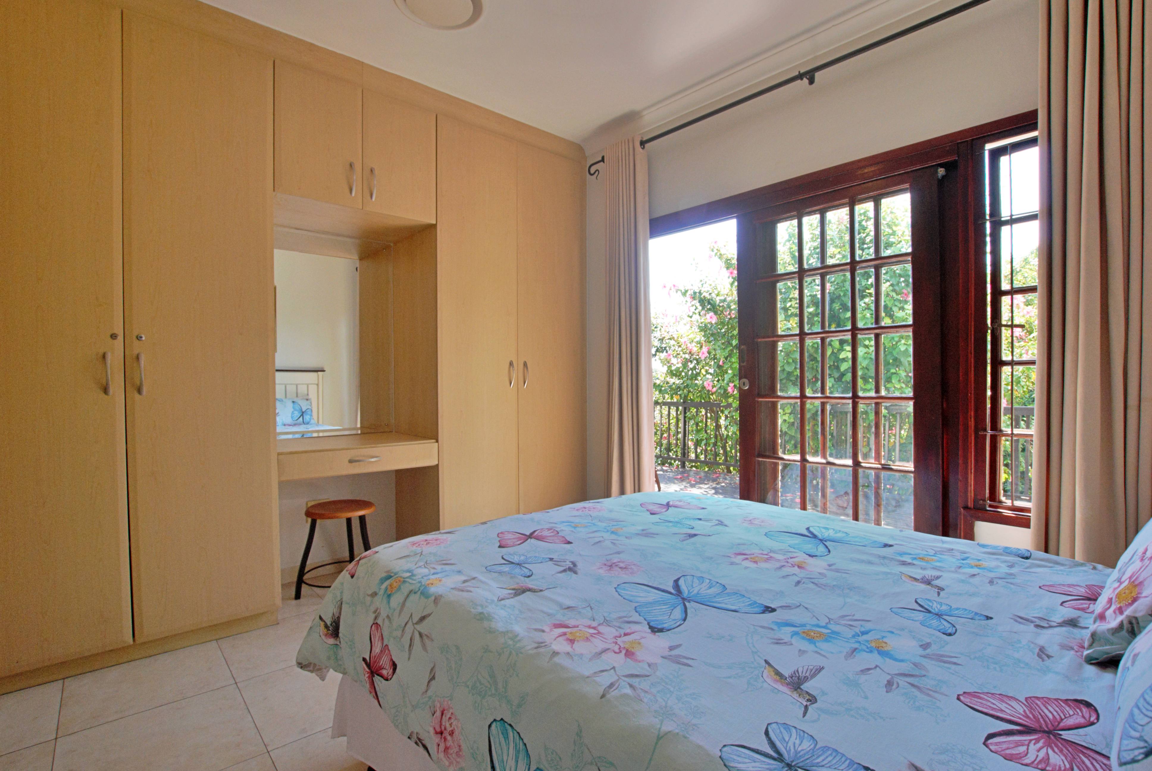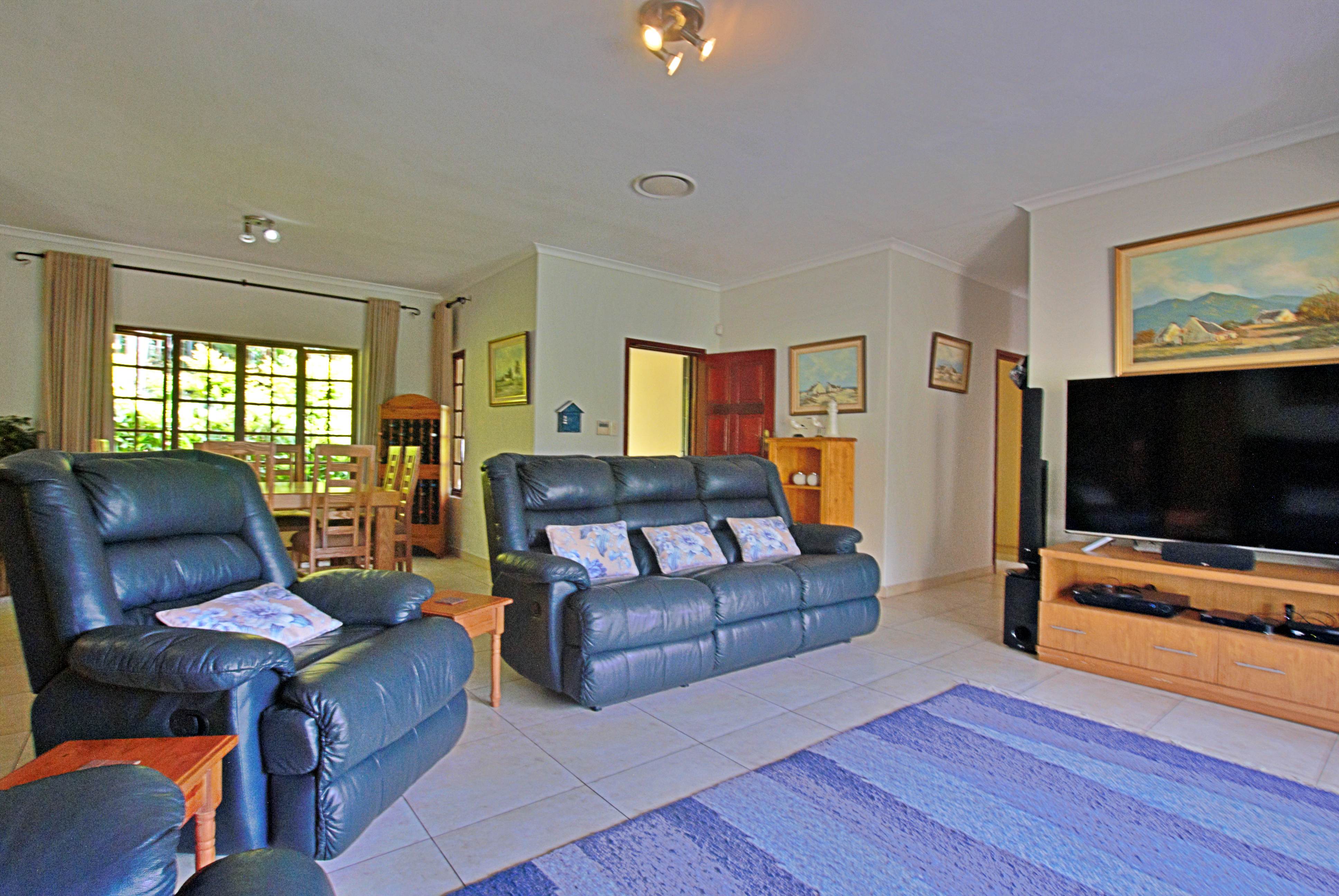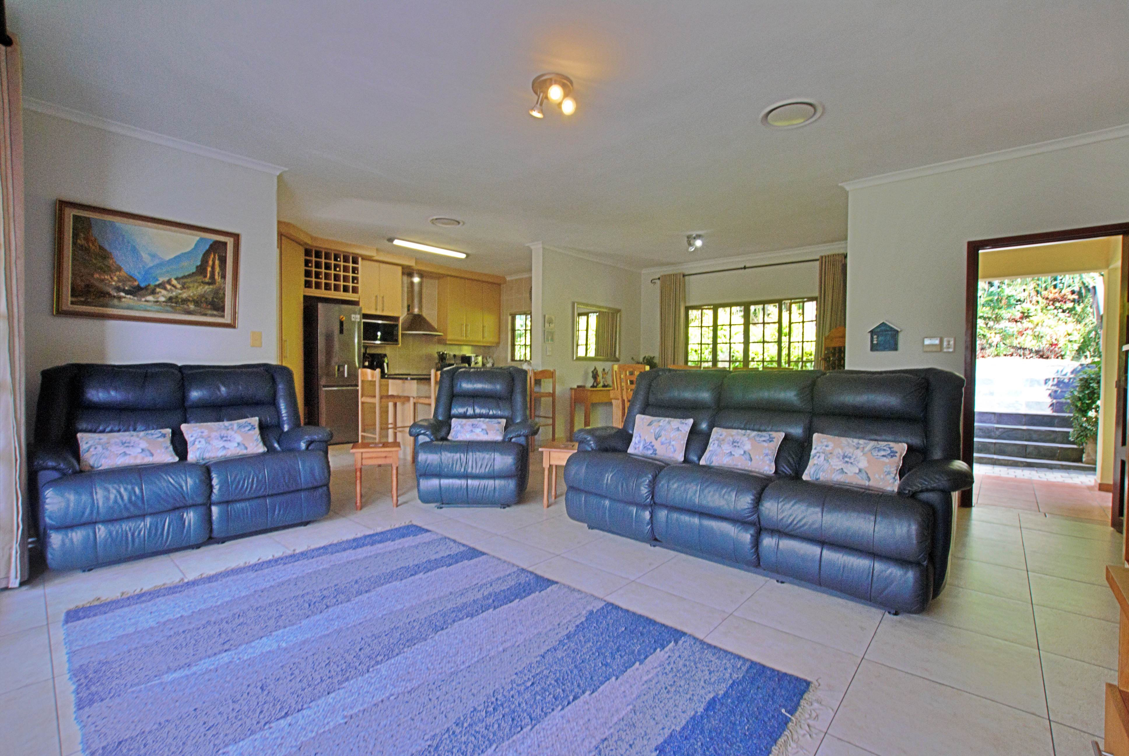 From the moment you enter, you are welcomed into a spacious, air conditioned open-plan living and dining area that flows effortlessly through stack-away doors onto an extended wooden deck — perfect for indoor-outdoor living and entertaining. A built-in braai and outdoor shower enhance the relaxed coastal lifestyle, while lush gardens and abundant birdlife create a tranquil setting.