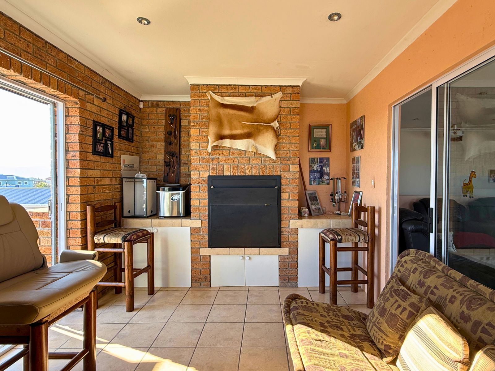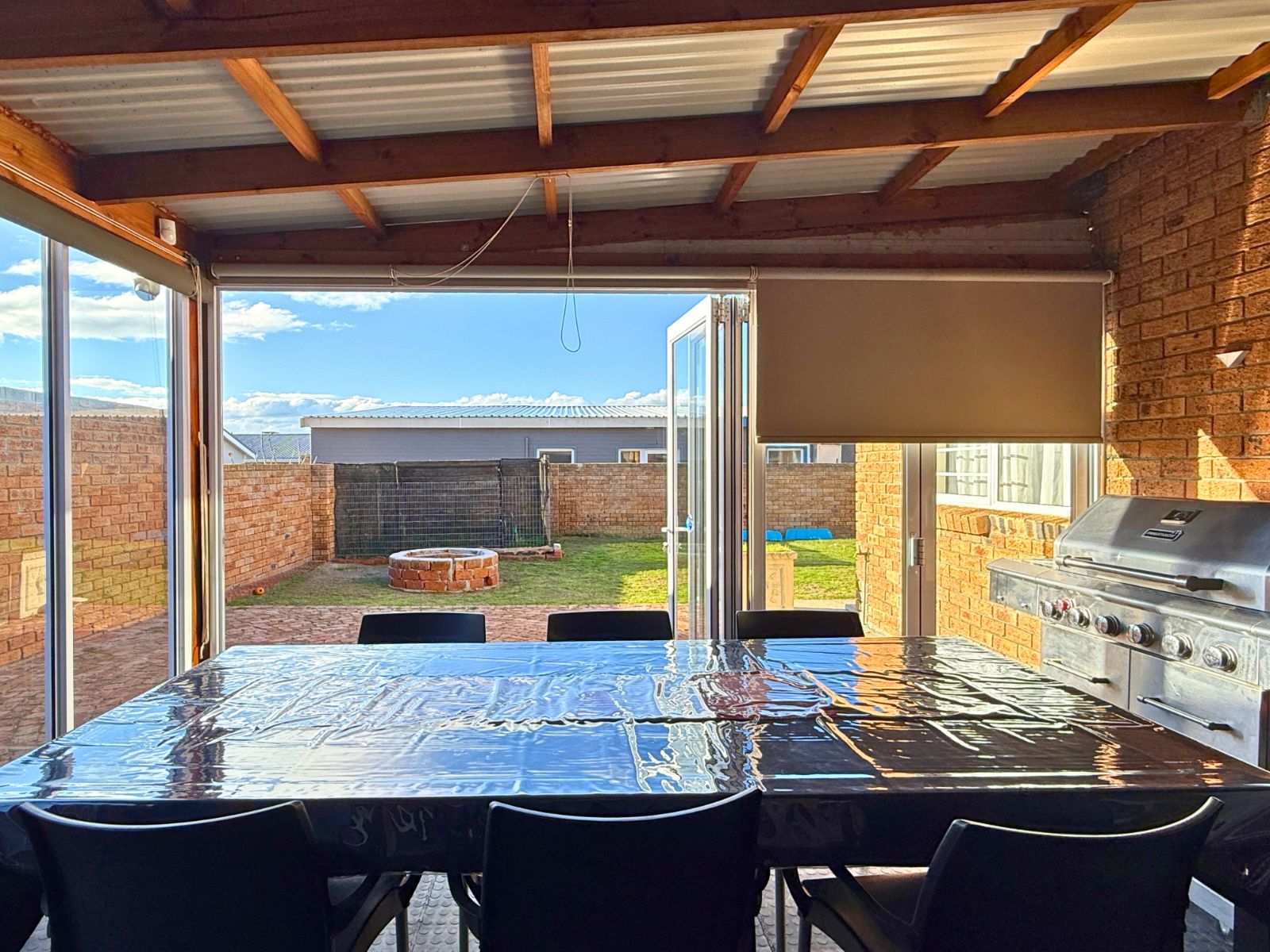 The home excels in versatile living and effortless entertaining, featuring two fully enclosed braai rooms. The downstairs braai room is ideal for year-round gatherings, opening with folding stacking doors onto the fully enclosed garden. Upstairs, a large open-plan living and dining area, complete with a projector and screen, flows seamlessly to a patio that offers lovely sea views. Thoughtfully designed corner bedrooms ensure ample natural light and lovely views for every resident. Crucially, the home is equipped with a comprehensive power and water system, including a solar system with a 5kW inverter and a JoJo water tank with a filtration system connected to the house, providing true self-sufficiency and uninterrupted living.