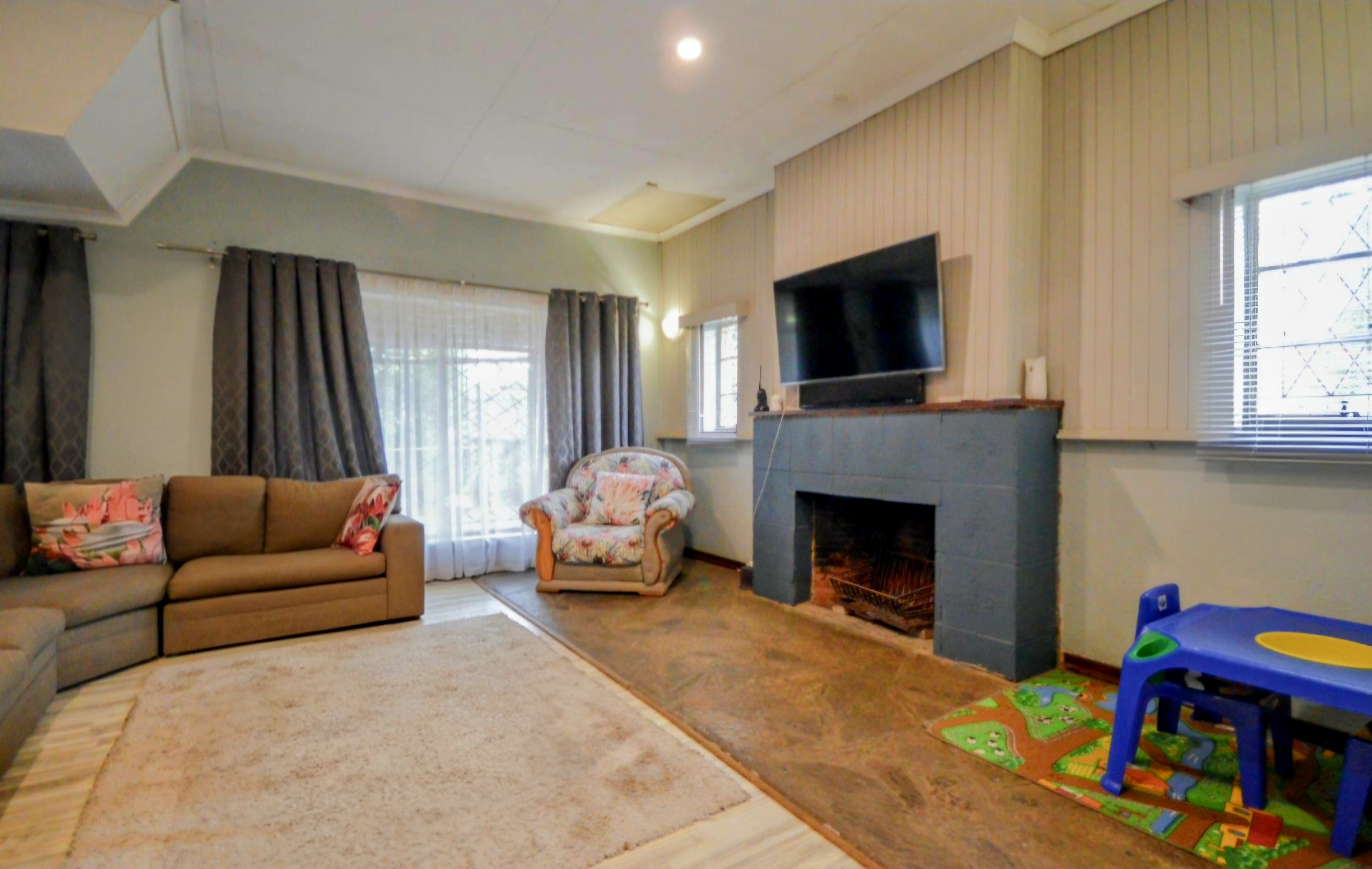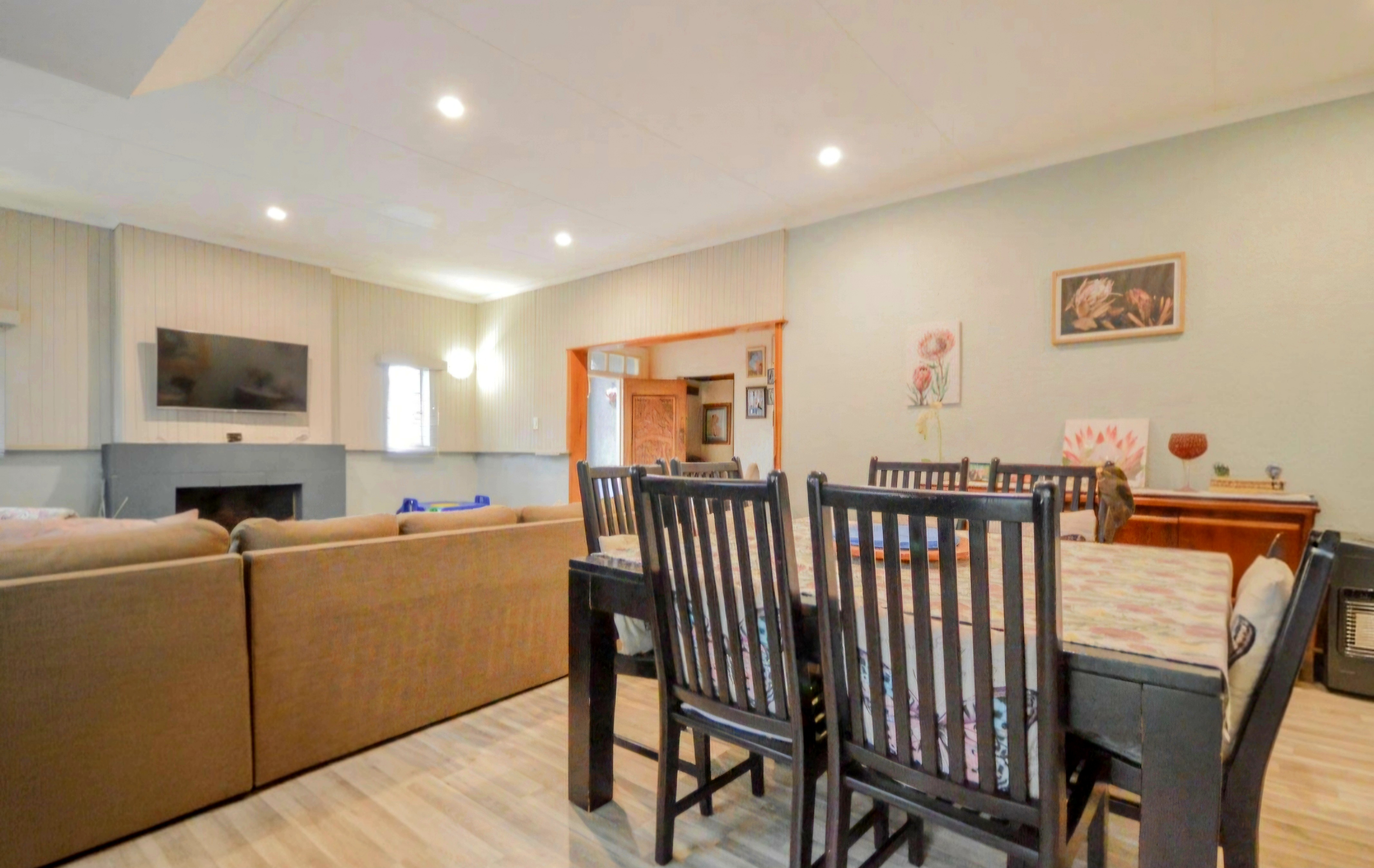 The generous kitchen is fitted with ample cupboards, providing plenty of storage and workspace—ideal for family meals and entertaining guests. Multiple living areas create a warm, welcoming atmosphere, complemented by a fireplace for cosy winter evenings.