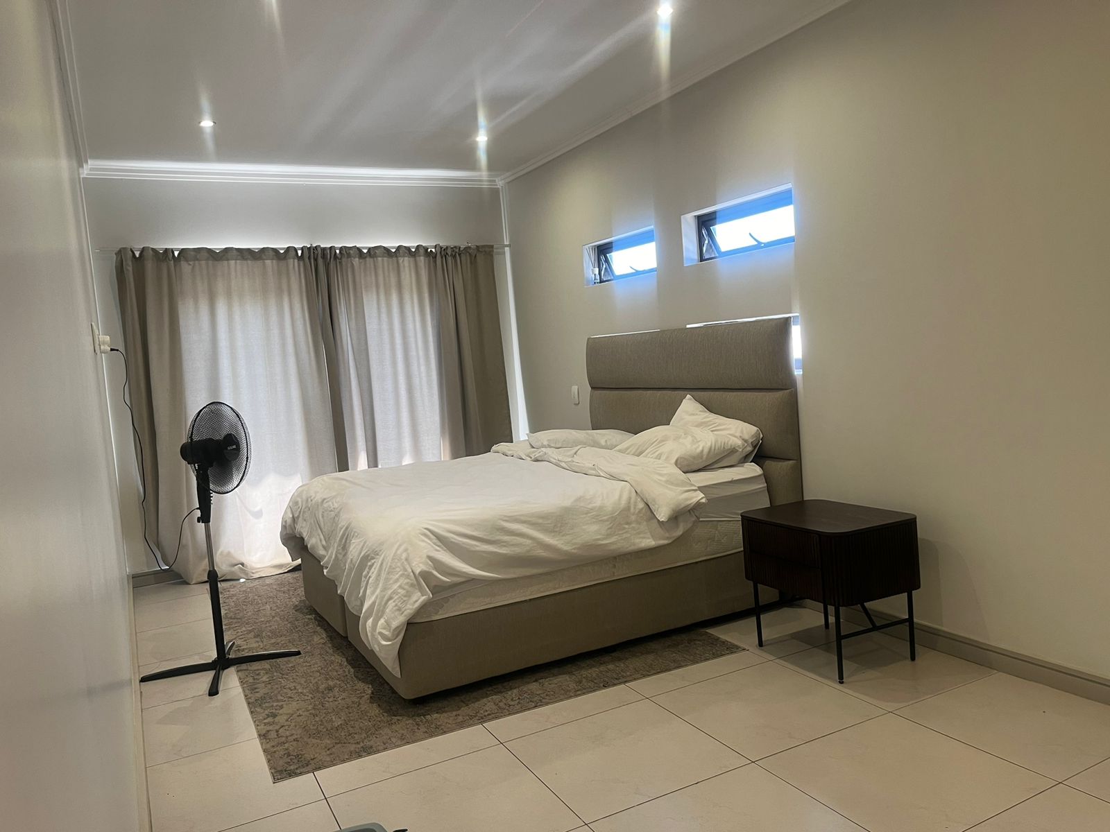 The home opens to a seamless flow of a lounge, kitchen and dining area with modern fittings and stary ceiling lights. The kitchen has a gas stove, space for 2 appliances and a double door fridge. An island provides for extra working space and storage. The lounge opens to a sizeable garden for entertaining and relaxation.