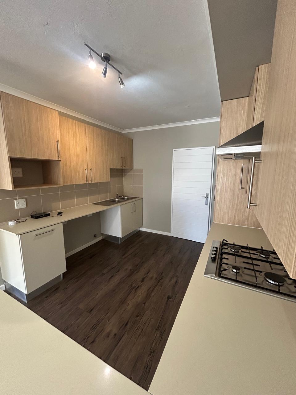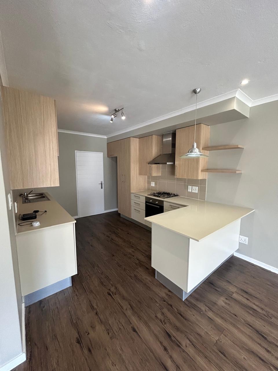 The property offers a large open plan kitchen with breakfast counter, stone tops, gas hob with electric oven, plenty of cupboards and space for three appliances.