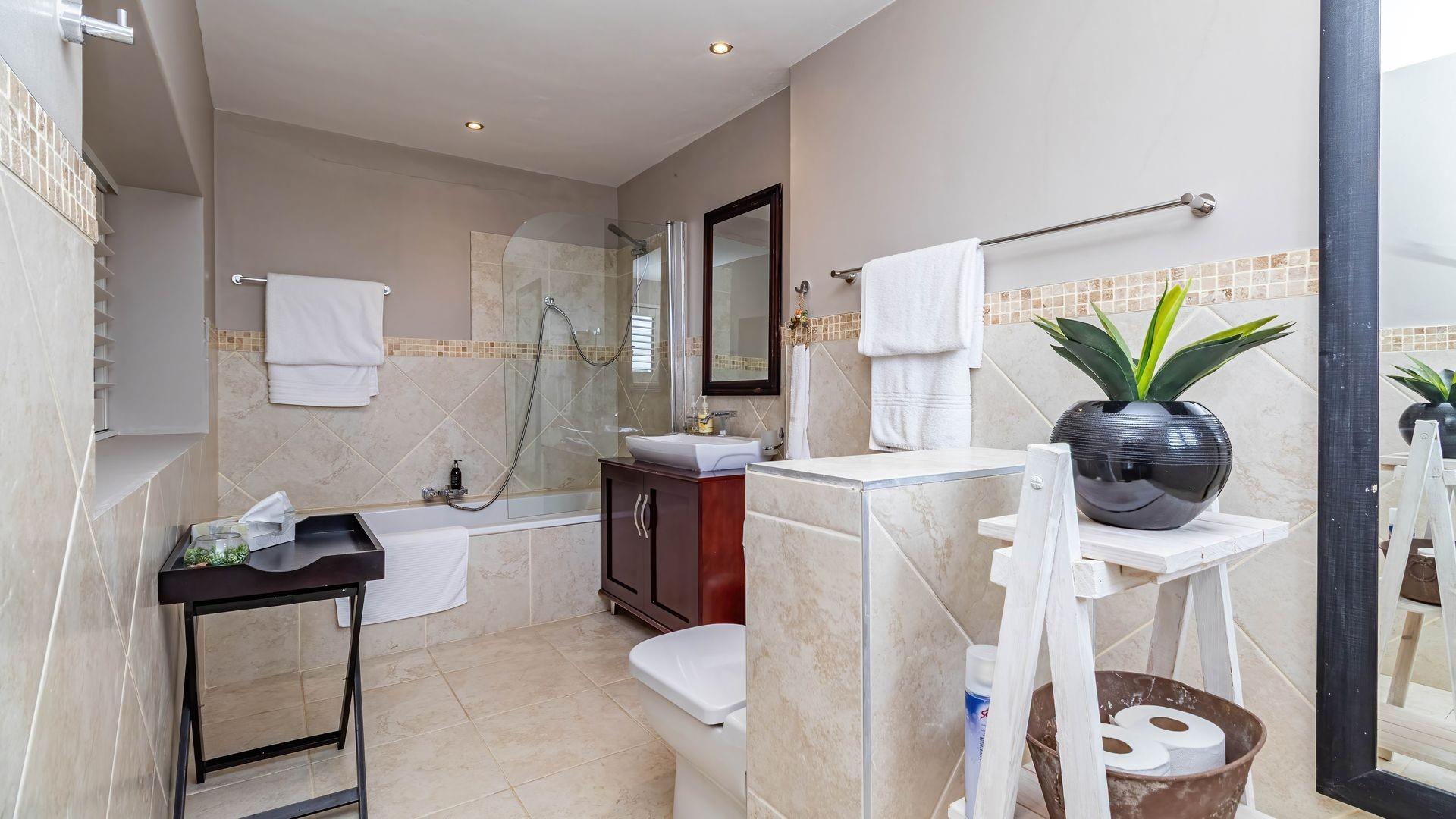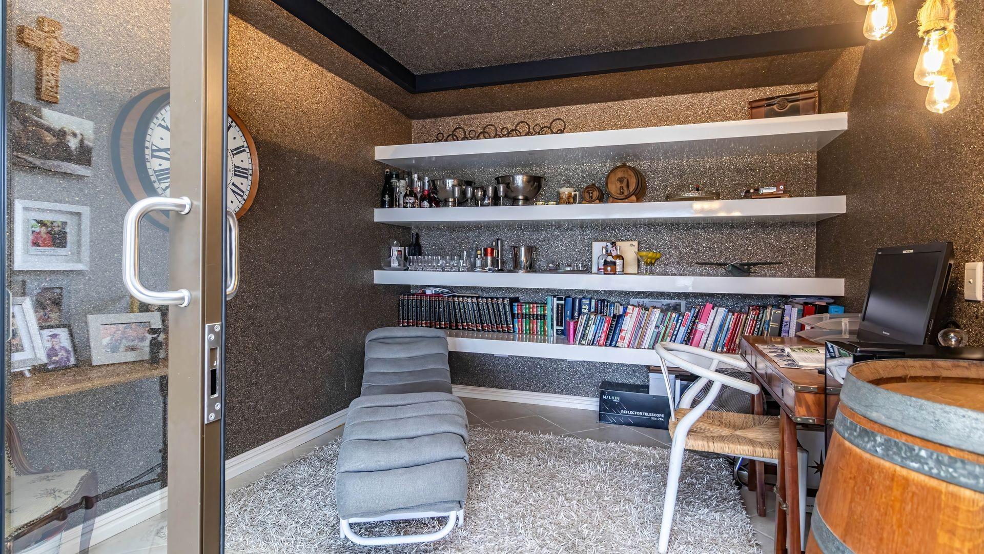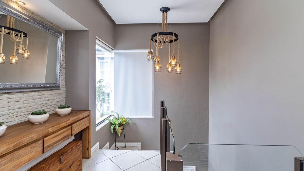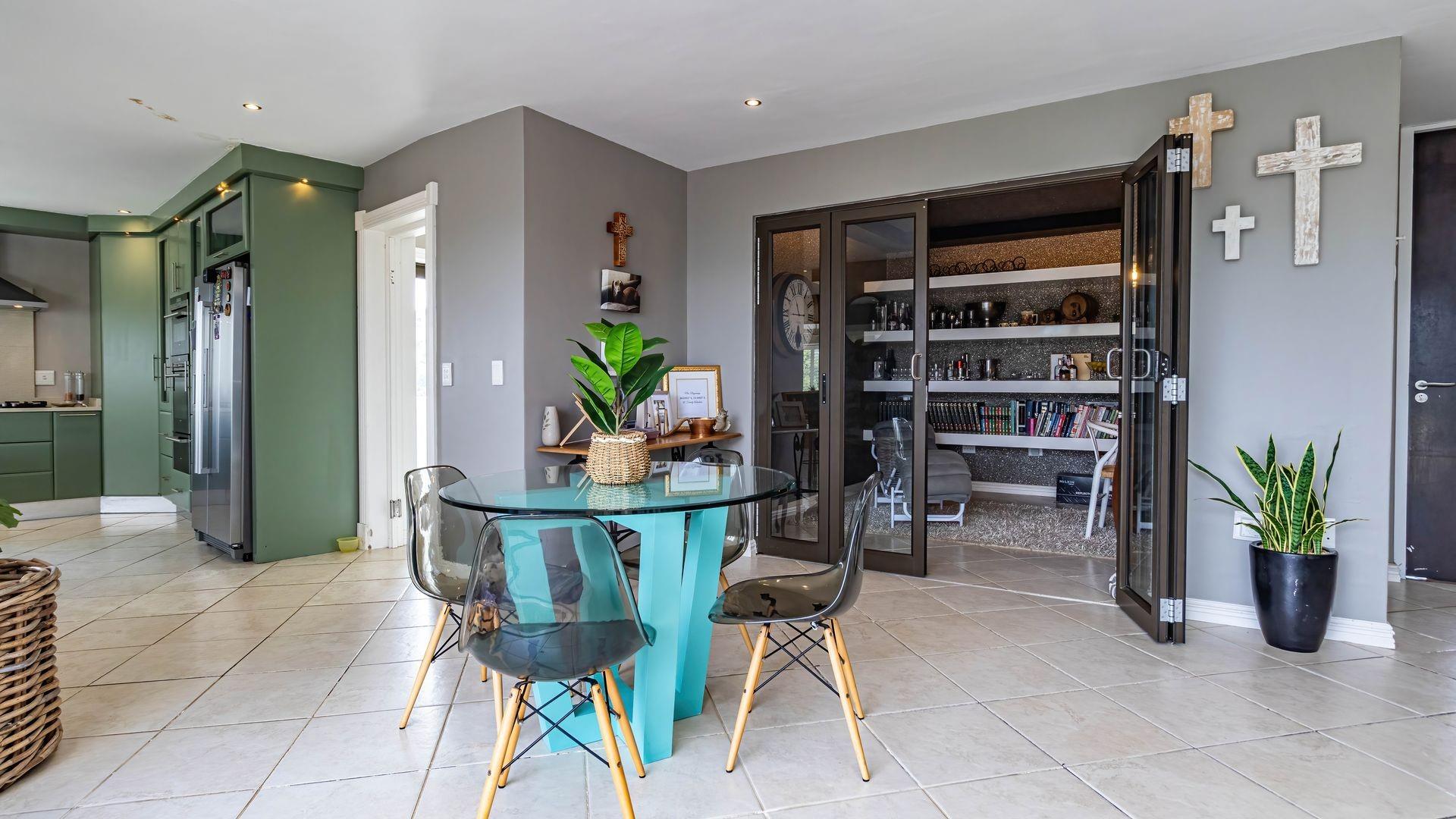 The ground floor is designed for effortless living and entertaining, featuring a seamless flow between multiple open-plan spaces. Two lounges – one with a cosy fireplace – anchor the living area, while an entertainment room with a built-in gas braai connects directly to the kitchen. A glass-doored room, fit for a cellar or study and a spacious scullery with abundant storage complete this level. The scullery has direct access to the double garage. All living spaces open onto a central outdoor deck, creating a private entertainment hub ideal for gatherings.