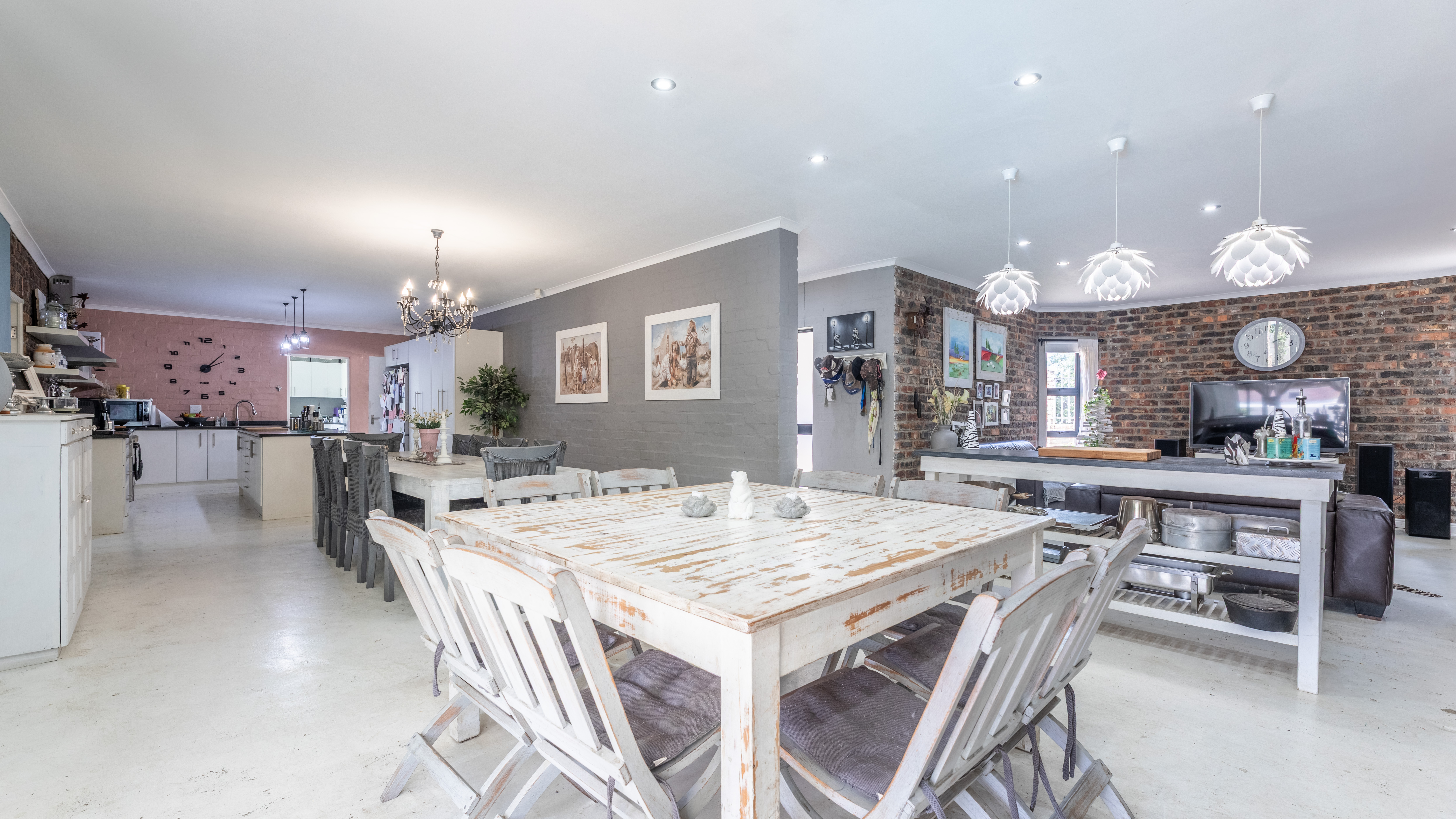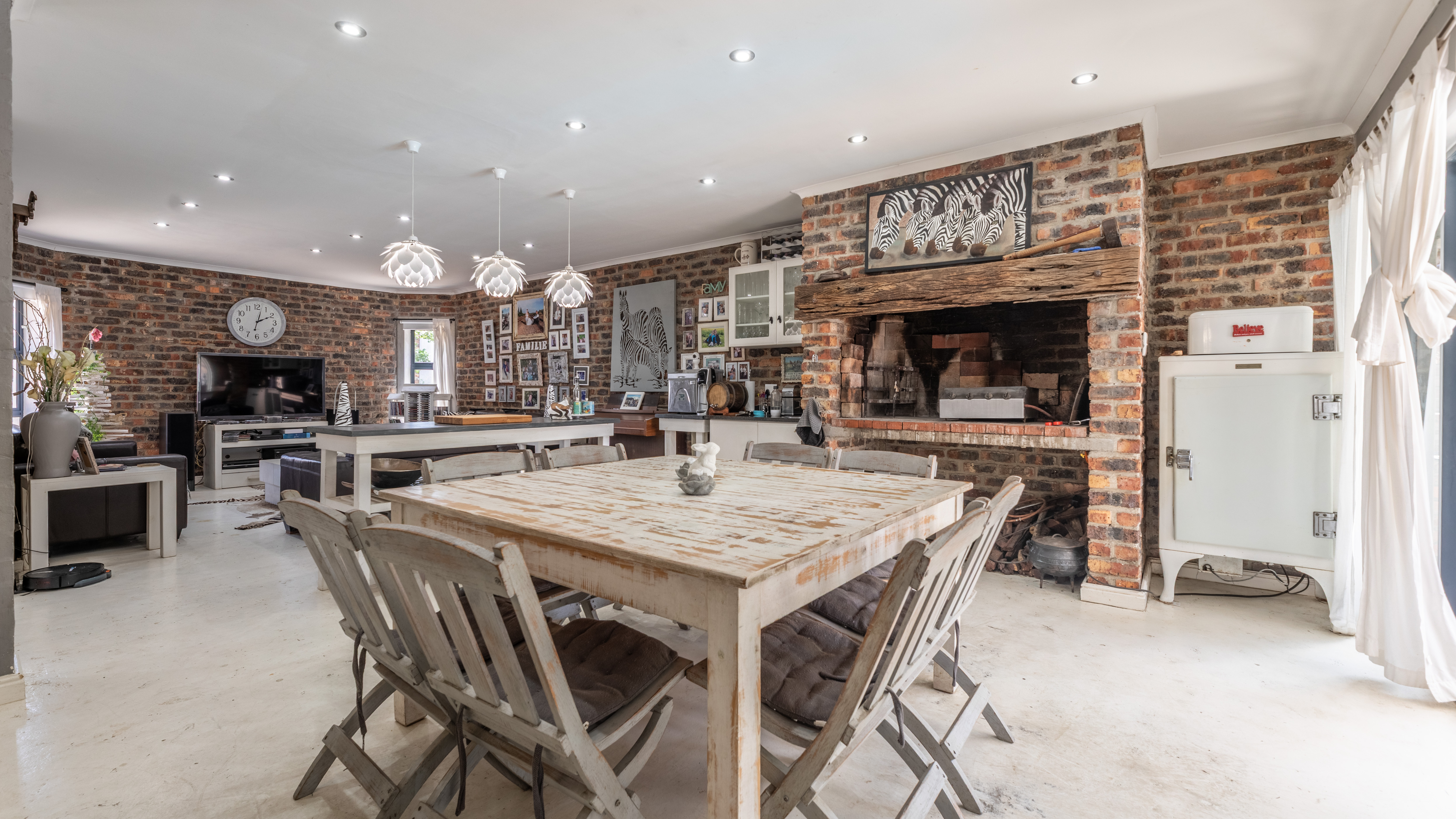 The open-plan living area, warmed by a cozy fireplace, flows seamlessly to an outdoor entertainment oasis. Host with ease using the large wood-fired pizza oven, built-in braai, and smoker, all while enjoying the peaceful atmosphere of the village.