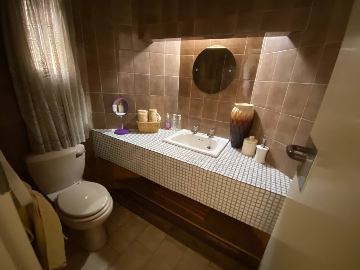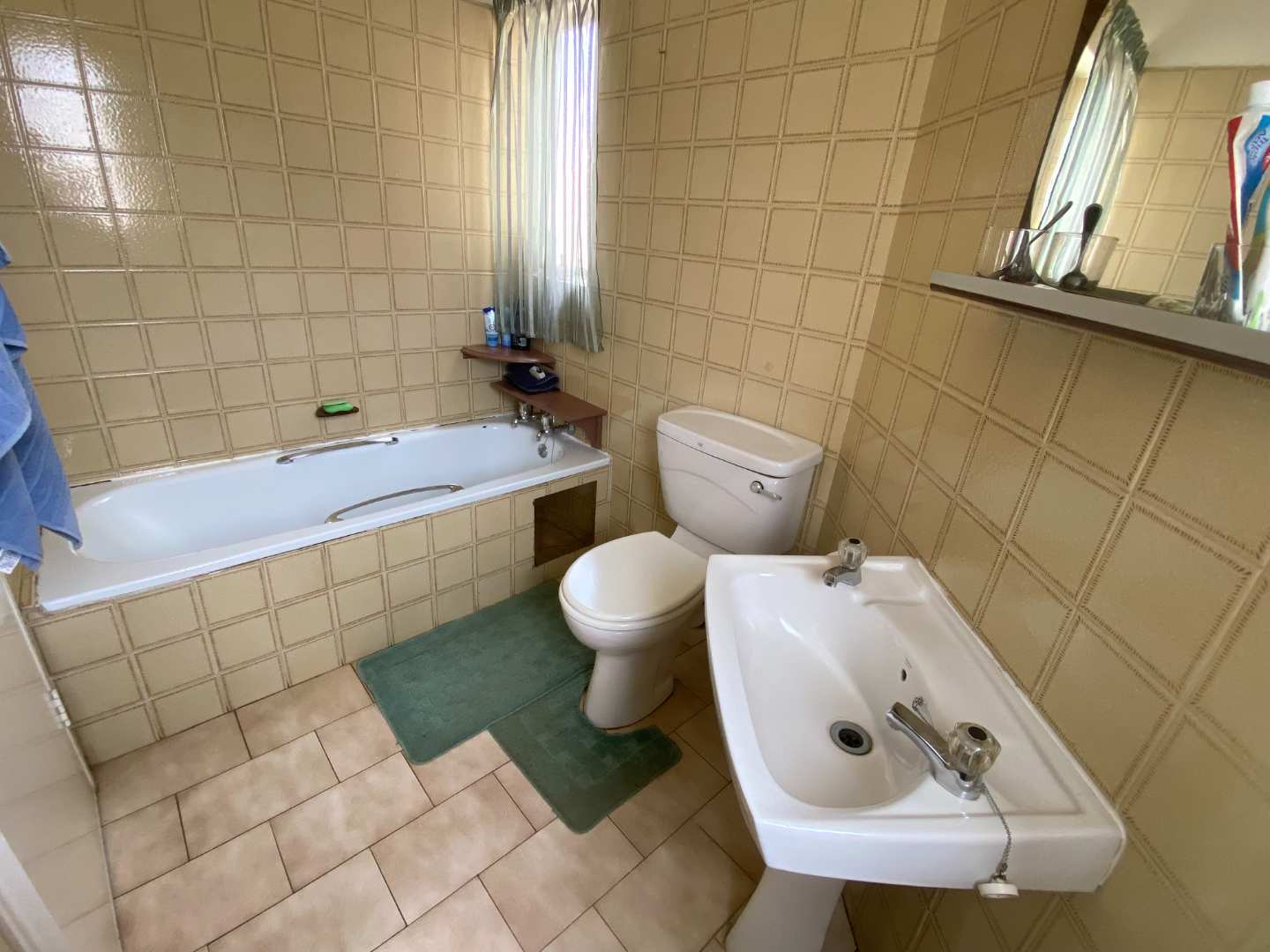The upper level offers three well-sized bedrooms with built-in cupboards, carpeted, with the 1st and 2nd bedrooms sharing a bathroom with a bath and basin, while the toilet is separate, providing added practicality for busy households. The bath is fitted with a shower attachment and curtain.