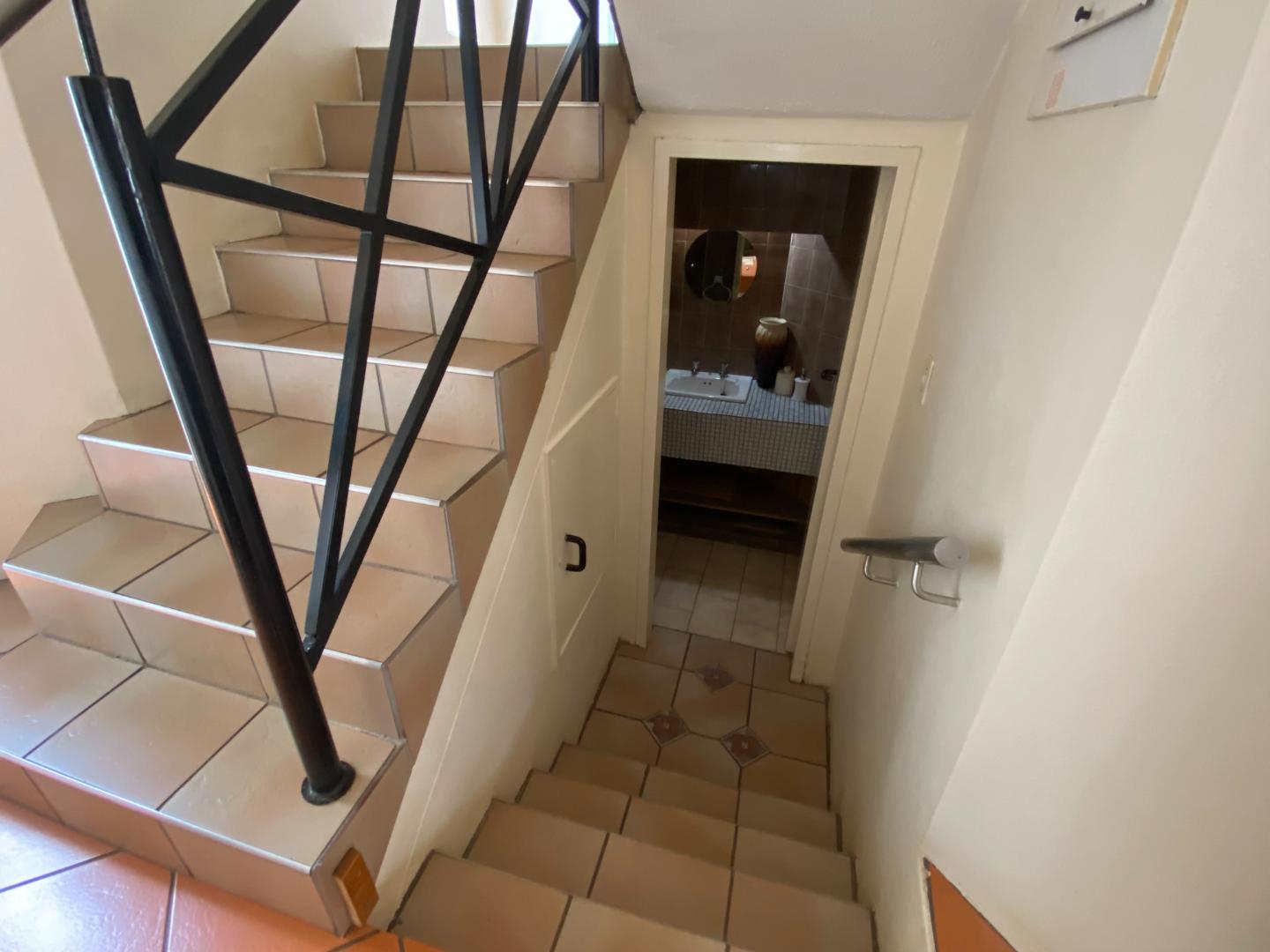 A guest toilet with a basin is conveniently located one level below the main living area.