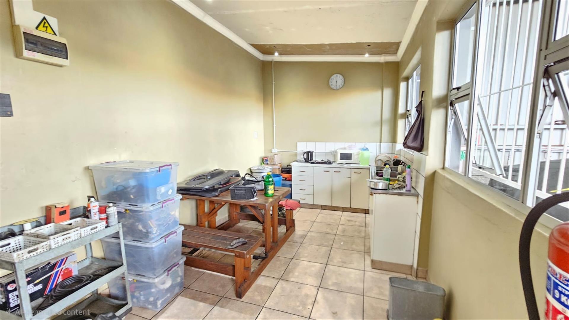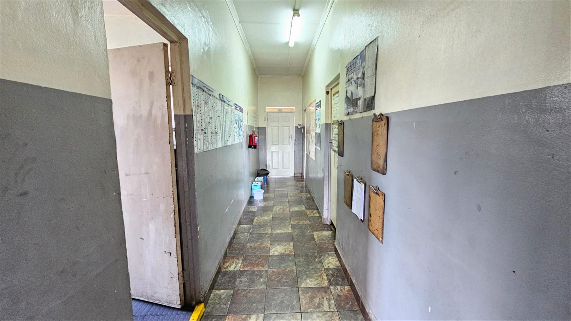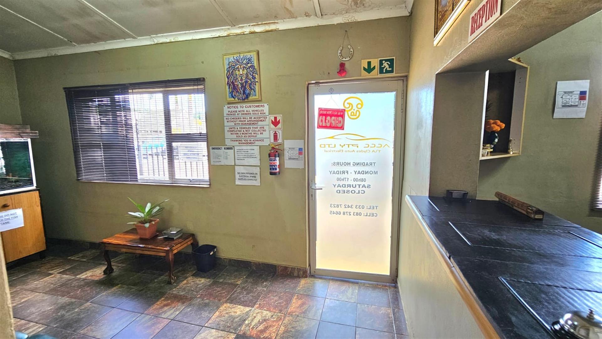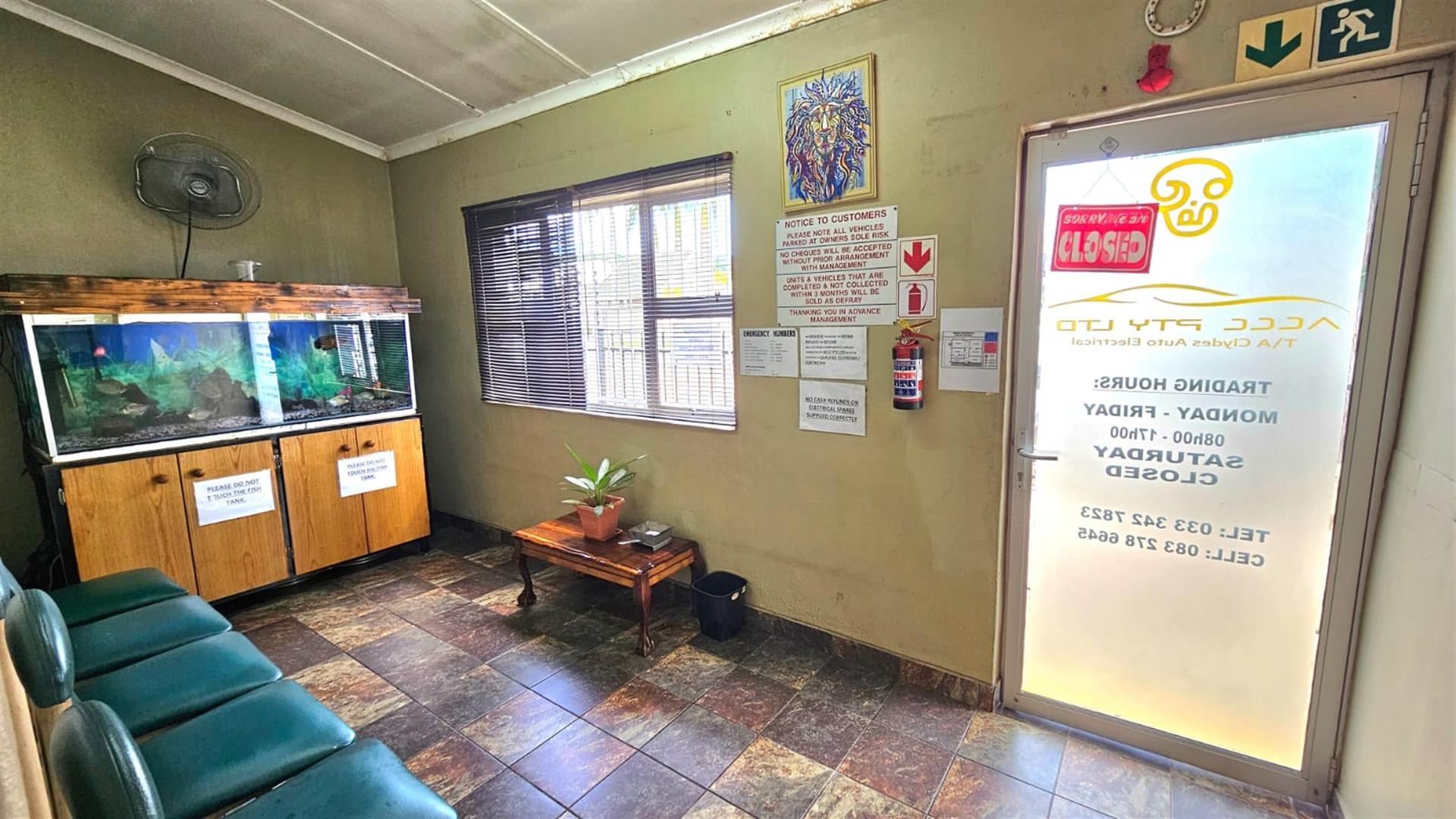 The front section of the building provides a practical business layout, including a reception or client waiting area, administrative space, storage and ablution facilities—ideal for day-to-day operations and customer interaction.