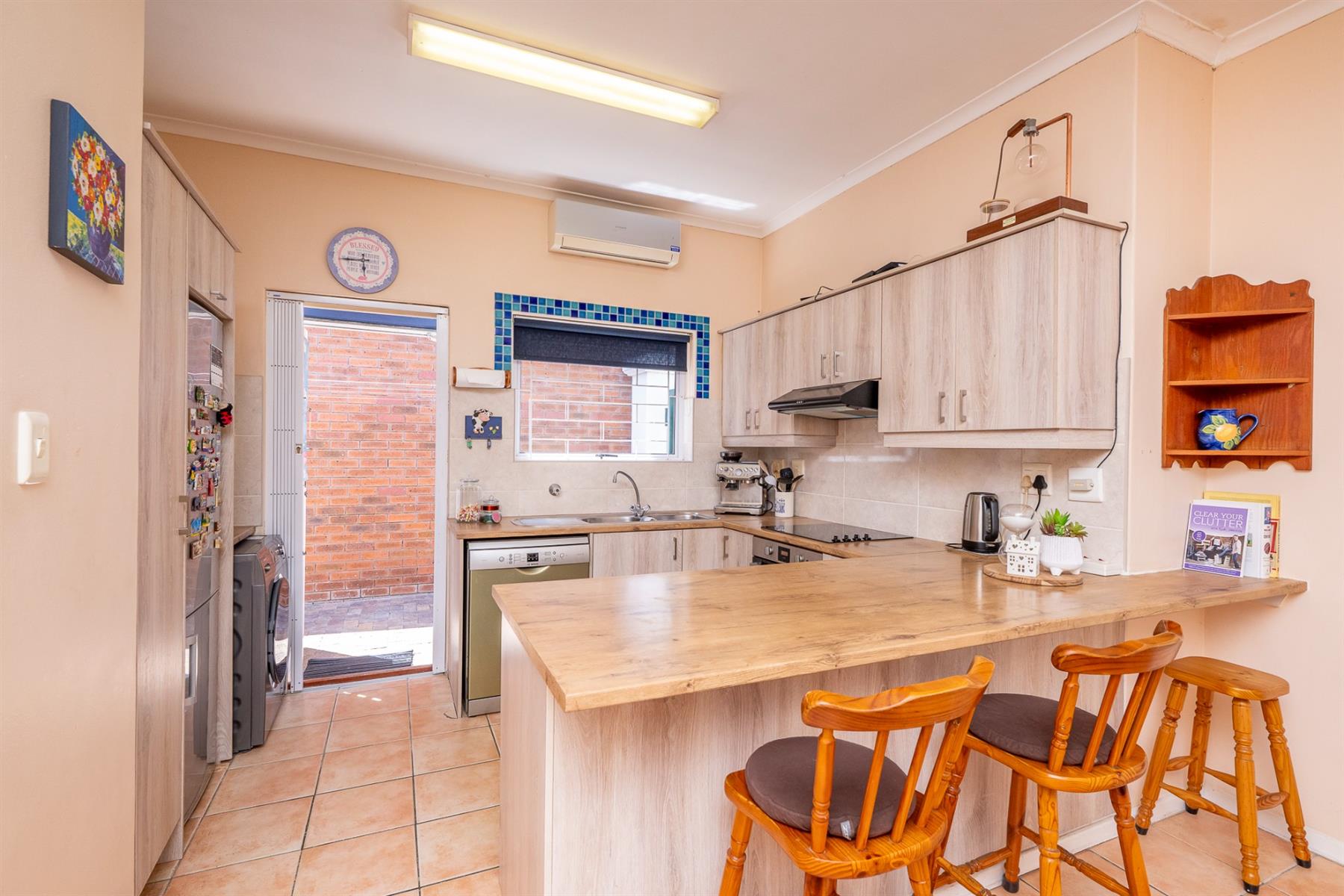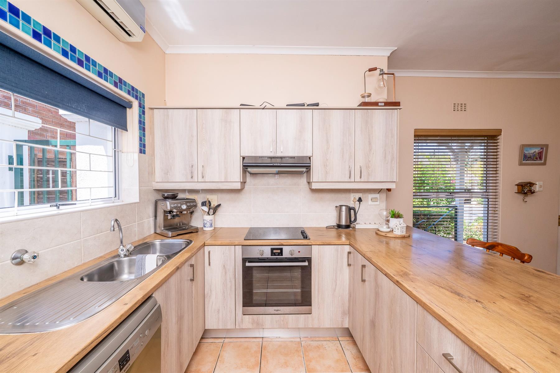 The modern kitchen is fitted with light-coloured built-in cupboards, wooden countertops, an electric stovetop, under-counter oven, extractor fan and plumbing points for a dishwasher and washing machine.