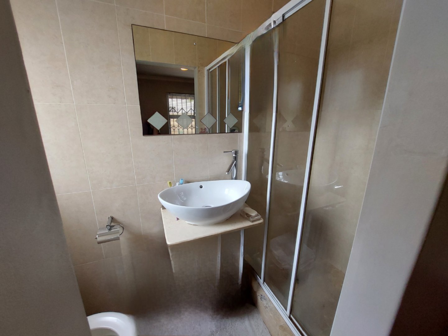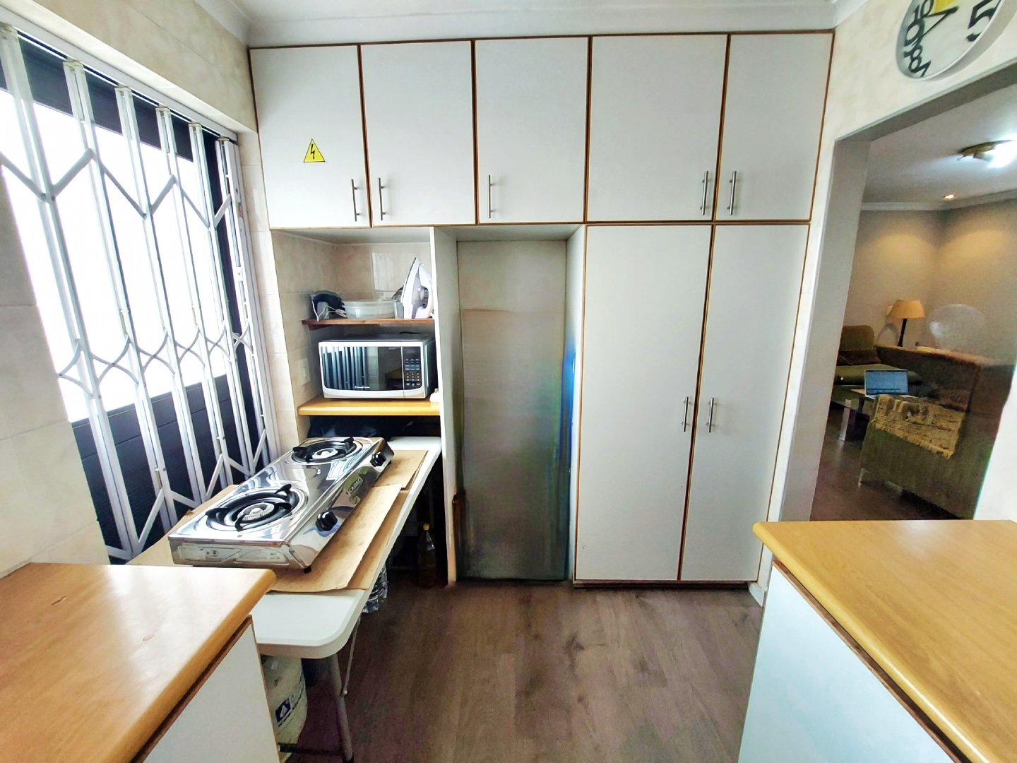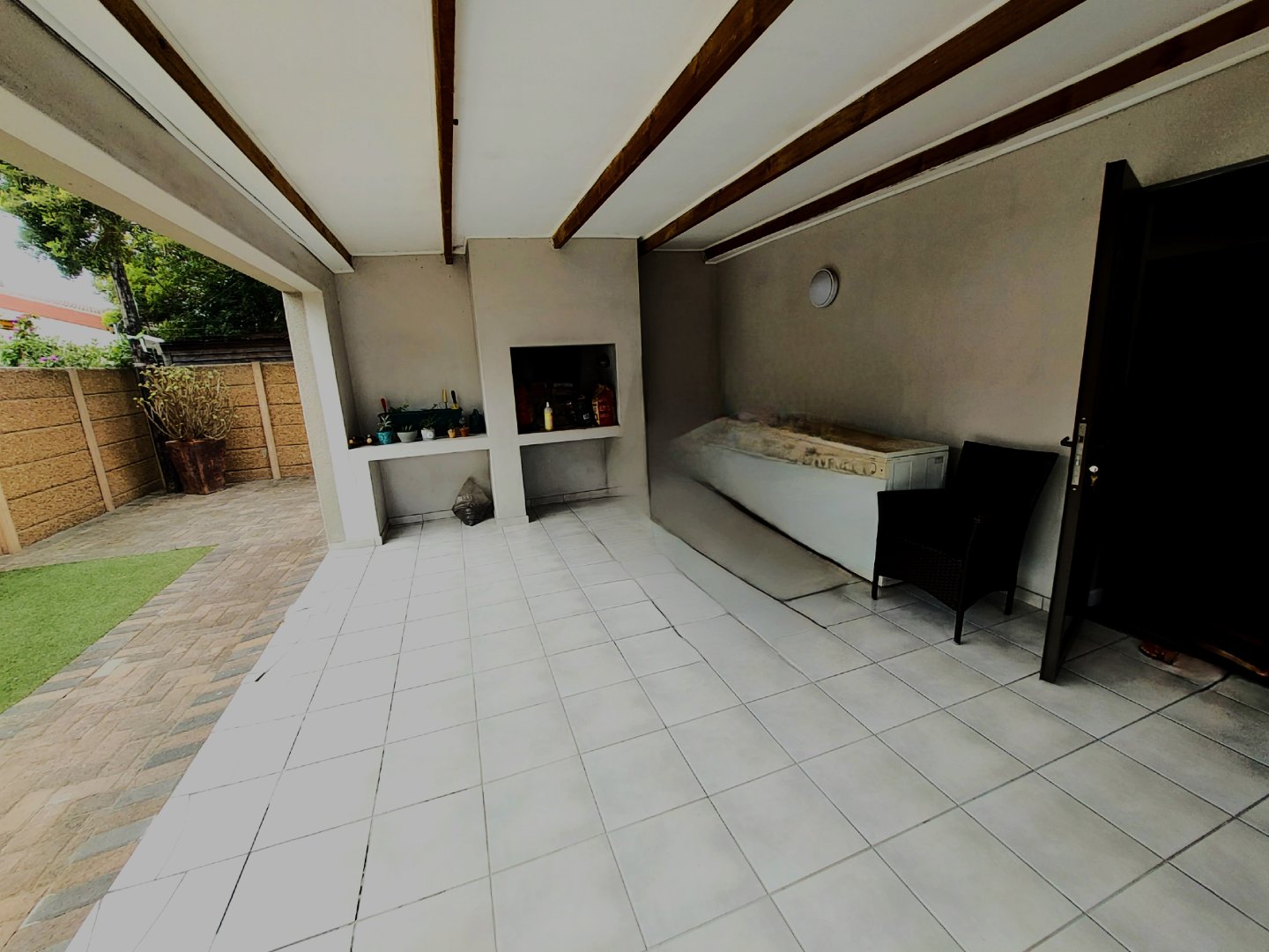 Inside, you will find laminated flooring and aluminum windows equipped with trellis burglar bars and blinds. There are separate lounge and dining areas that lead to a large, covered, tiled braai room. The welcoming kitchen offers ample storage, an under-counter hob, and designated spaces for a microwave and refrigerator. Although compact, the kitchen is designed to make cooking an enjoyable experience.