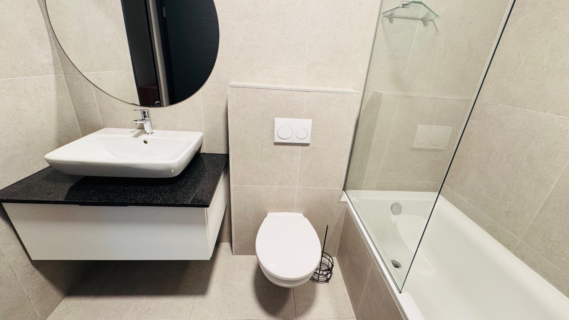 Thoughtful, modern finishes: neutral palettes, porcelain tiling, energy-efficient lighting.