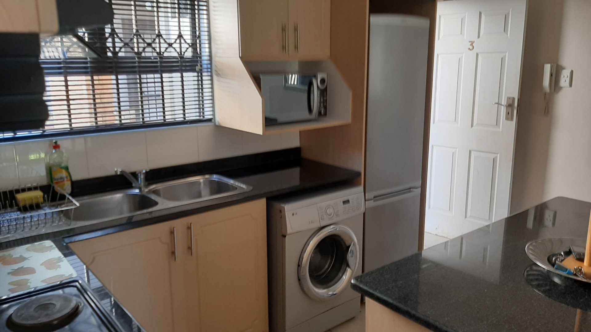 The flat boasts 2 bedrooms with built in cupboards , fully fitted kitchen , living area that opens out to the garden