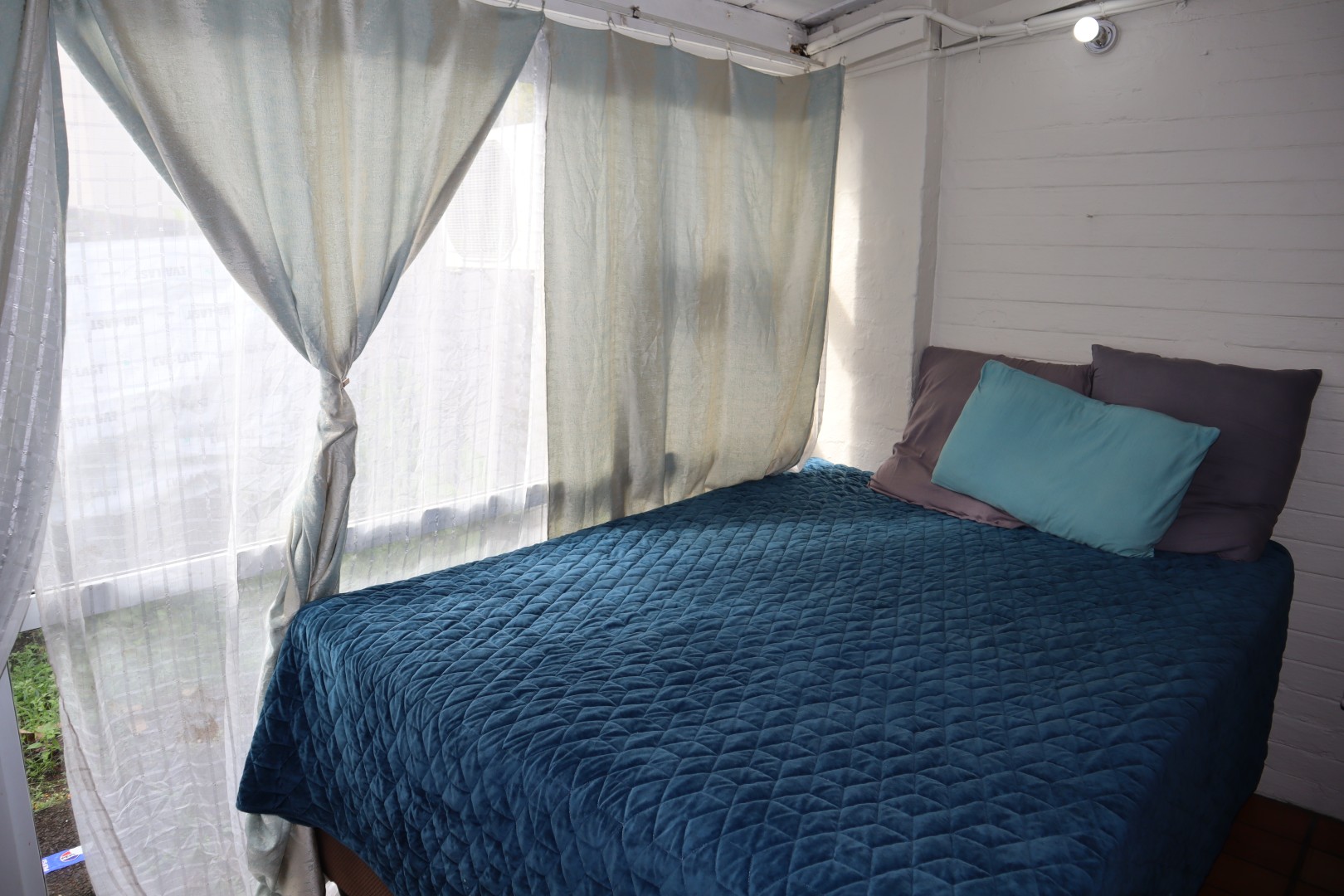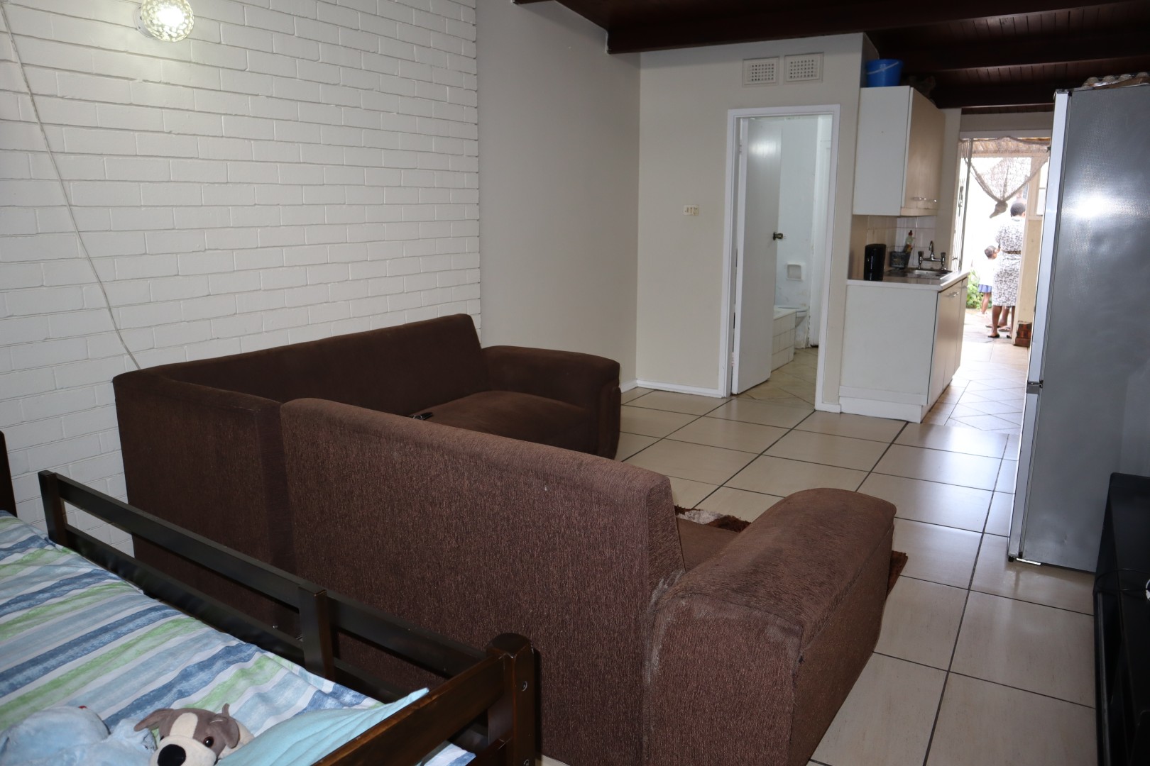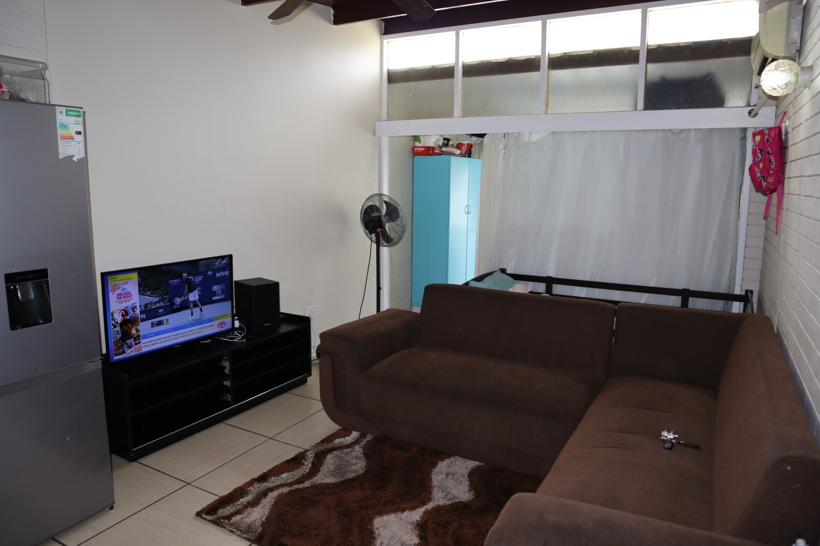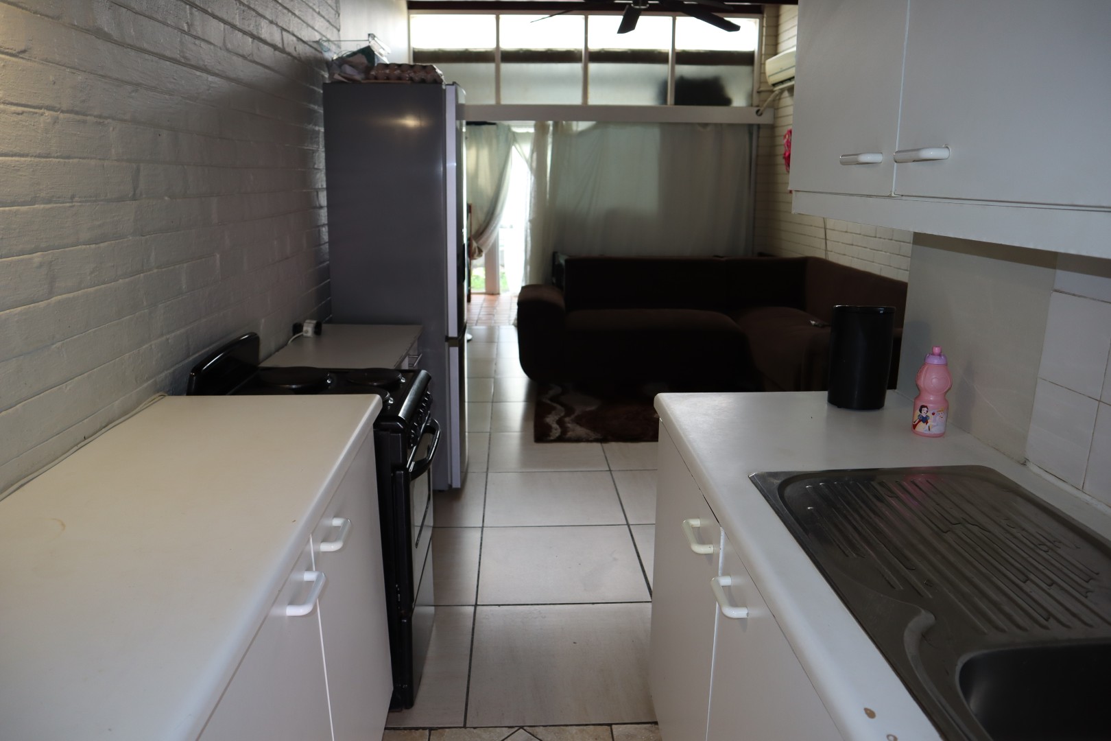 This fully tiled studio apartment townhouse offers an open plan kitchen with plumbing for a washing machine, lounge and bedroom area which leads out to a small private garden area.