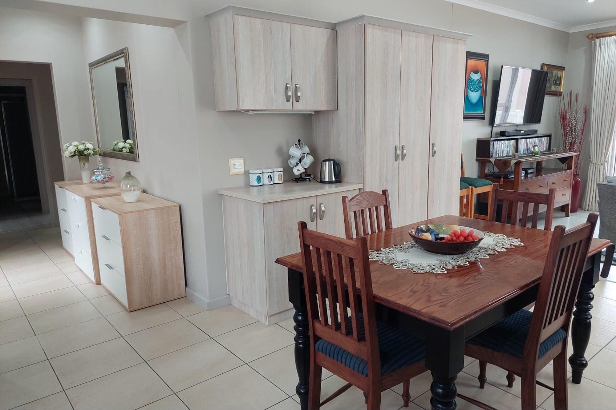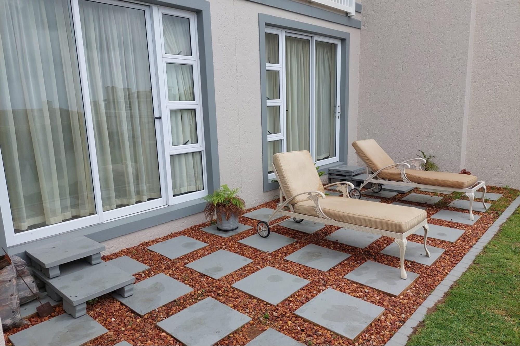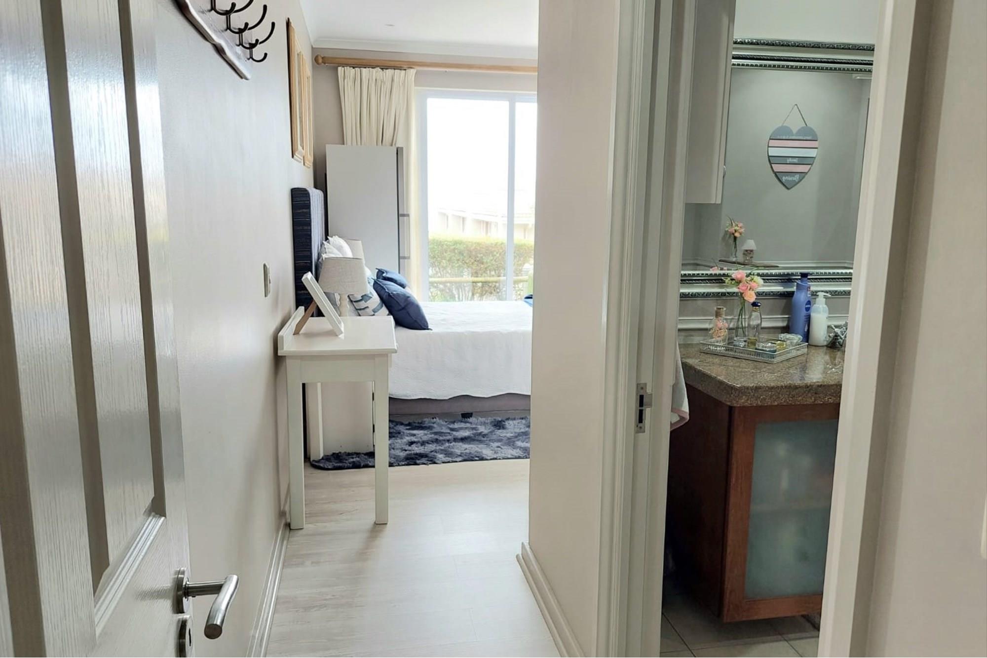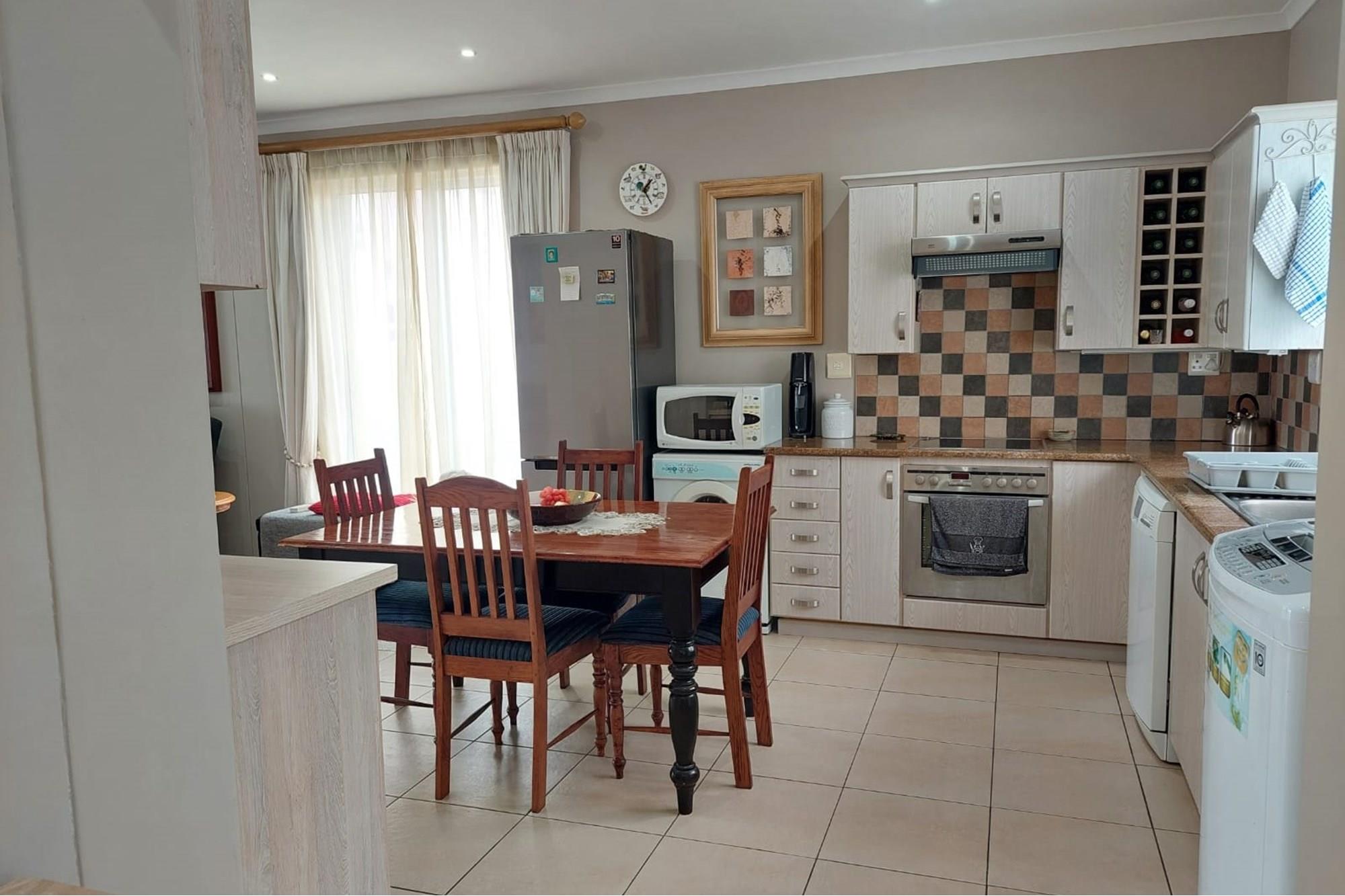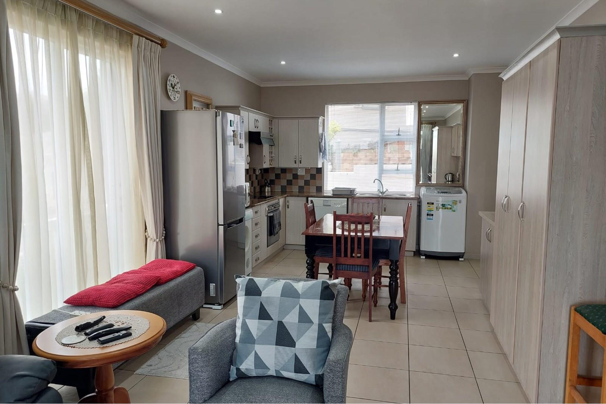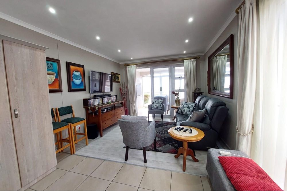 The open-plan dining room and lounge are bathed in natural light, seamlessly connecting to a braai room with a built-in braai and expansive glass doors that can be closed for an intimate indoor braai experience. Exiting the braai room, you`ll discover an open patio, ensuring complete privacy without any walk-throughs, an idyllic area for relaxation. A most enjoyable feature is the communal garden that one has access to, fostering a feeling of space. Small pets are warmly welcomed while on a leash, adding to the cozy and welcoming atmosphere.