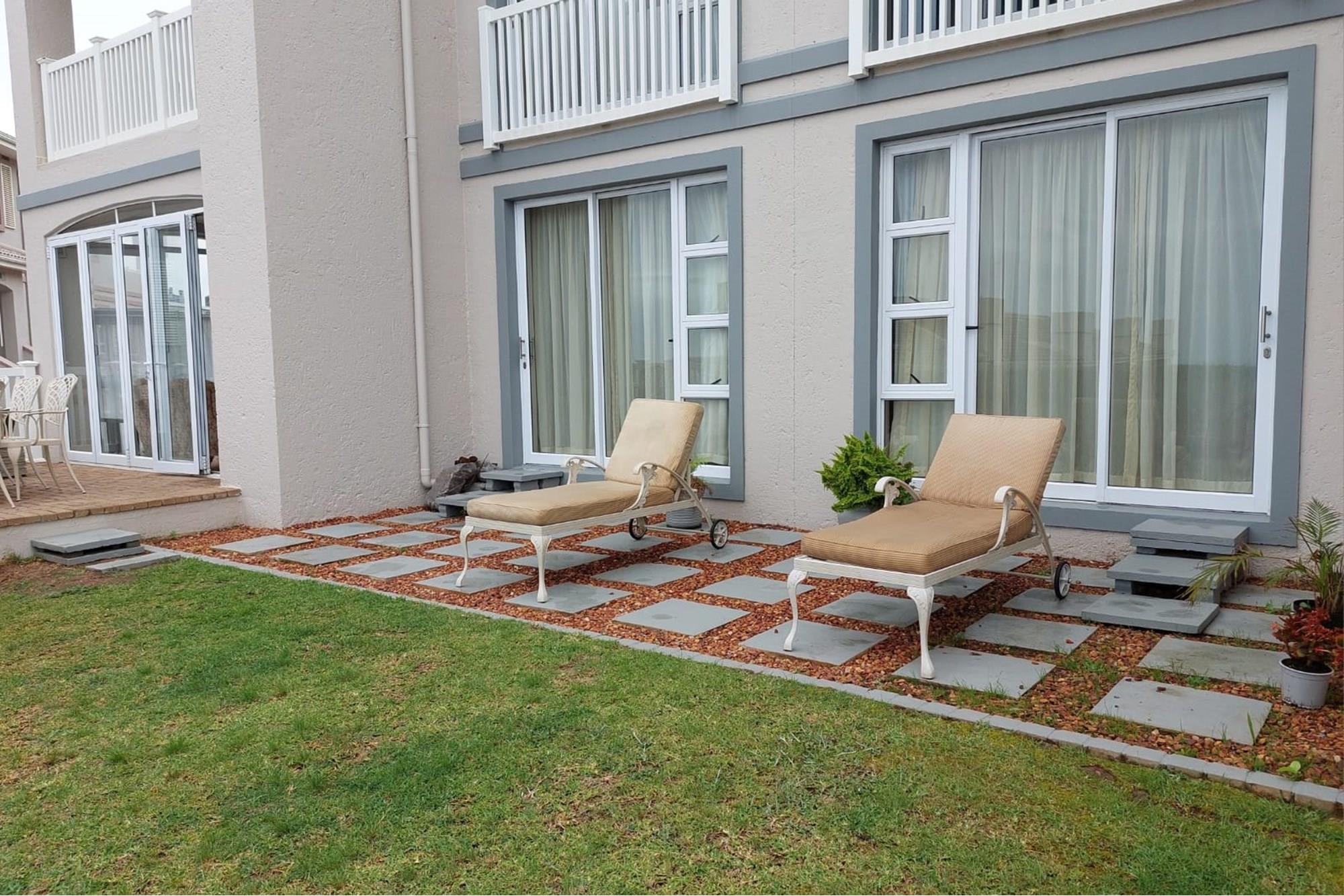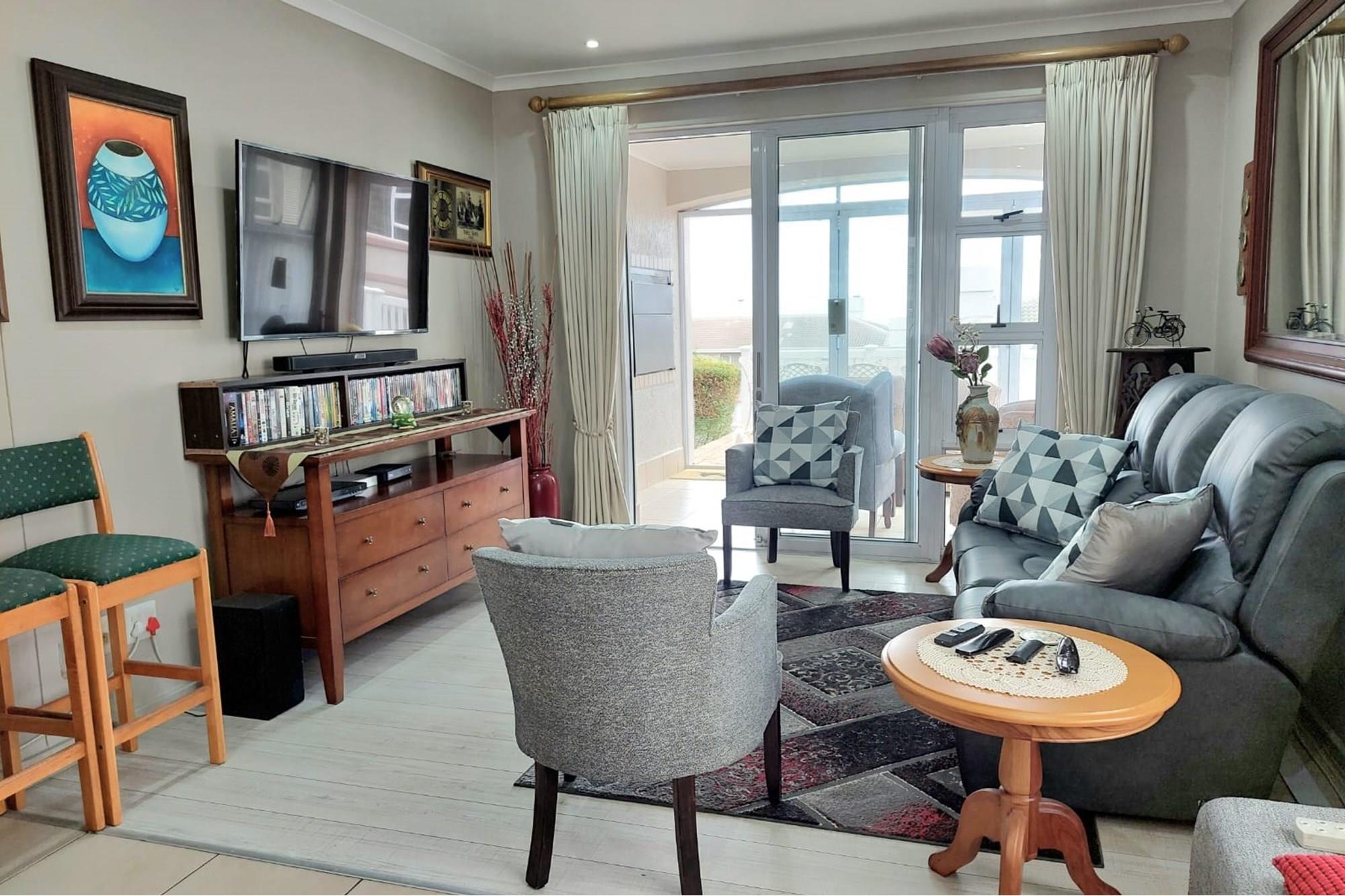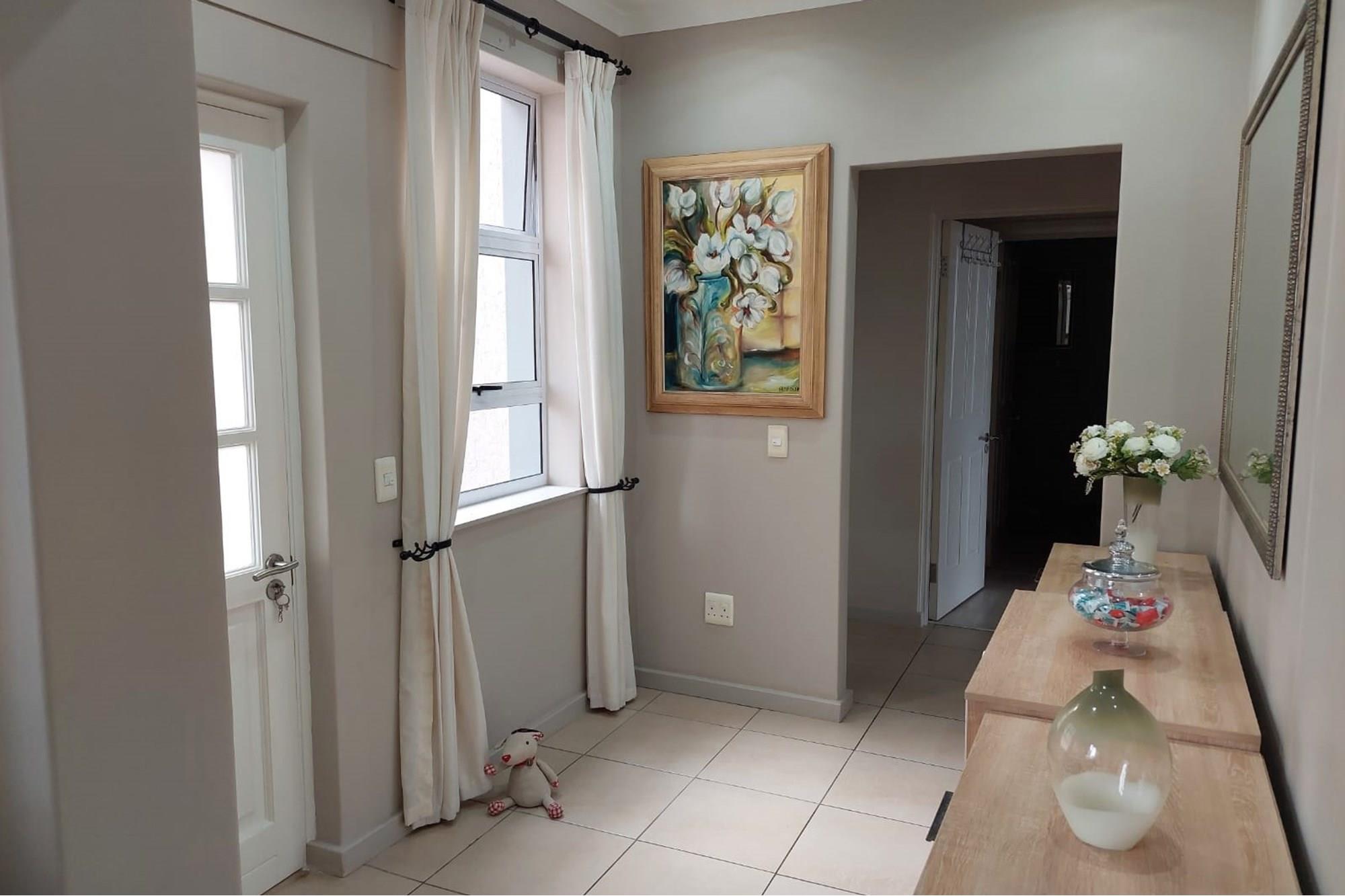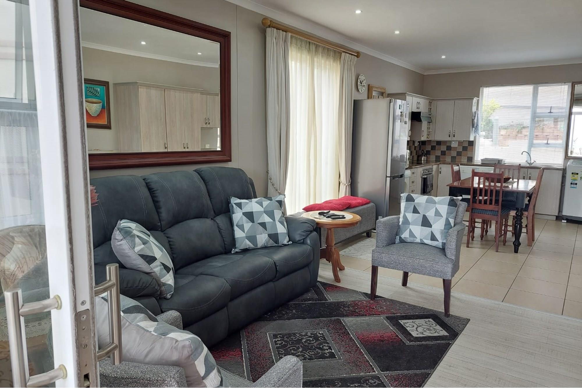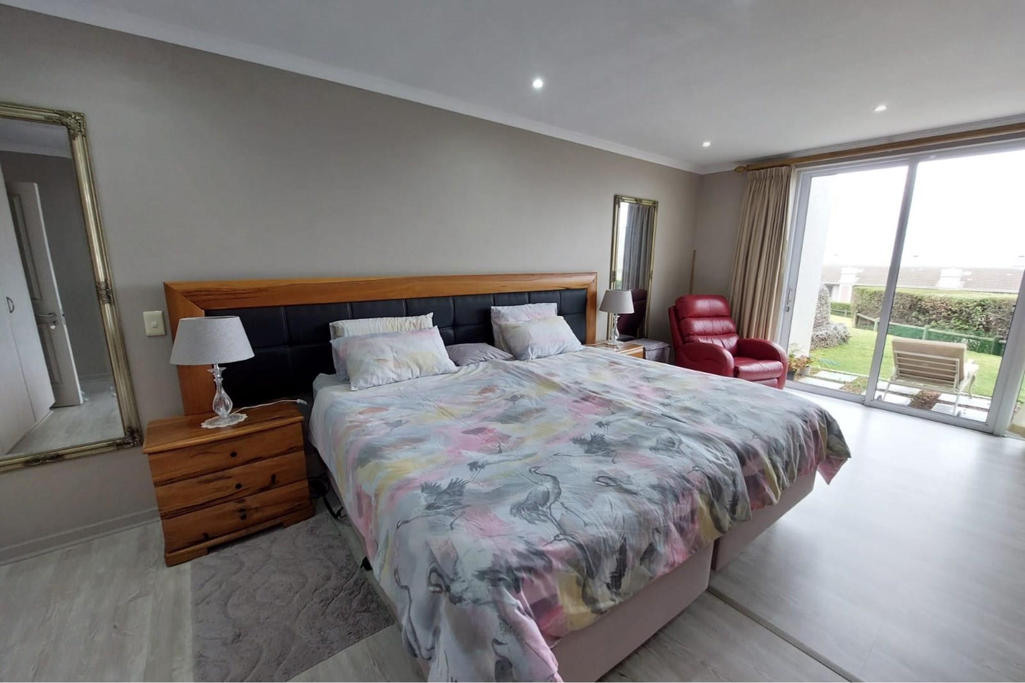 The open-plan dining room and lounge are bathed in natural light, seamlessly connecting to a braai room with a built-in braai and expansive glass doors that can be closed for an intimate indoor braai experience. Exiting the braai room, you`ll discover an open patio, ensuring complete privacy without any walk-throughs, an idyllic area for relaxation. A most enjoyable feature is the communal garden that one has access to, fostering a feeling of space. Small pets are warmly welcomed while on a leash, adding to the cozy and welcoming atmosphere.