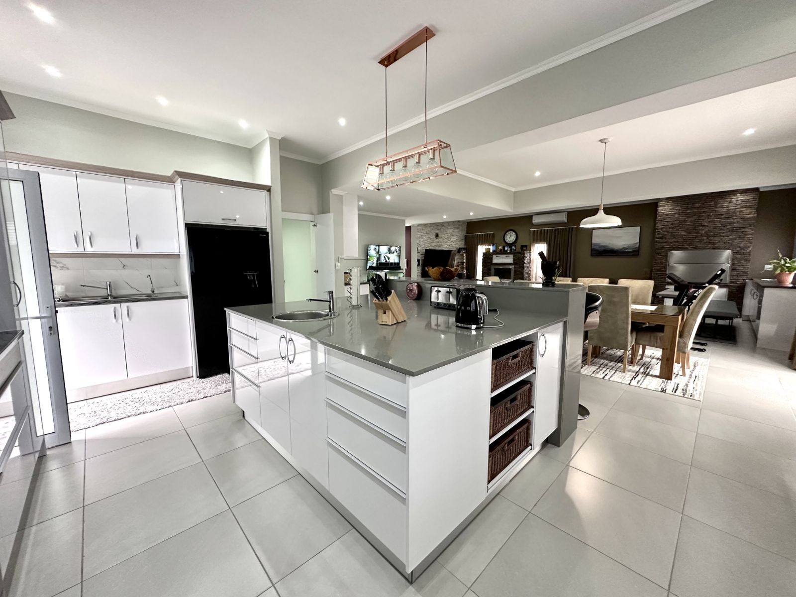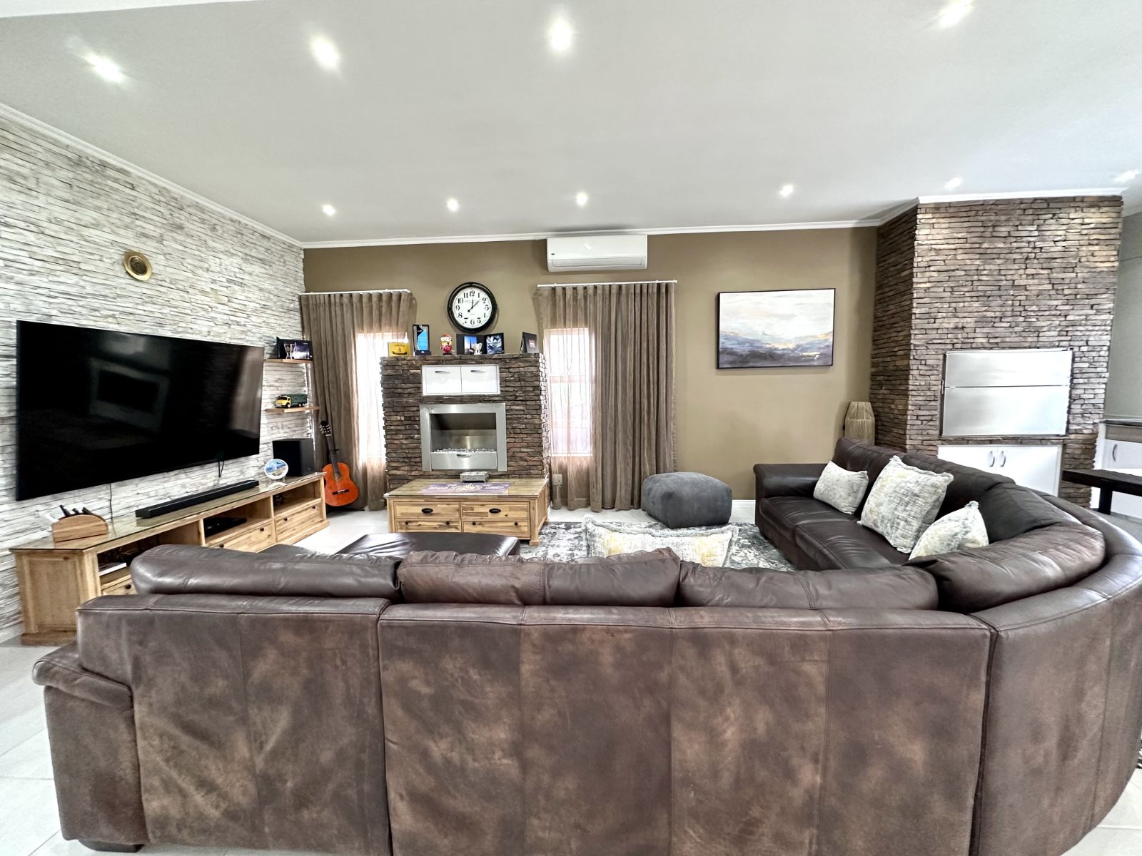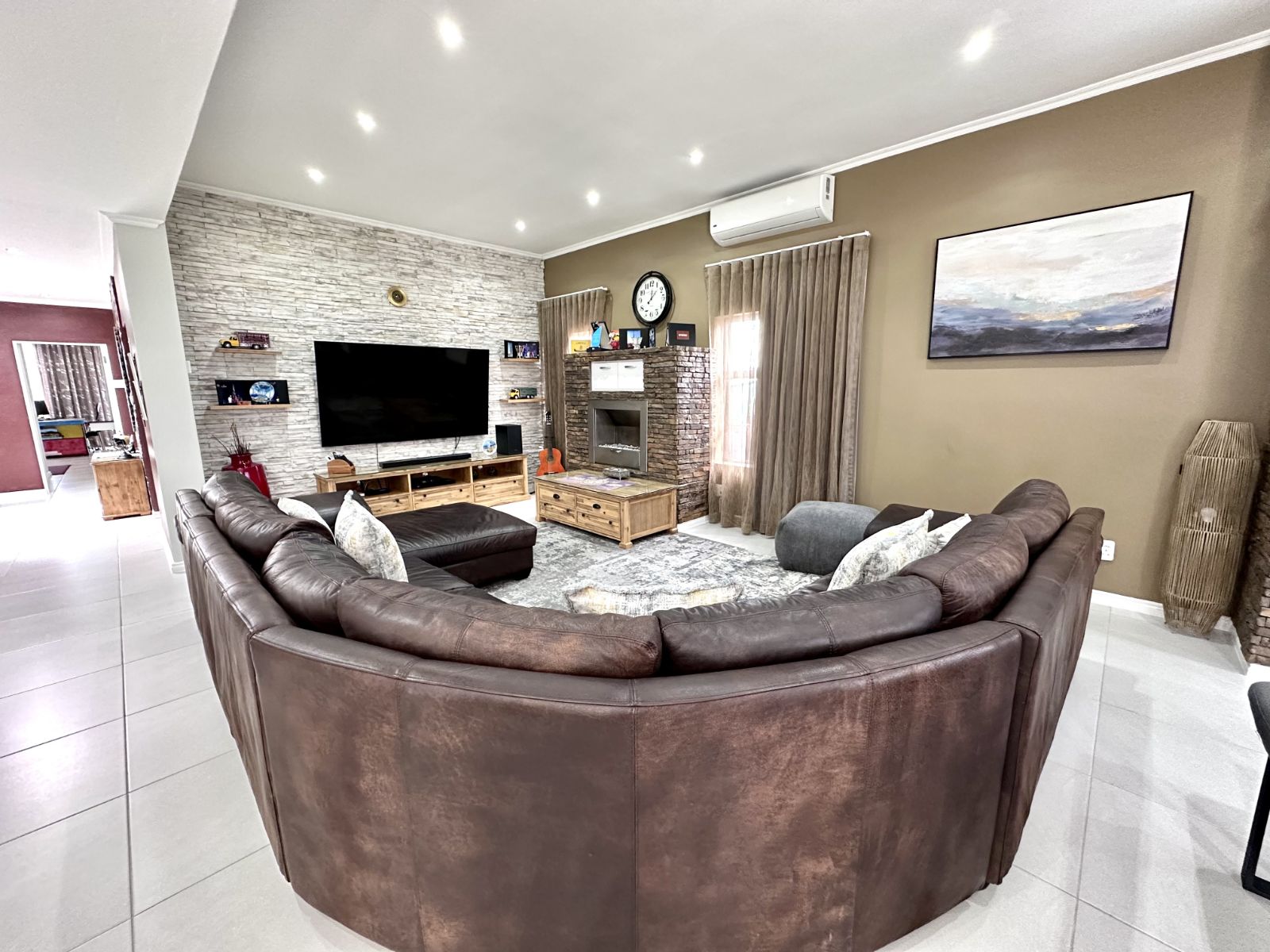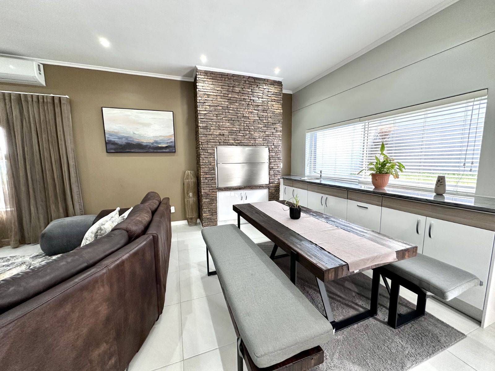 Ascend the grand staircase with beautifully clad walls, and let the natural light from the skylight illuminate the first floor. The heart of this home is the expansive kitchen, featuring a large central island and a walk-in pantry. This open-plan kitchen flows seamlessly into the living room and two dining areas. The formal dining area offers an elegant setting, while the second dining area includes a built-in braai for those perfect evenings of entertaining. The spacious living area is complete with a cozy fireplace and air-conditioning for year-round comfort.