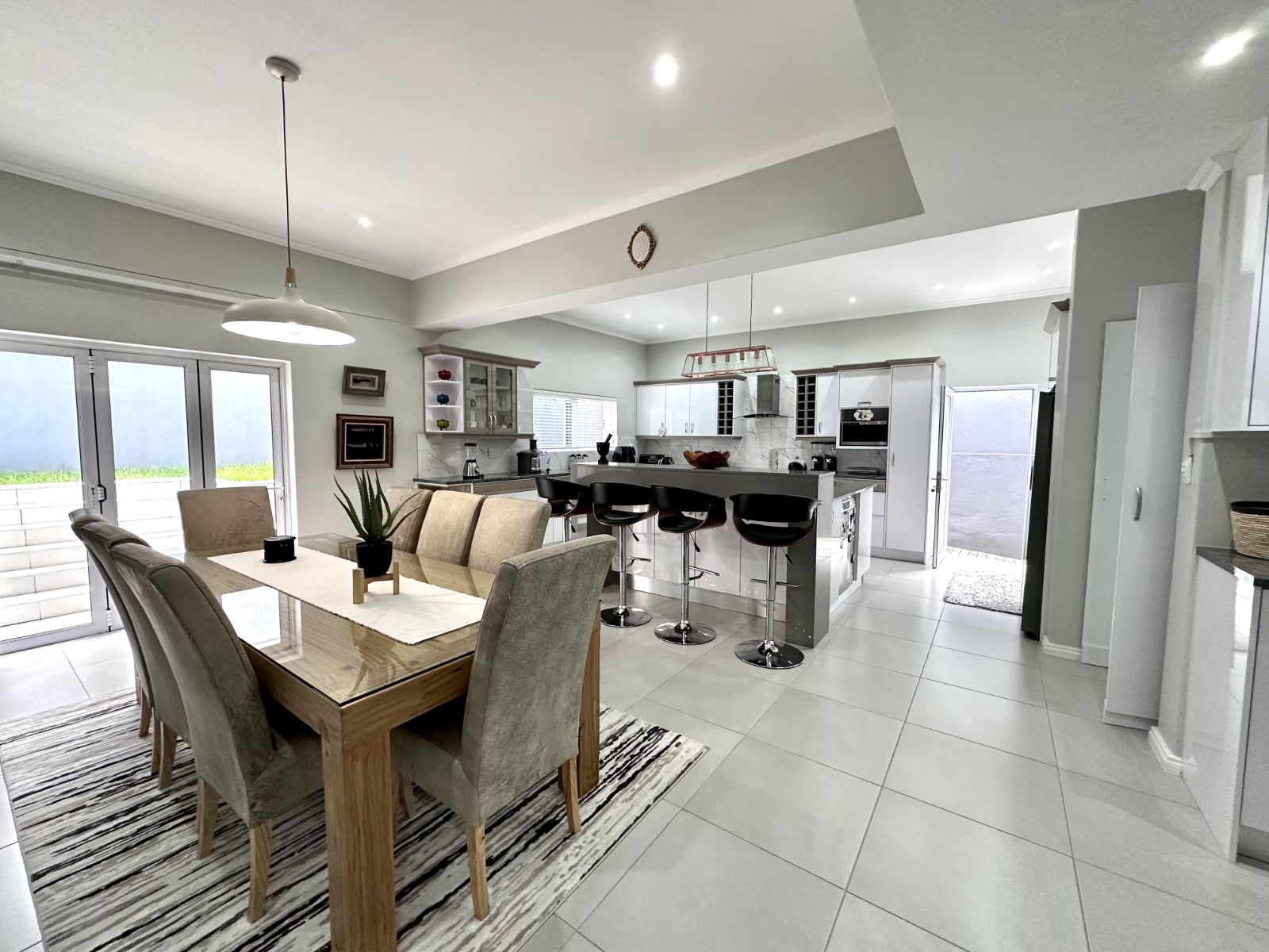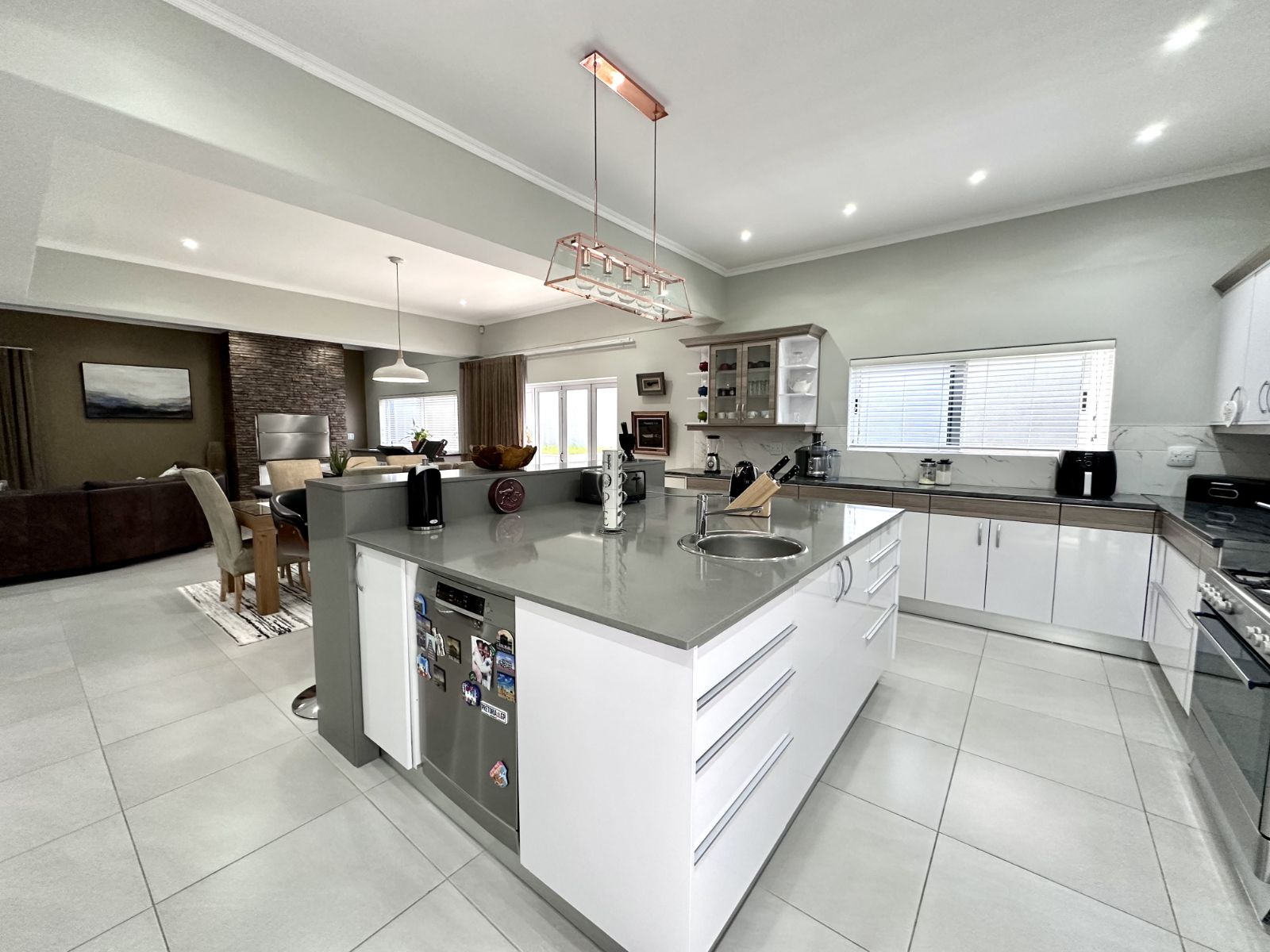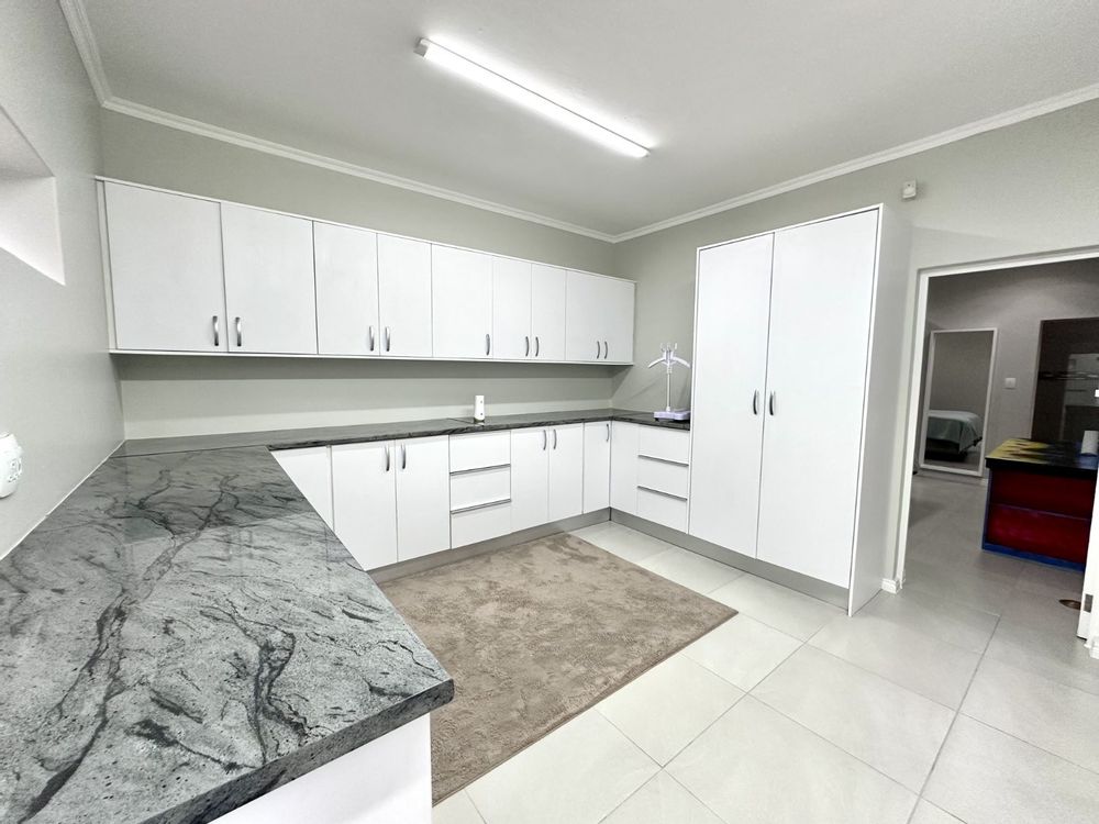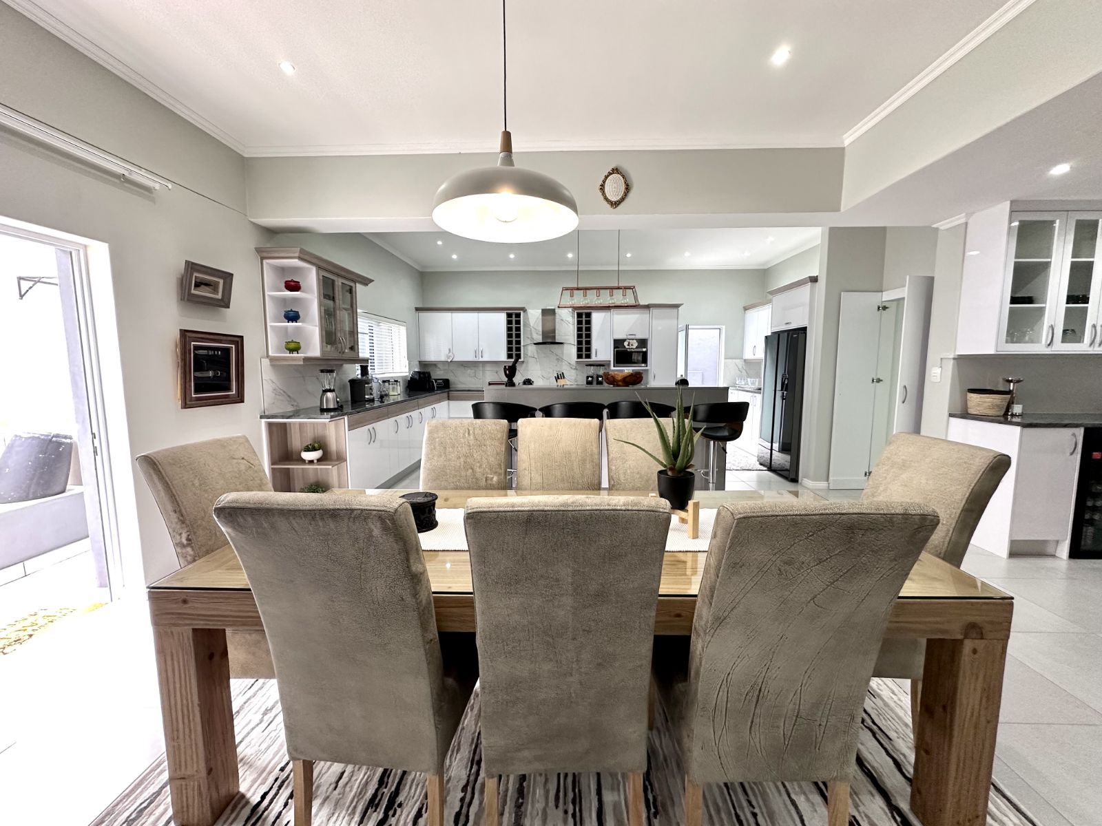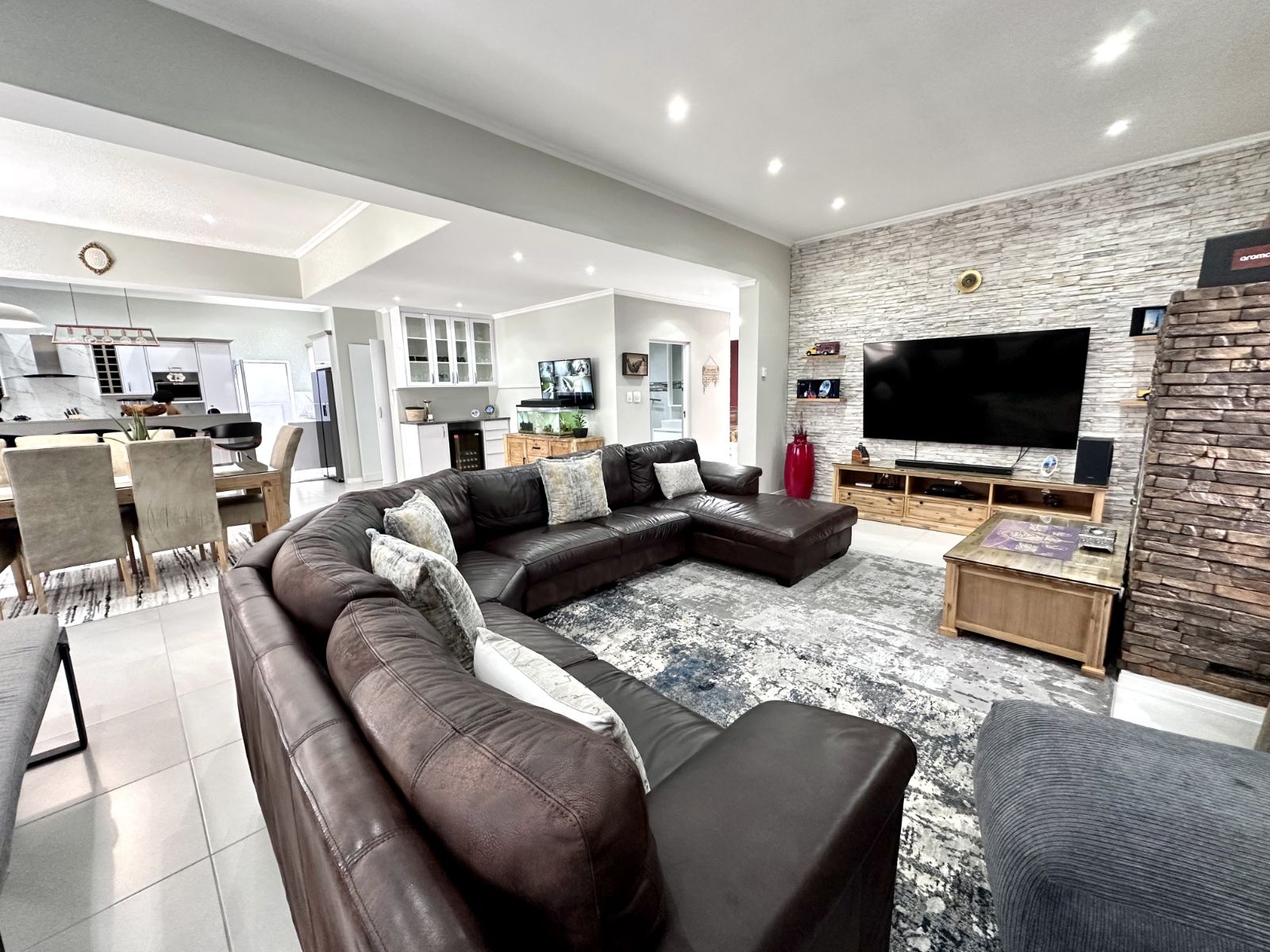 Ascend the grand staircase with beautifully clad walls, and let the natural light from the skylight illuminate the first floor. The heart of this home is the expansive kitchen, featuring a large central island and a walk-in pantry. This open-plan kitchen flows seamlessly into the living room and two dining areas. The formal dining area offers an elegant setting, while the second dining area includes a built-in braai for those perfect evenings of entertaining. The spacious living area is complete with a cozy fireplace and air-conditioning for year-round comfort.