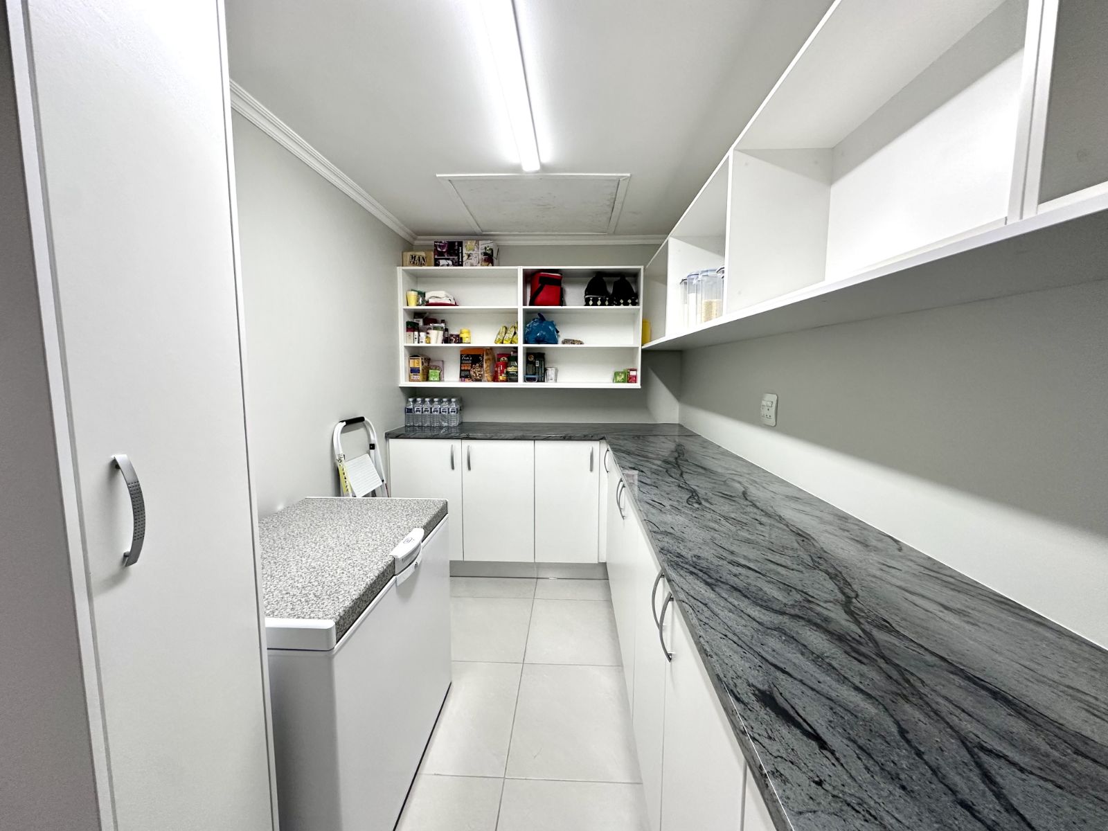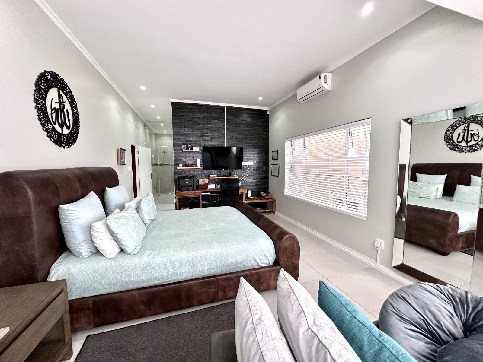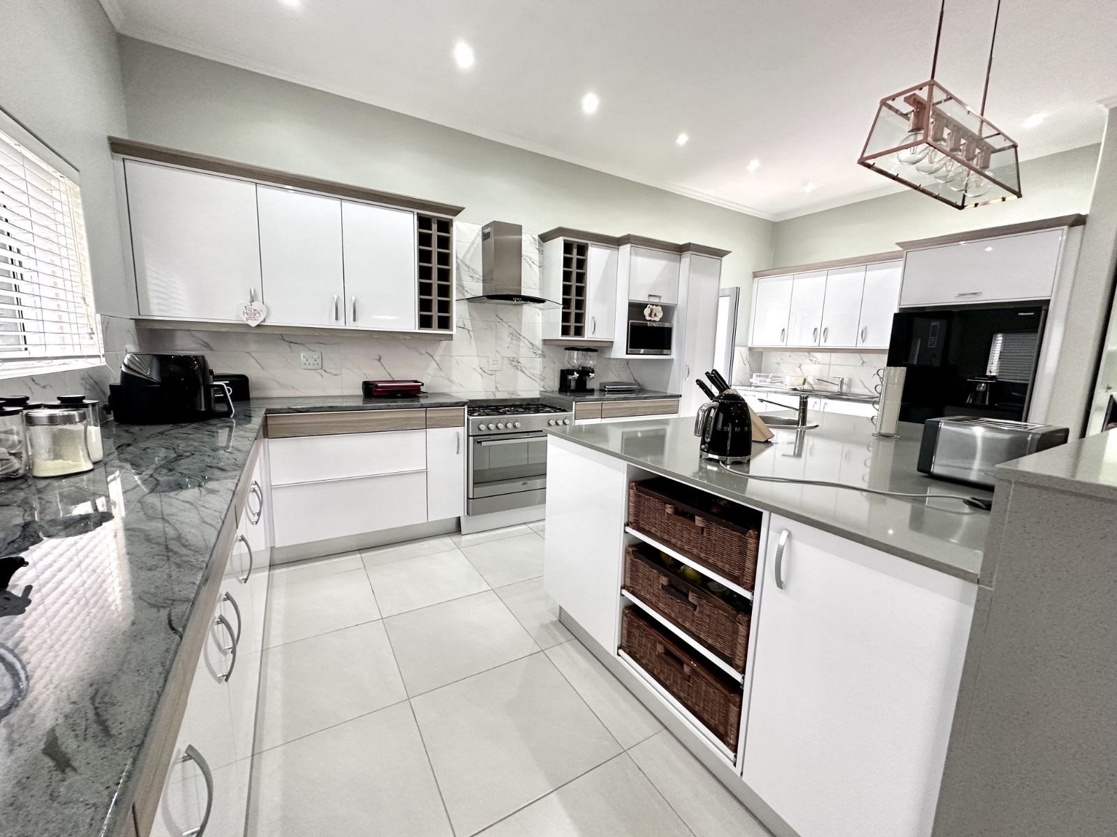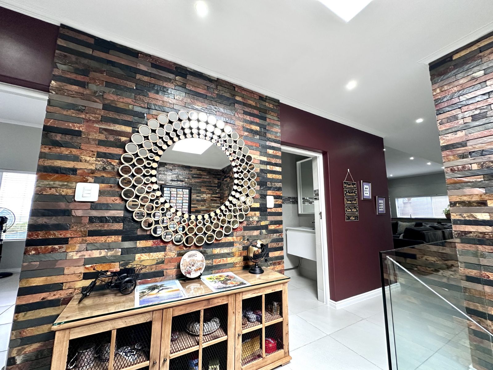 Ascend the grand staircase with beautifully clad walls, and let the natural light from the skylight illuminate the first floor. The heart of this home is the expansive kitchen, featuring a large central island and a walk-in pantry. This open-plan kitchen flows seamlessly into the living room and two dining areas. The formal dining area offers an elegant setting, while the second dining area includes a built-in braai for those perfect evenings of entertaining. The spacious living area is complete with a cozy fireplace and air-conditioning for year-round comfort.