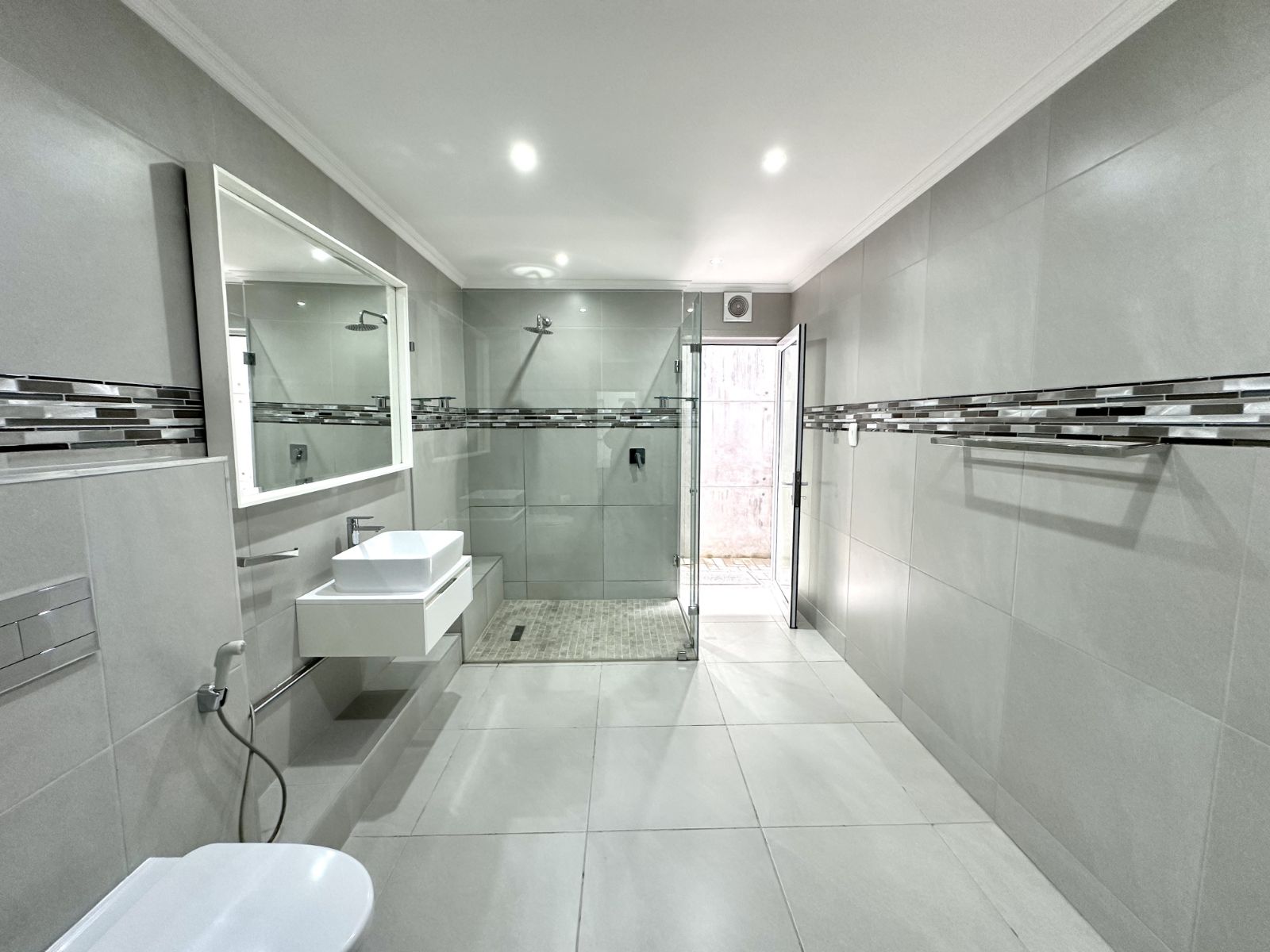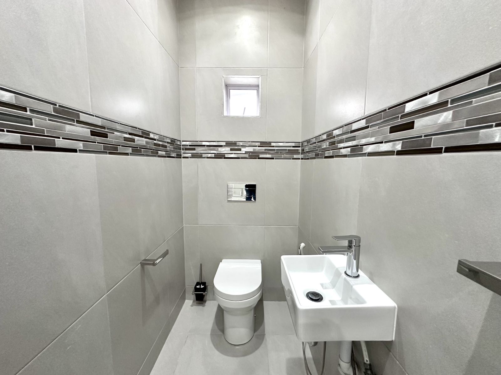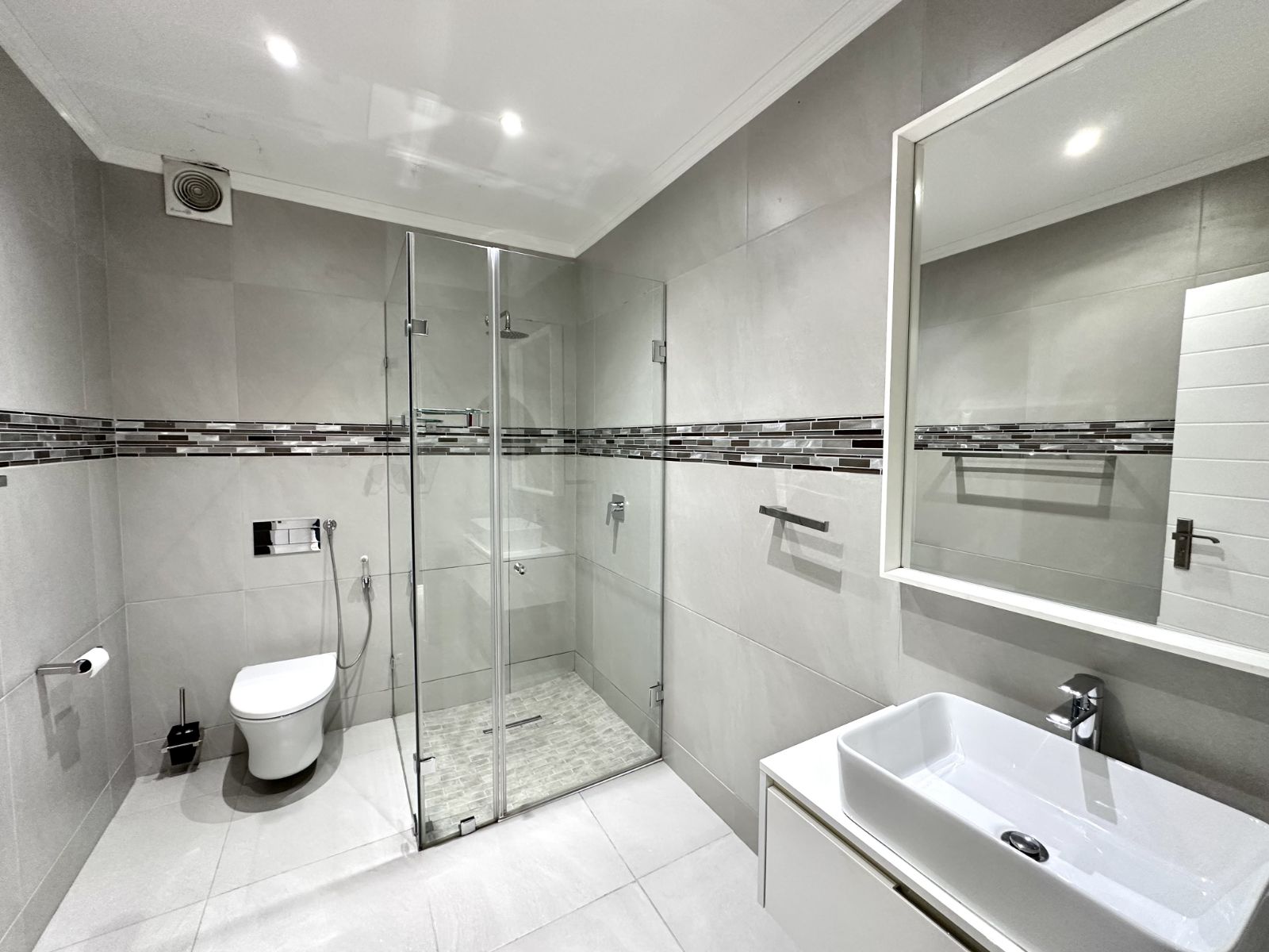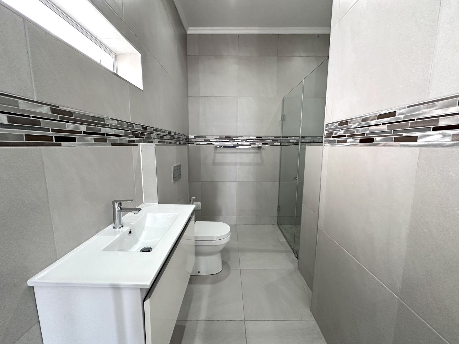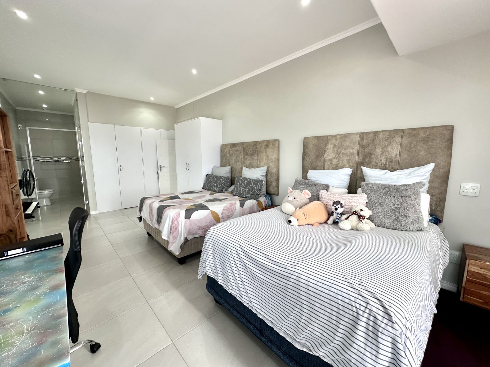 Upstairs, you'll find three spacious bedrooms. The master bedroom is a true retreat with ample space, air-conditioning, and a walk-in closet, as well as a luxurious en suite full bathroom. The second bedroom is equally spacious, complete with a walk-in closet. The third bedroom offers built-in cupboards and an en suite bathroom with a shower, basin, and toilet. On the first level, there are also two additional bathrooms, one of which features a shower, toilet, and basin, while the other serves as a guest bathroom.