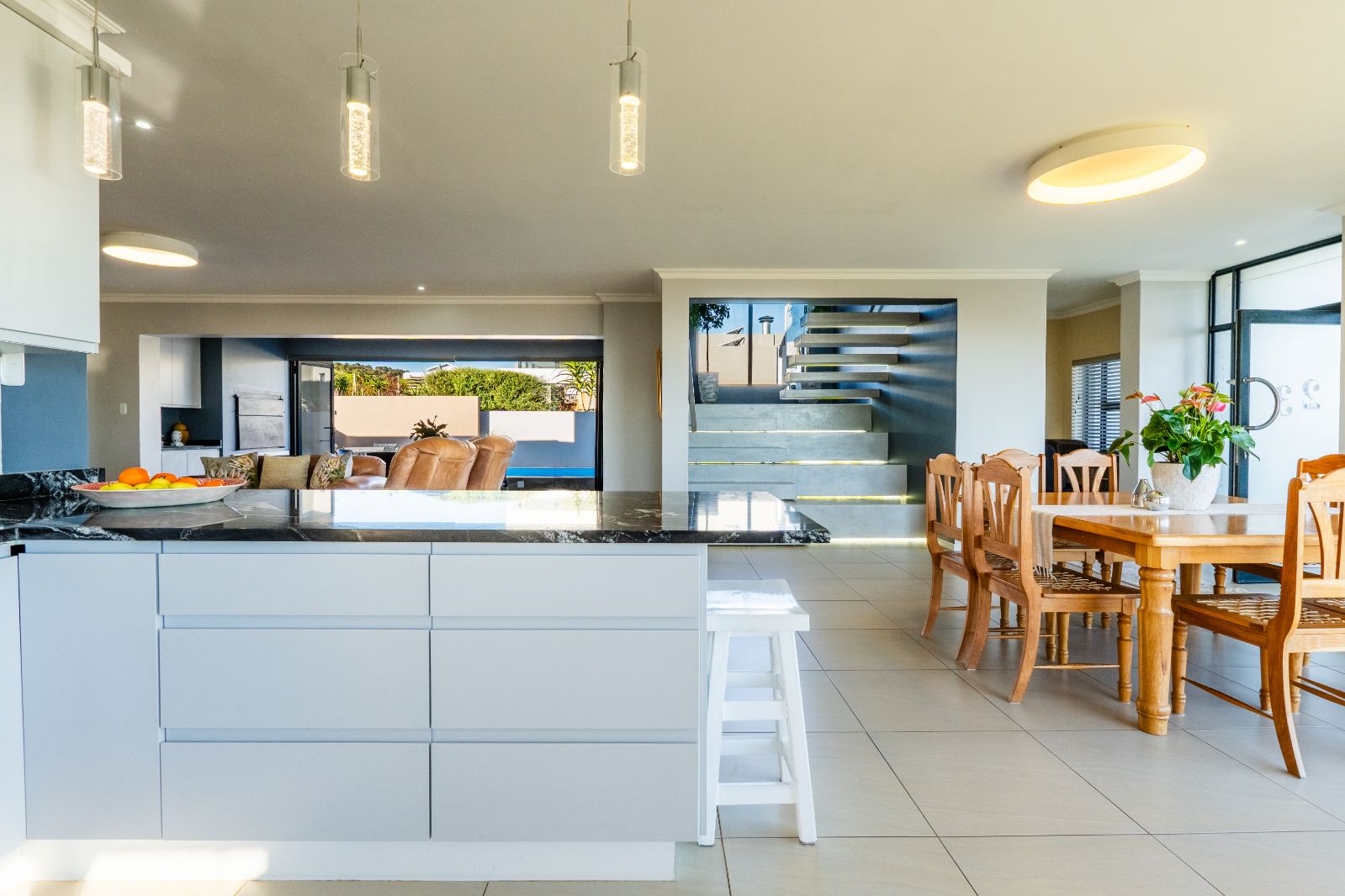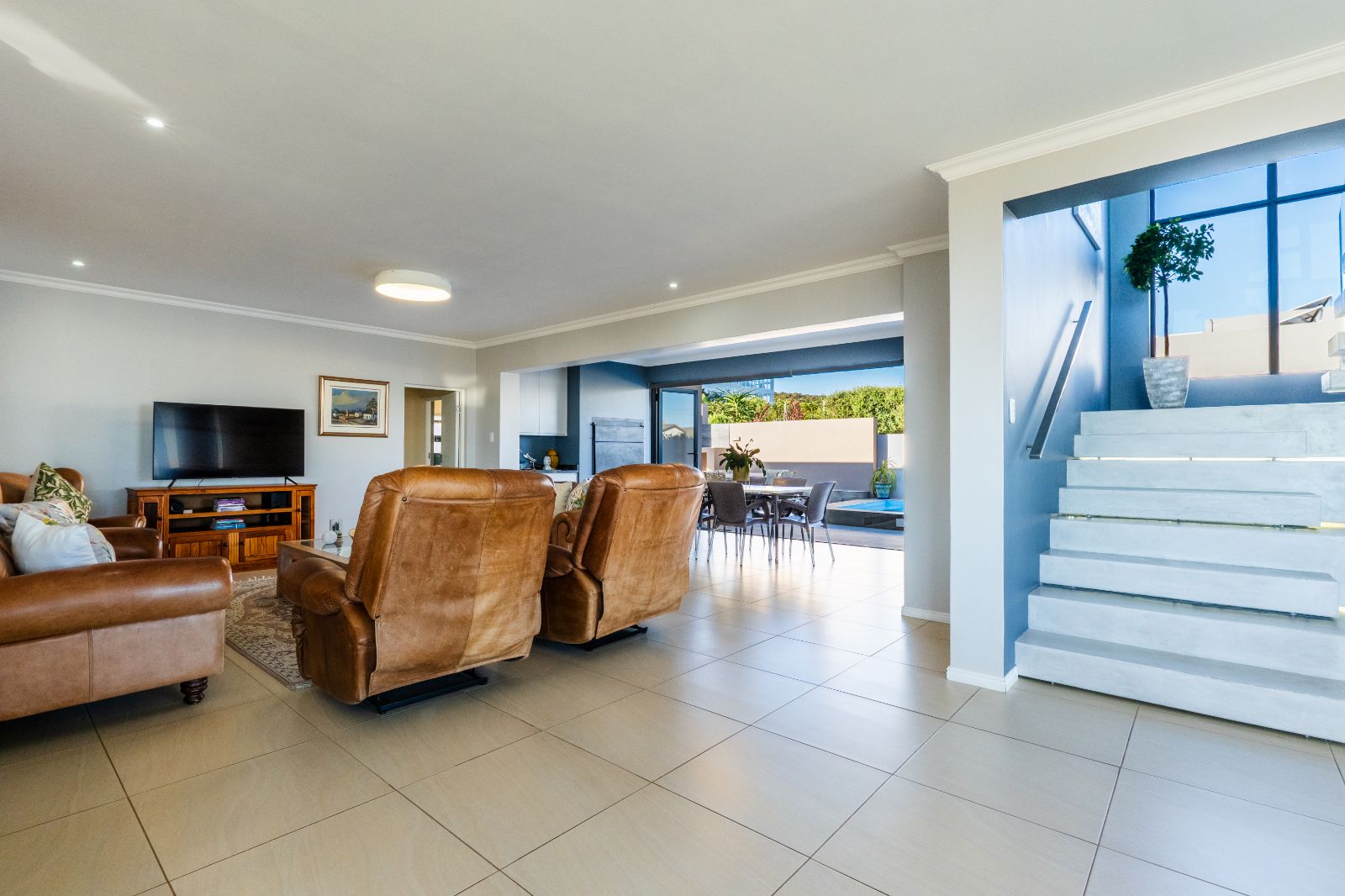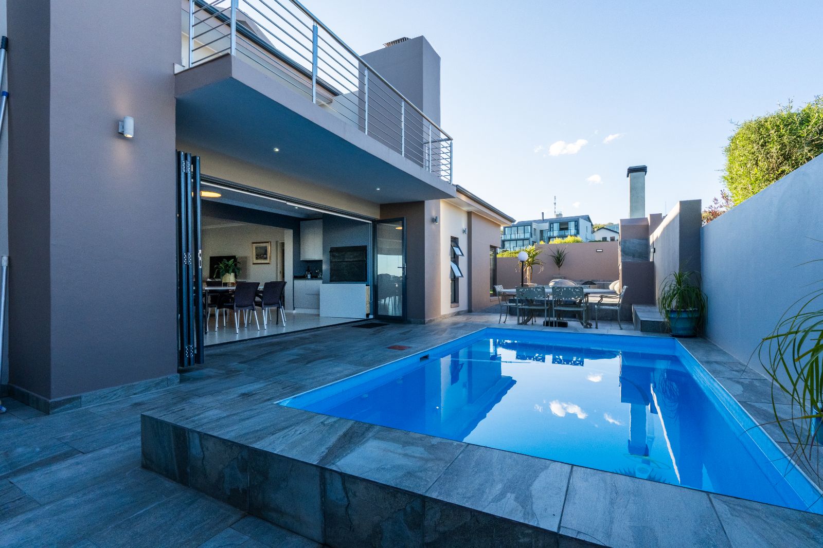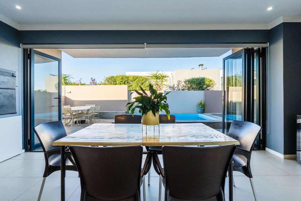 The home has been recently upgraded and now features an extended, pet-friendly outdoor entertainment area that enhances both comfort and style. The ground floor welcomes you with an open-plan design, including a modern kitchen, dining area, lounge, and indoor braai room. Large stacker doors open seamlessly onto the sunny pool patio, creating the perfect flow between indoor and outdoor living. Here you can enjoy the sparkling pool, relax around the boma, or entertain with the built-in outdoor braai.