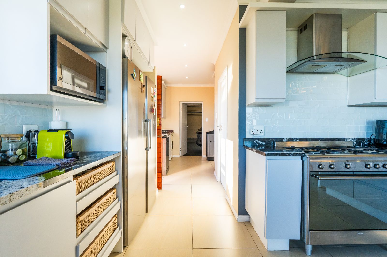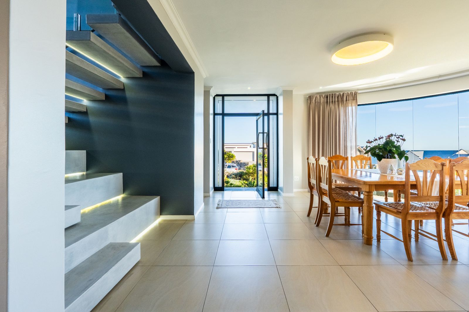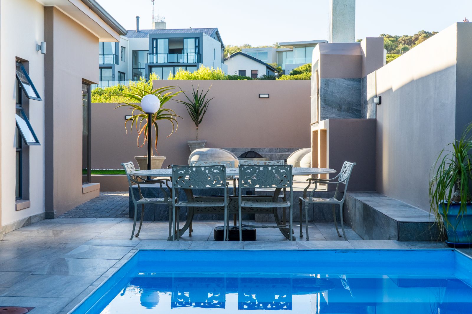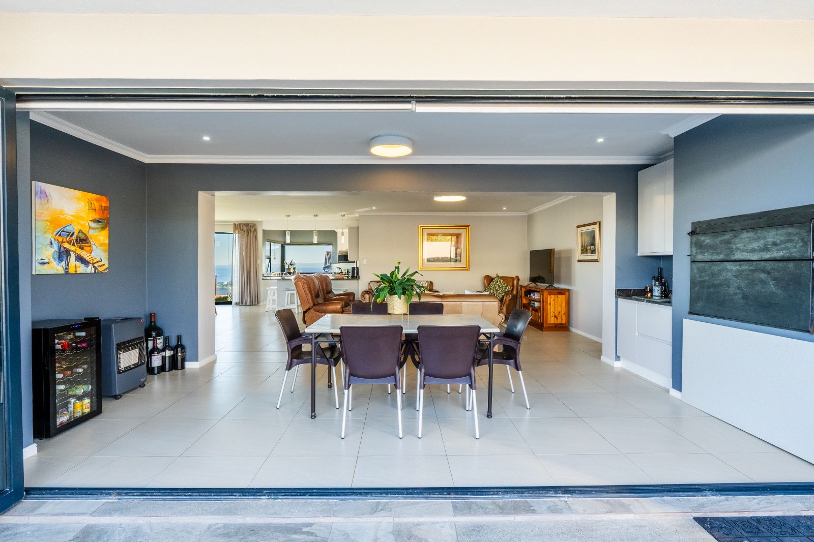 The home has been recently upgraded and now features an extended, pet-friendly outdoor entertainment area that enhances both comfort and style. The ground floor welcomes you with an open-plan design, including a modern kitchen, dining area, lounge, and indoor braai room. Large stacker doors open seamlessly onto the sunny pool patio, creating the perfect flow between indoor and outdoor living. Here you can enjoy the sparkling pool, relax around the boma, or entertain with the built-in outdoor braai.