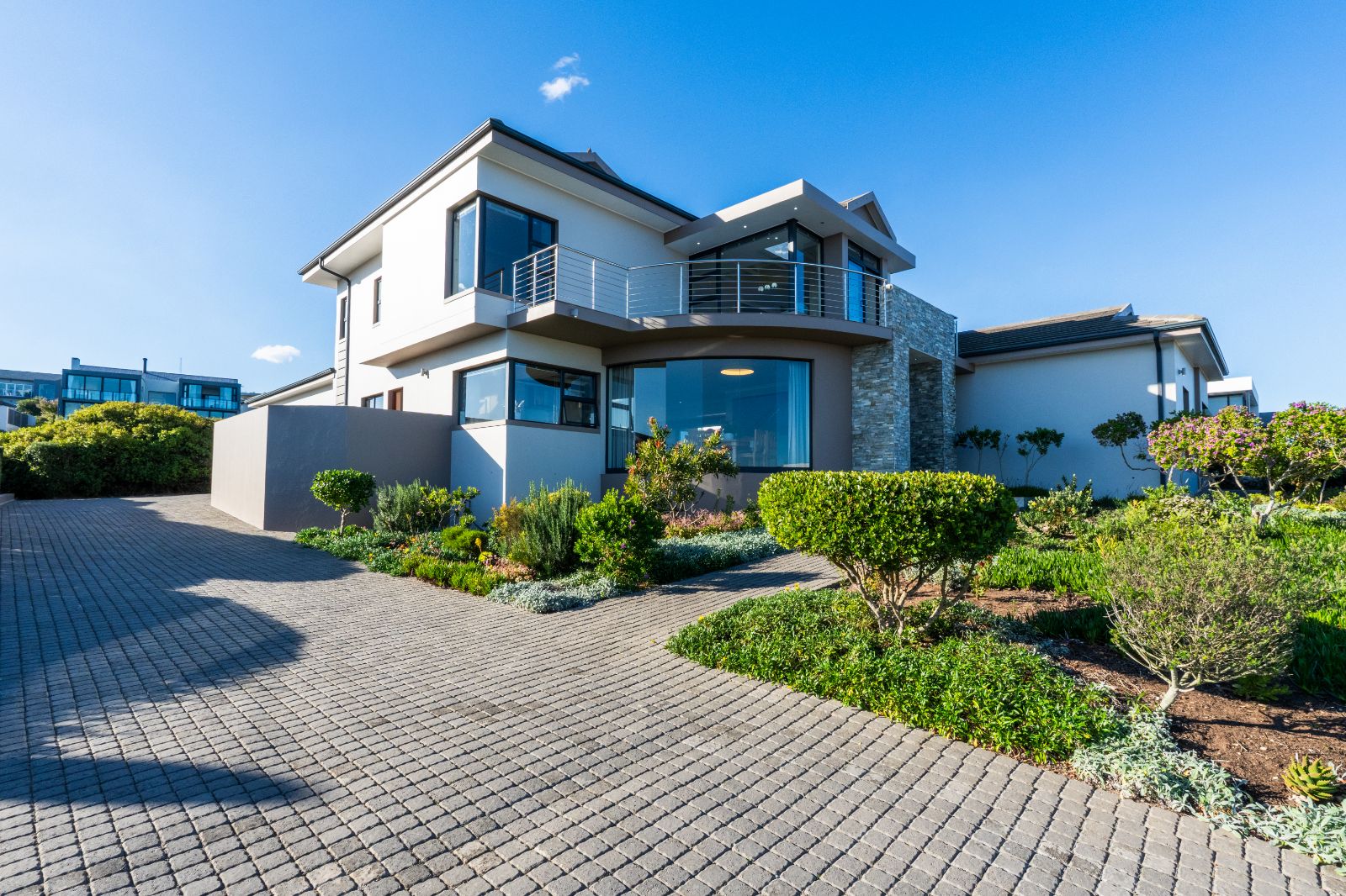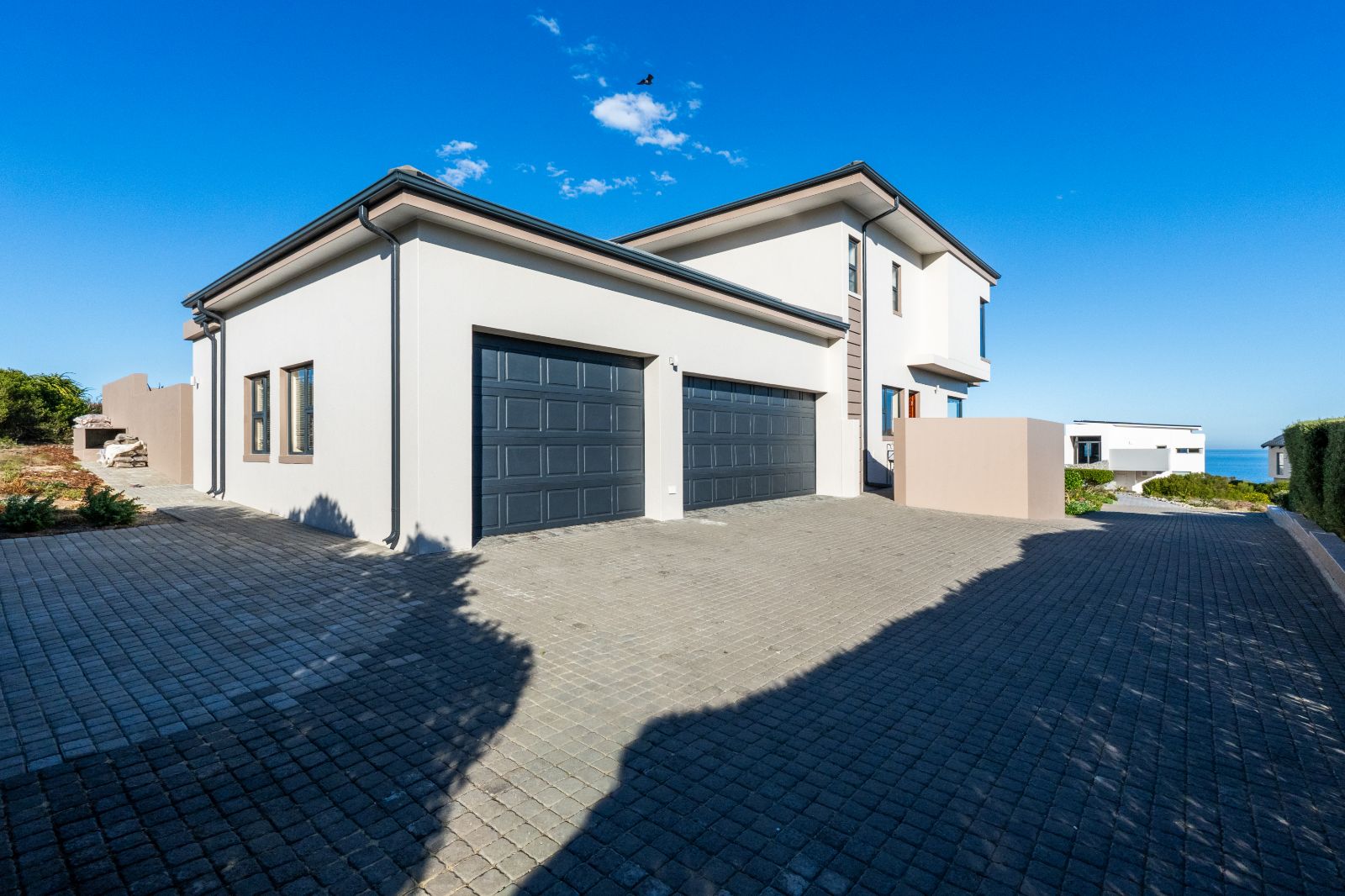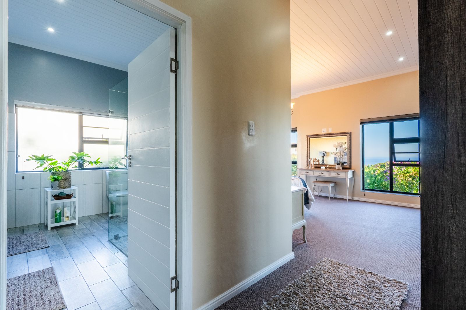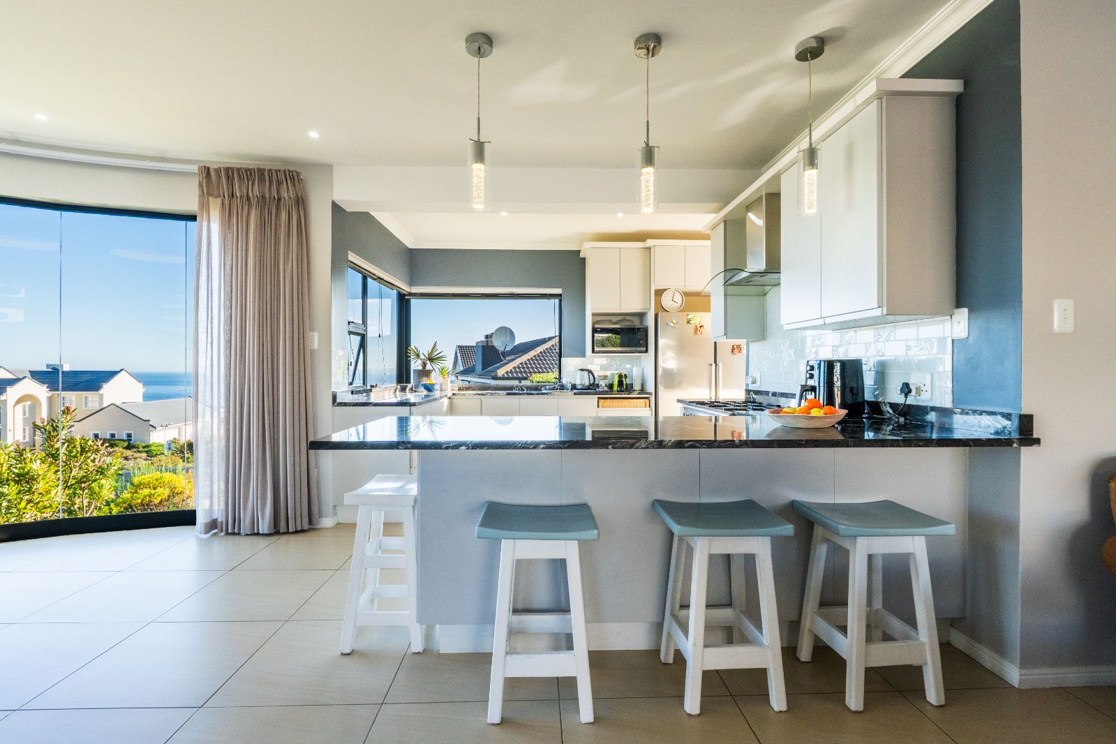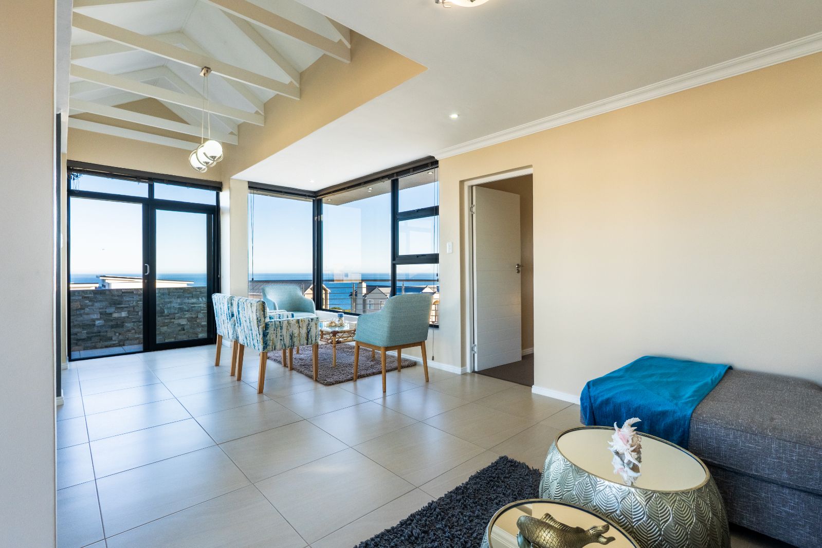Two spacious en-suite bedrooms with built-in cupboards are conveniently located on the ground floor. Upstairs, a second lounge leads onto a large balcony, where sweeping ocean views set the stage for unforgettable sunsets or al fresco dining. The upper level also includes two more bedrooms, each with its own en-suite bathroom.
