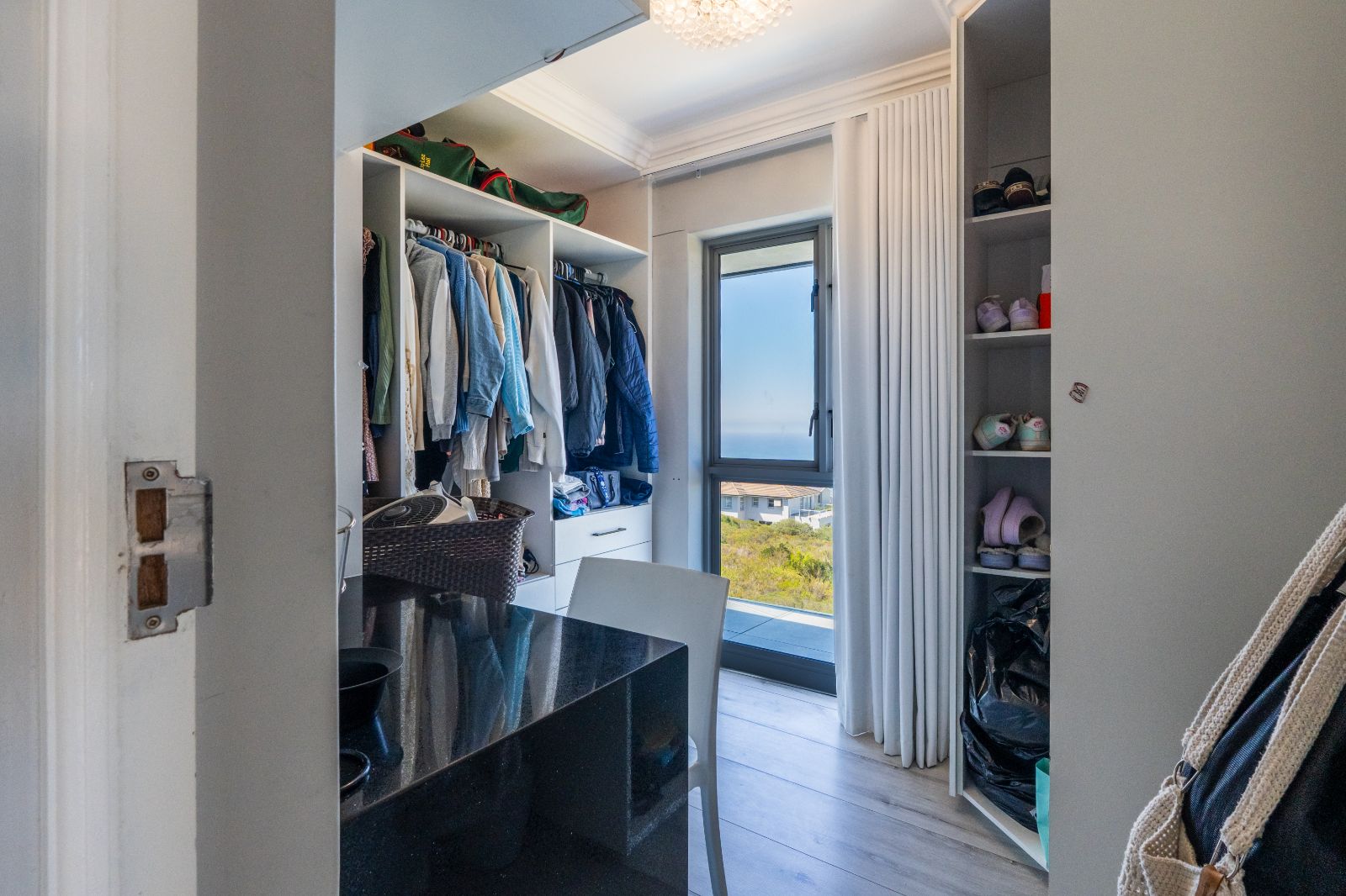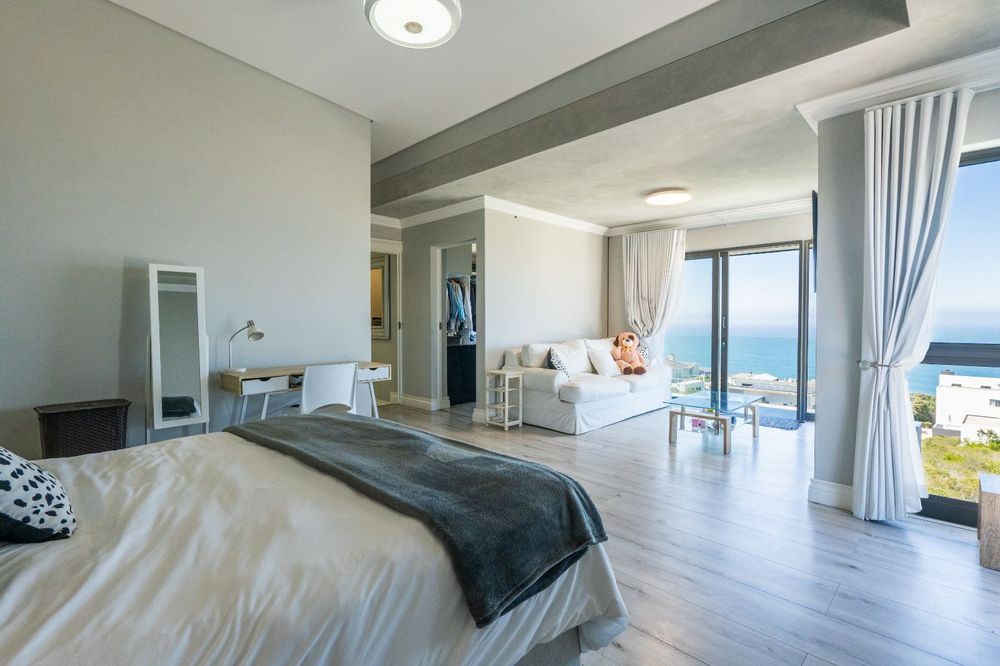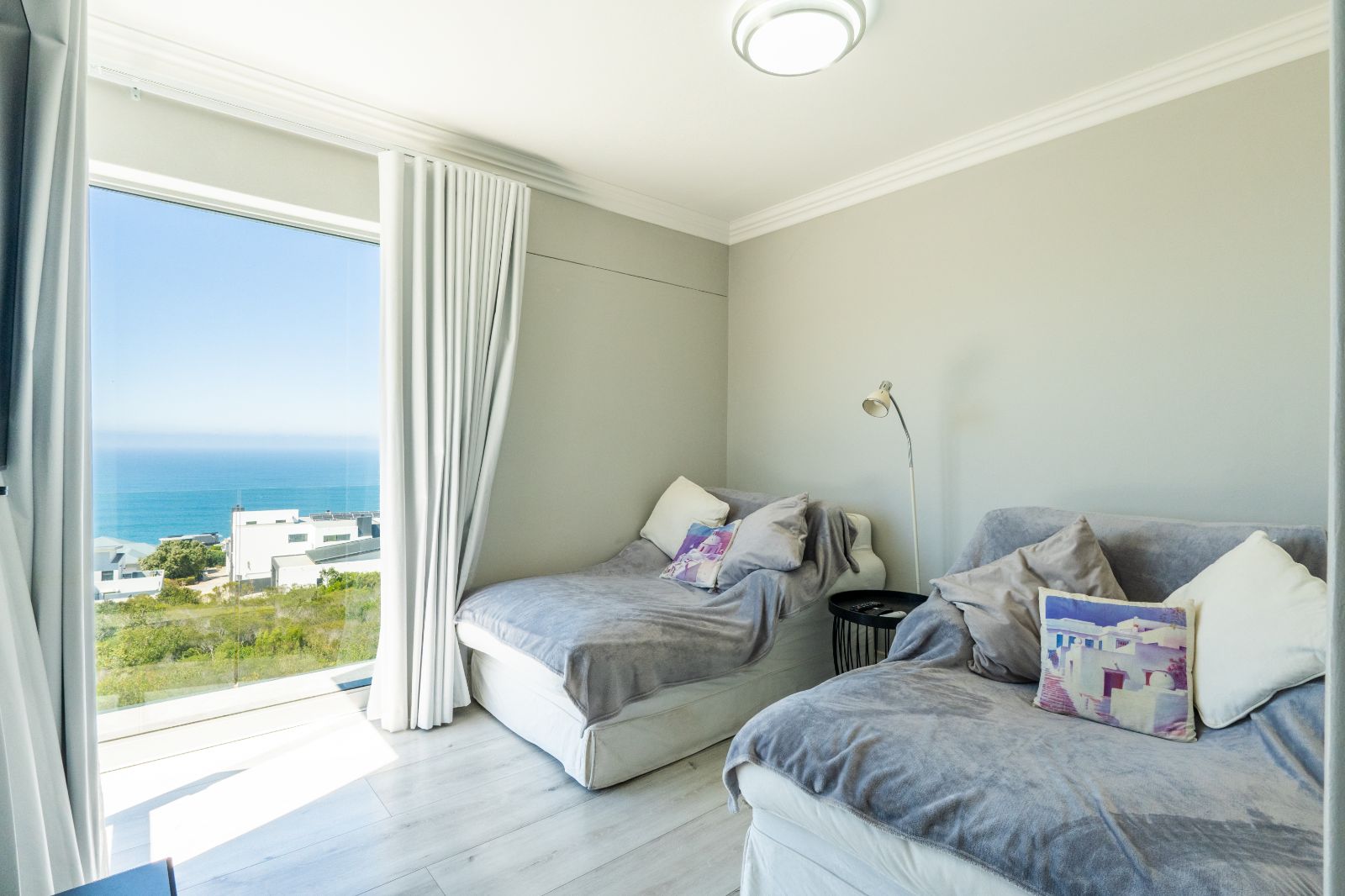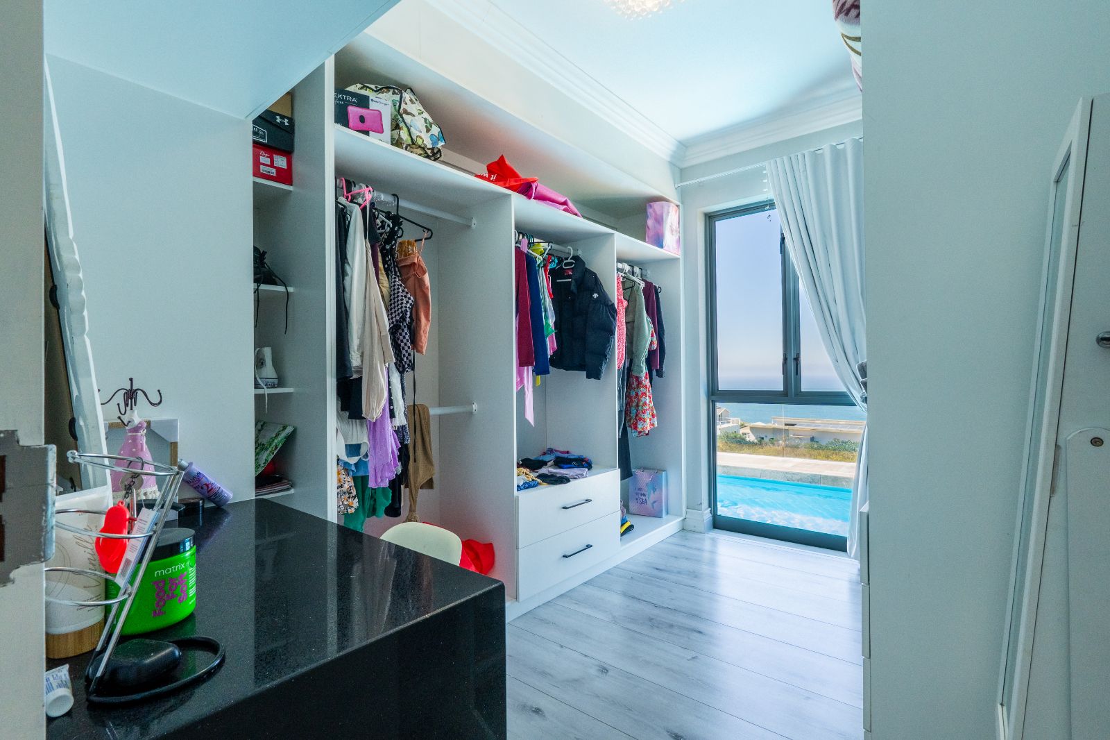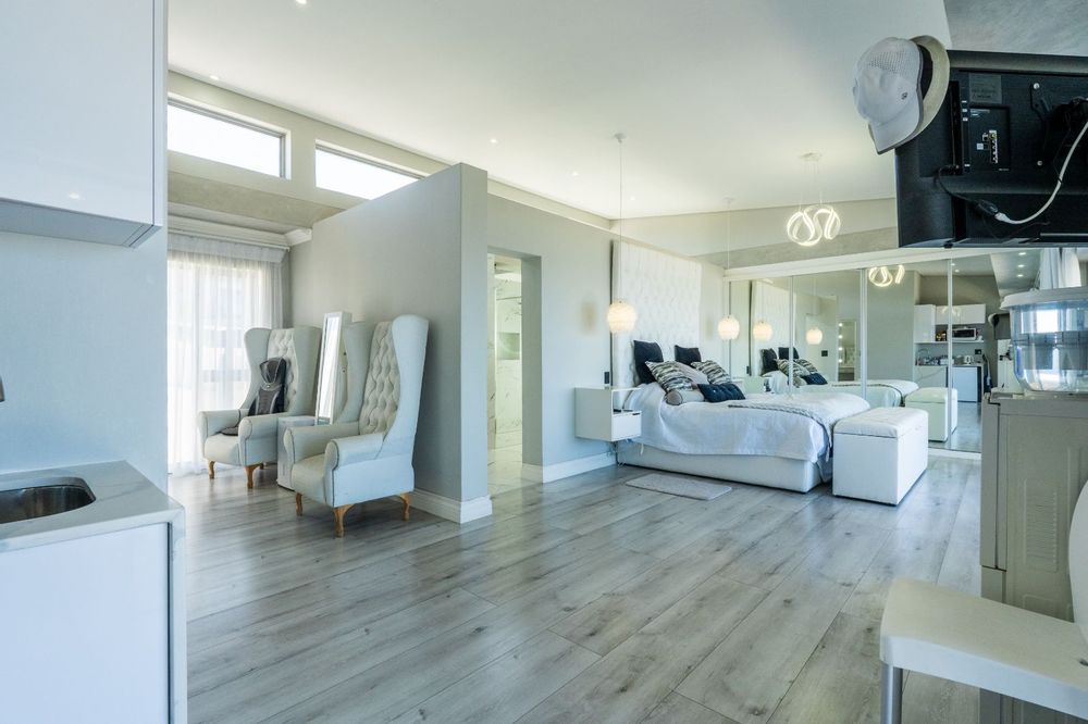 The living and dining spaces share a contemporary gas fireplace, creating a warm and inviting atmosphere. Glass doors open onto a spacious balcony with outdoor loungers, a dining area, comfortable sofas, and a built-in gas braai. Here, you’ll also find a stunning heated pool overlooking the ocean — the perfect setting for relaxed gatherings or quiet sunsets. Also on this level is a beautifully designed guest suite, complete with a walk-in closet and an elegant en-suite bathroom finished in striking black and white tones. A stylish guest bathroom completes this floor.