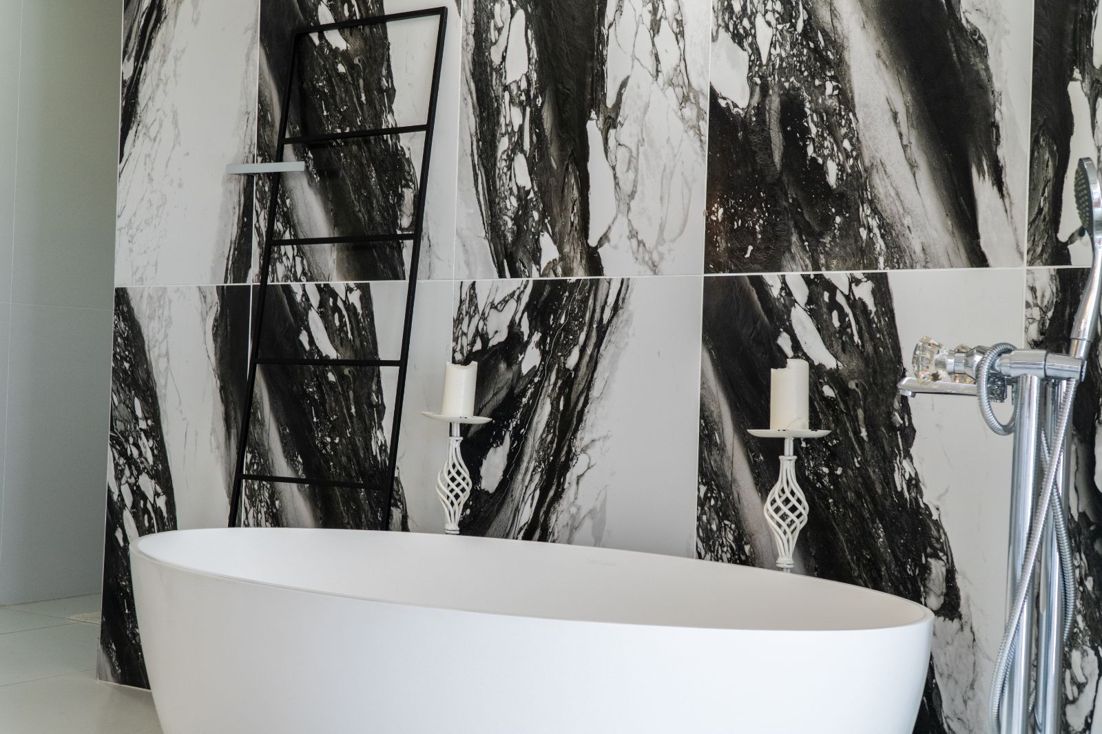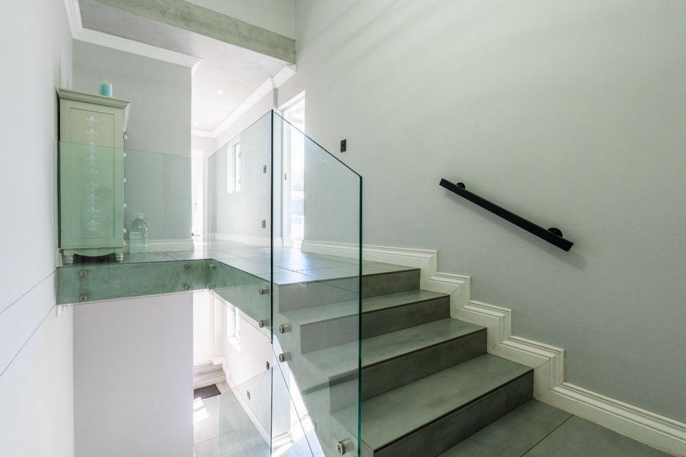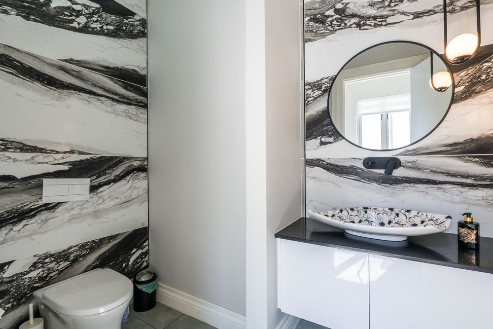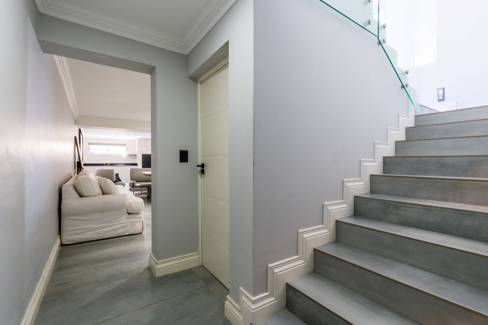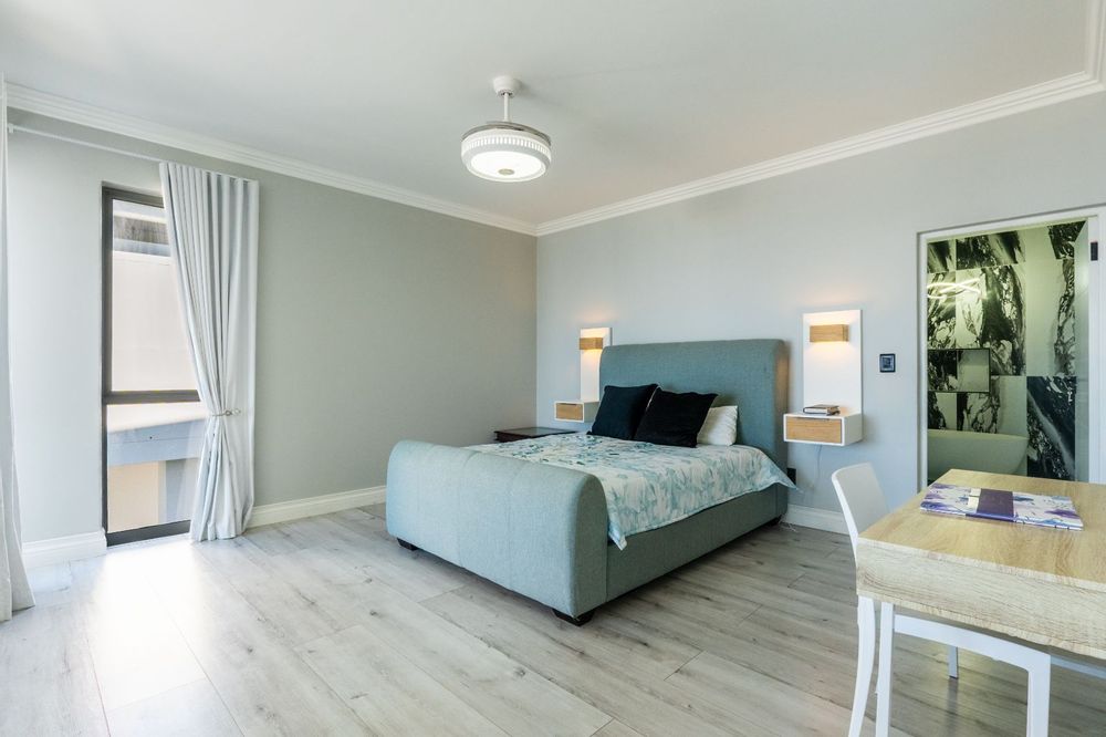 The living and dining spaces share a contemporary gas fireplace, creating a warm and inviting atmosphere. Glass doors open onto a spacious balcony with outdoor loungers, a dining area, comfortable sofas, and a built-in gas braai. Here, you’ll also find a stunning heated pool overlooking the ocean — the perfect setting for relaxed gatherings or quiet sunsets. Also on this level is a beautifully designed guest suite, complete with a walk-in closet and an elegant en-suite bathroom finished in striking black and white tones. A stylish guest bathroom completes this floor.