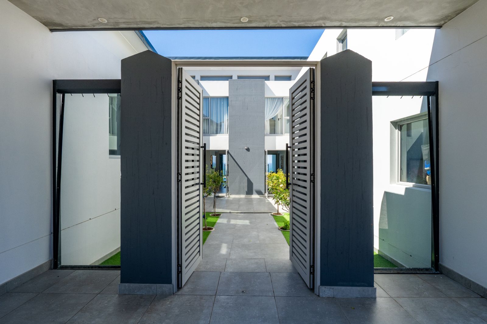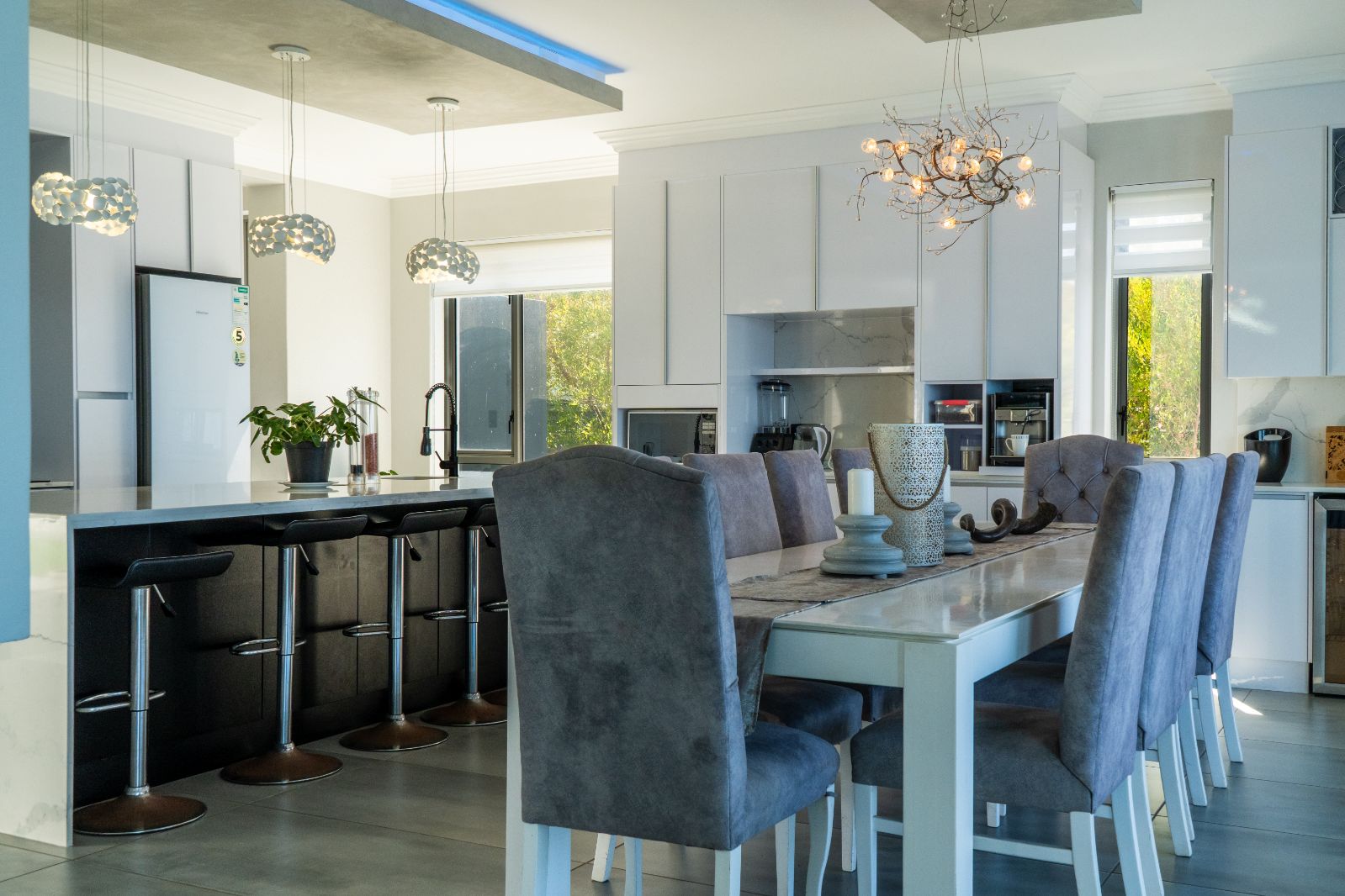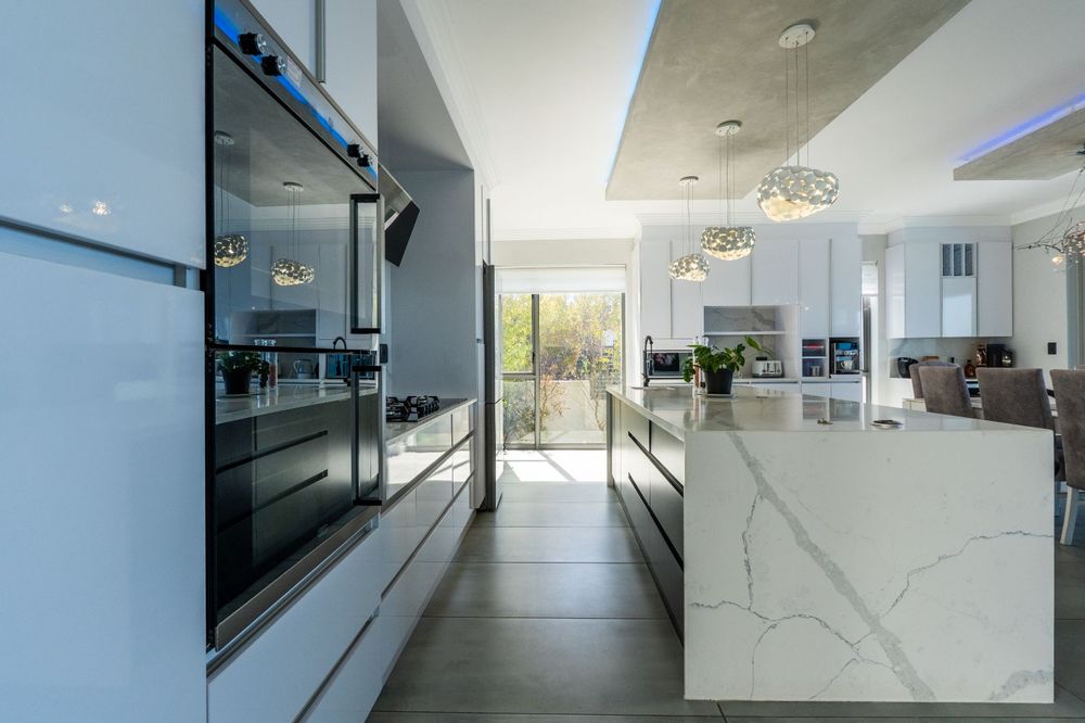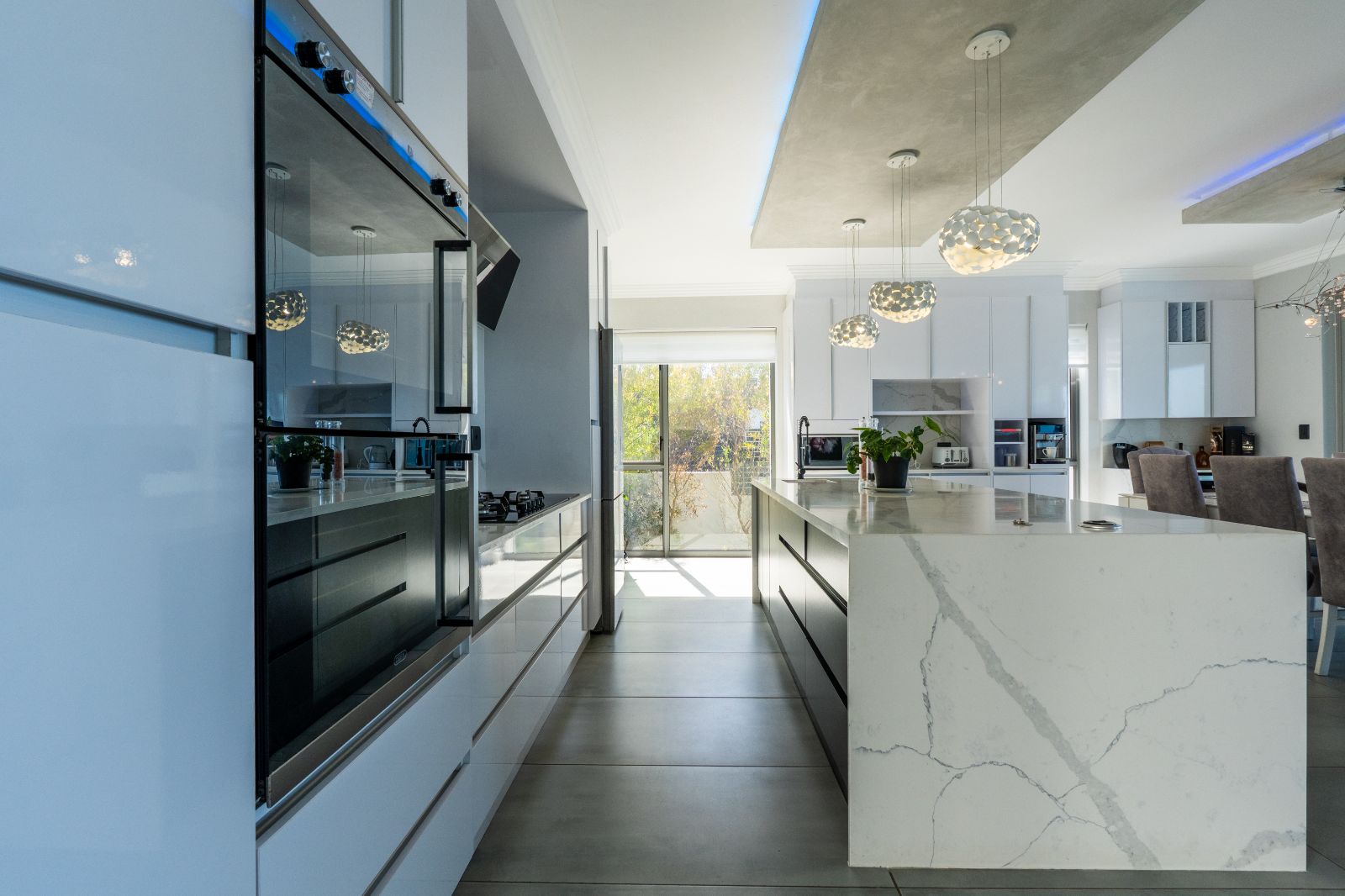 First Level – Elegant Everyday Living Arriving at the home, you’re welcomed by two double garages on either side and a stylish entrance leading through a serene courtyard to the front door. Inside, the open-plan living, dining, and kitchen areas exude calm elegance. The kitchen features a large marble-topped island, sleek cabinetry, a generous scullery, and a walk-in pantry — perfect for effortless entertaining.