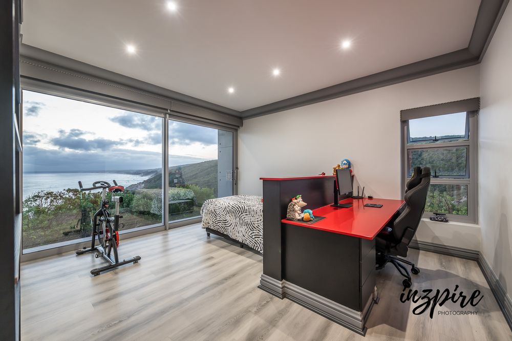 Positioned in a quiet cul‐de‐sac within the prestigious Pinnacle Point Golf Estate, this contemporary home offers double‐volume living, floor‐to‐ceiling glass, and uninterrupted views of the Indian Ocean. Designed for effortless luxury, the home blends modern architecture with the tranquillity of fynbos surroundings.