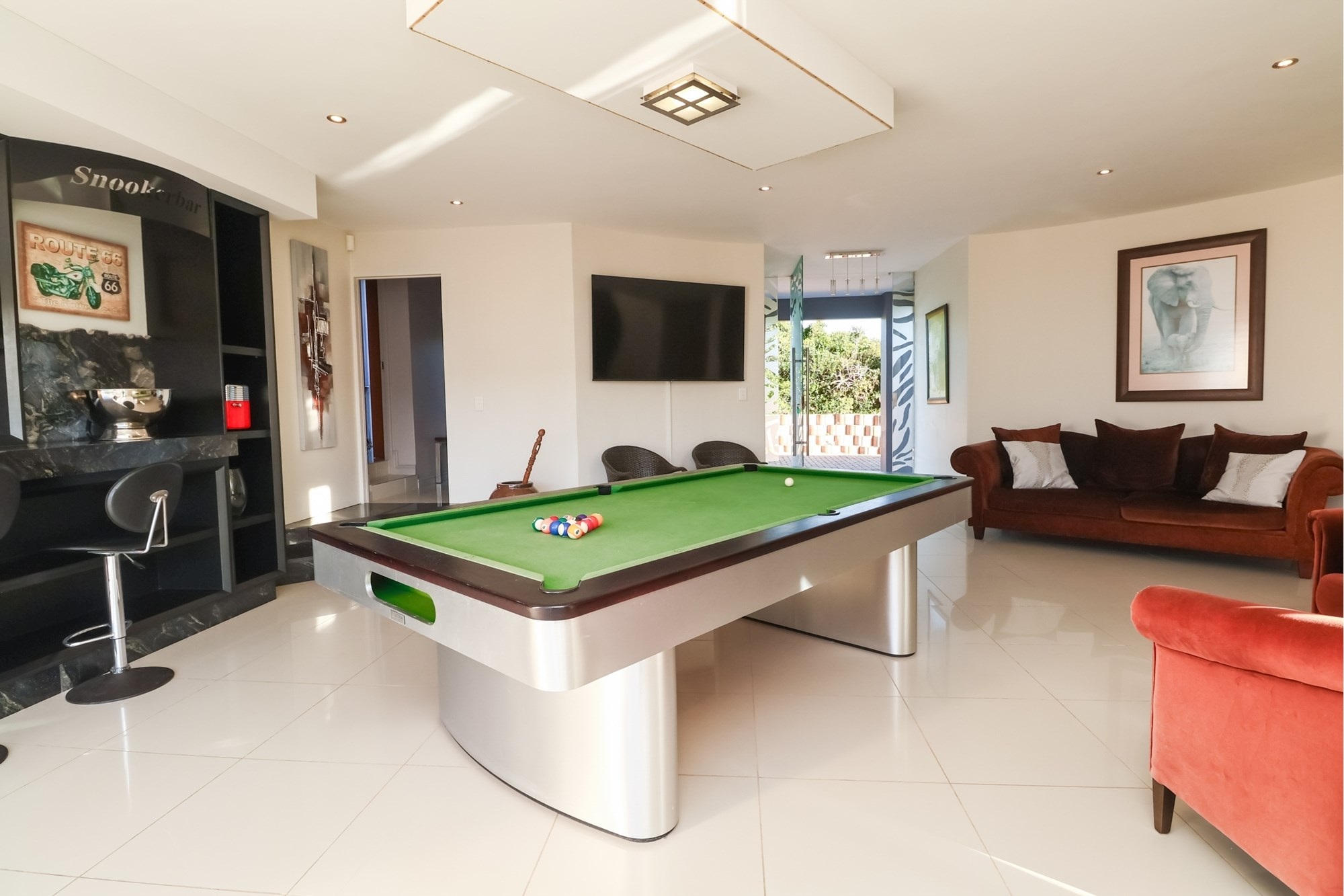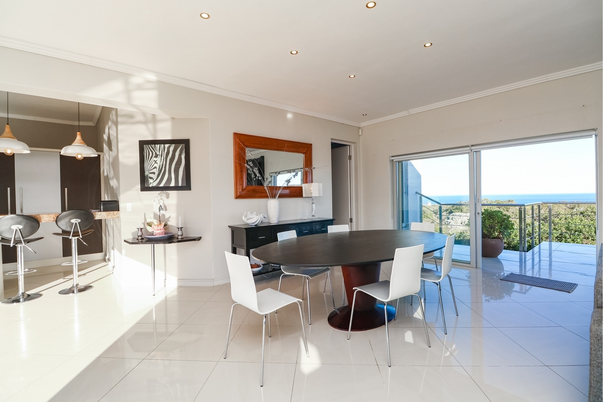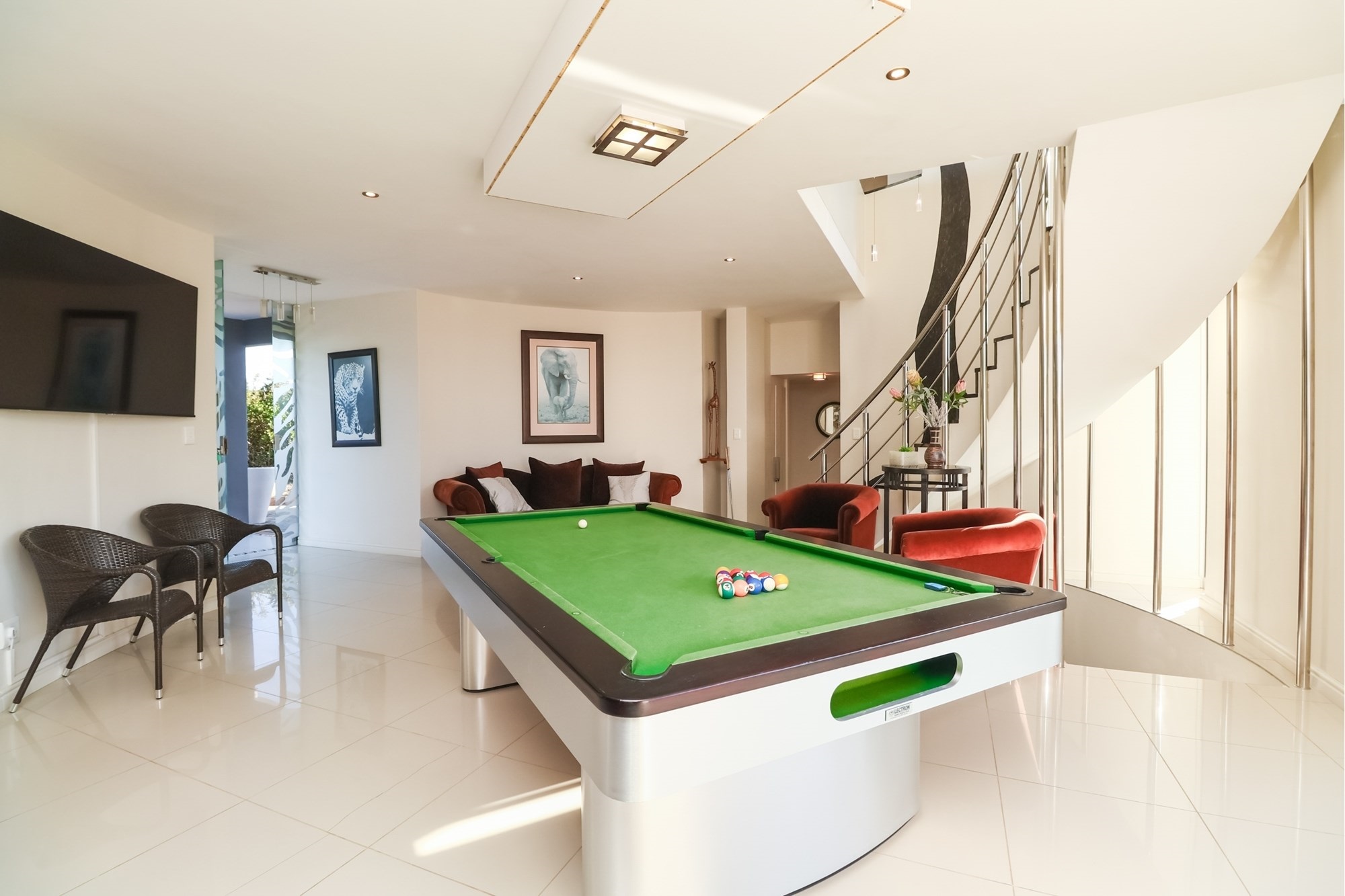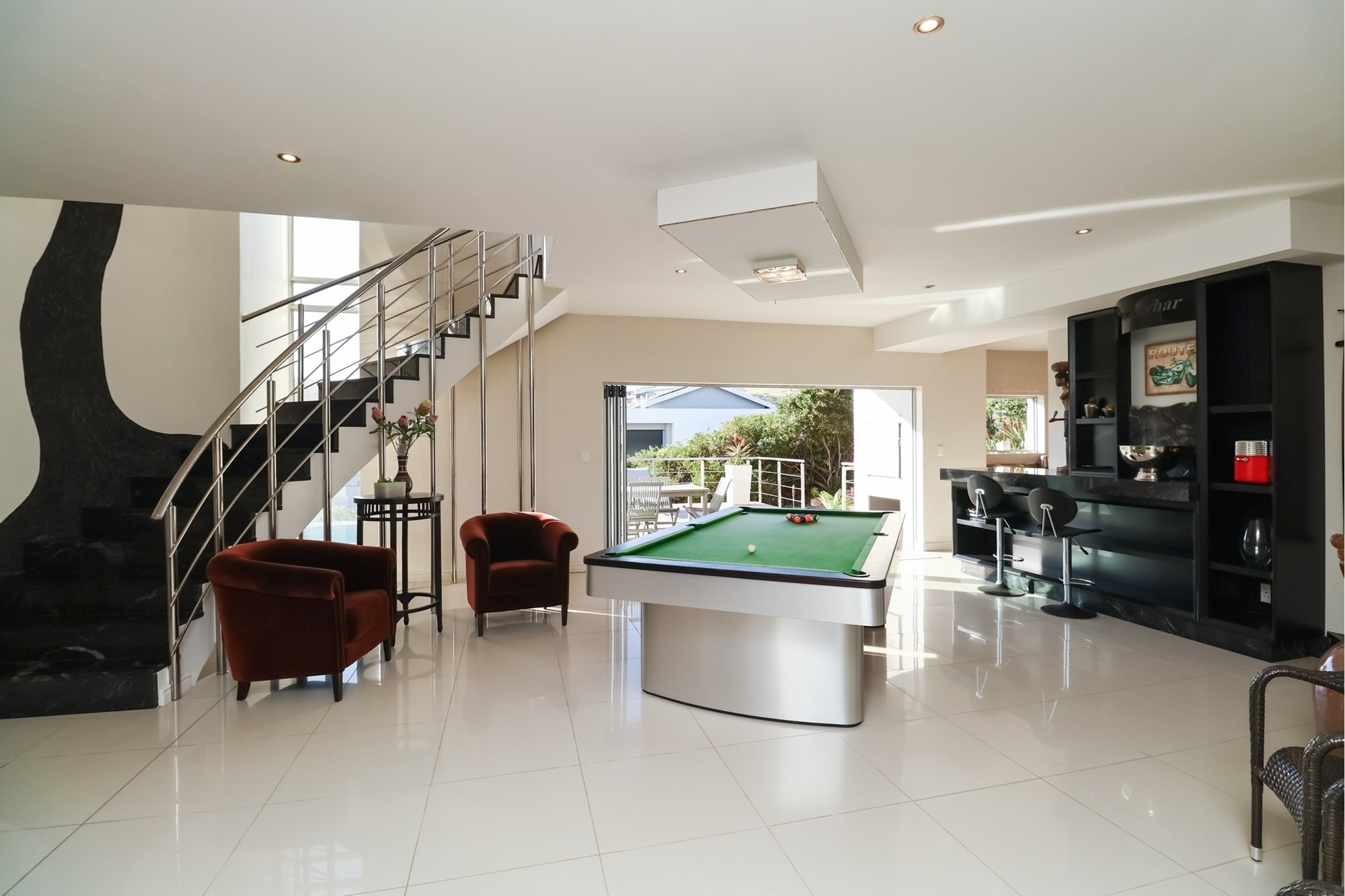 As you step inside, you are greeted by a spacious open-plan entertainment area that features a custom-built bar, a pool table, and a striking architectural granite-topped helical staircase that serves as a captivating centerpiece. Fold-away stacker doors seamlessly connect the interior to an expansive outdoor entertainment space, where a sparkling rim-flow pool overlooks the mesmerizing Indian Ocean and the lush fairways of the award-winning golf course. The ground floor includes a modern gourmet kitchen with a wine cooler and separate scullery, as well as three comfortable bedrooms, two of which are en-suite and offer uninterrupted sea views.
