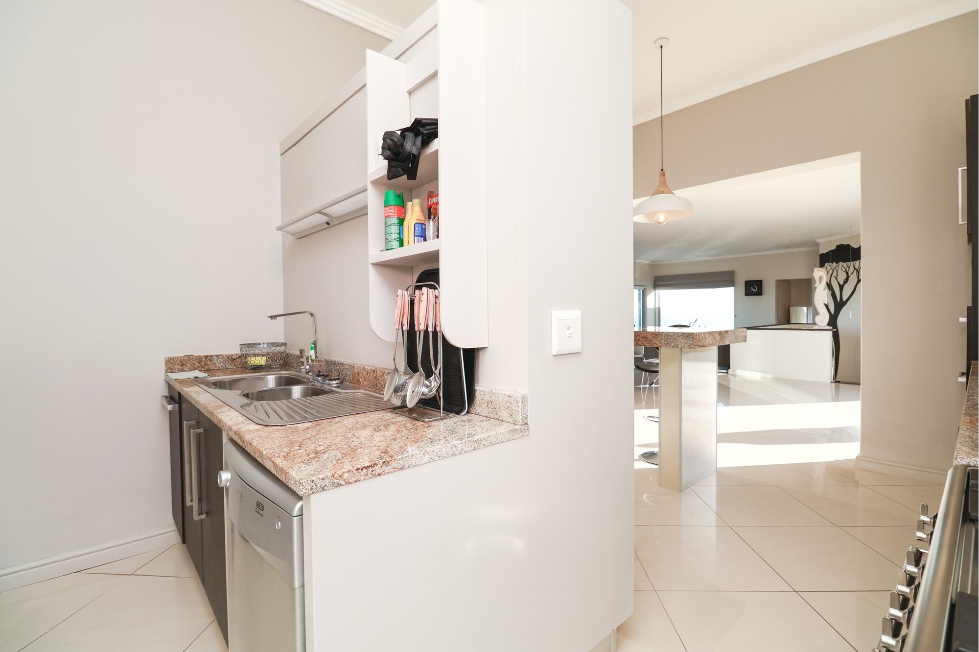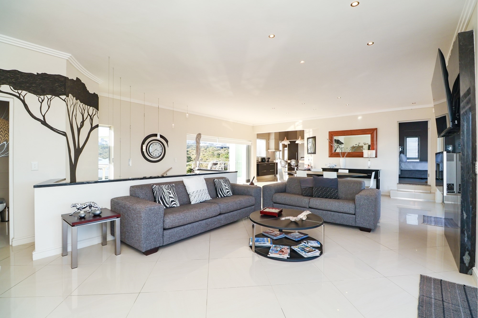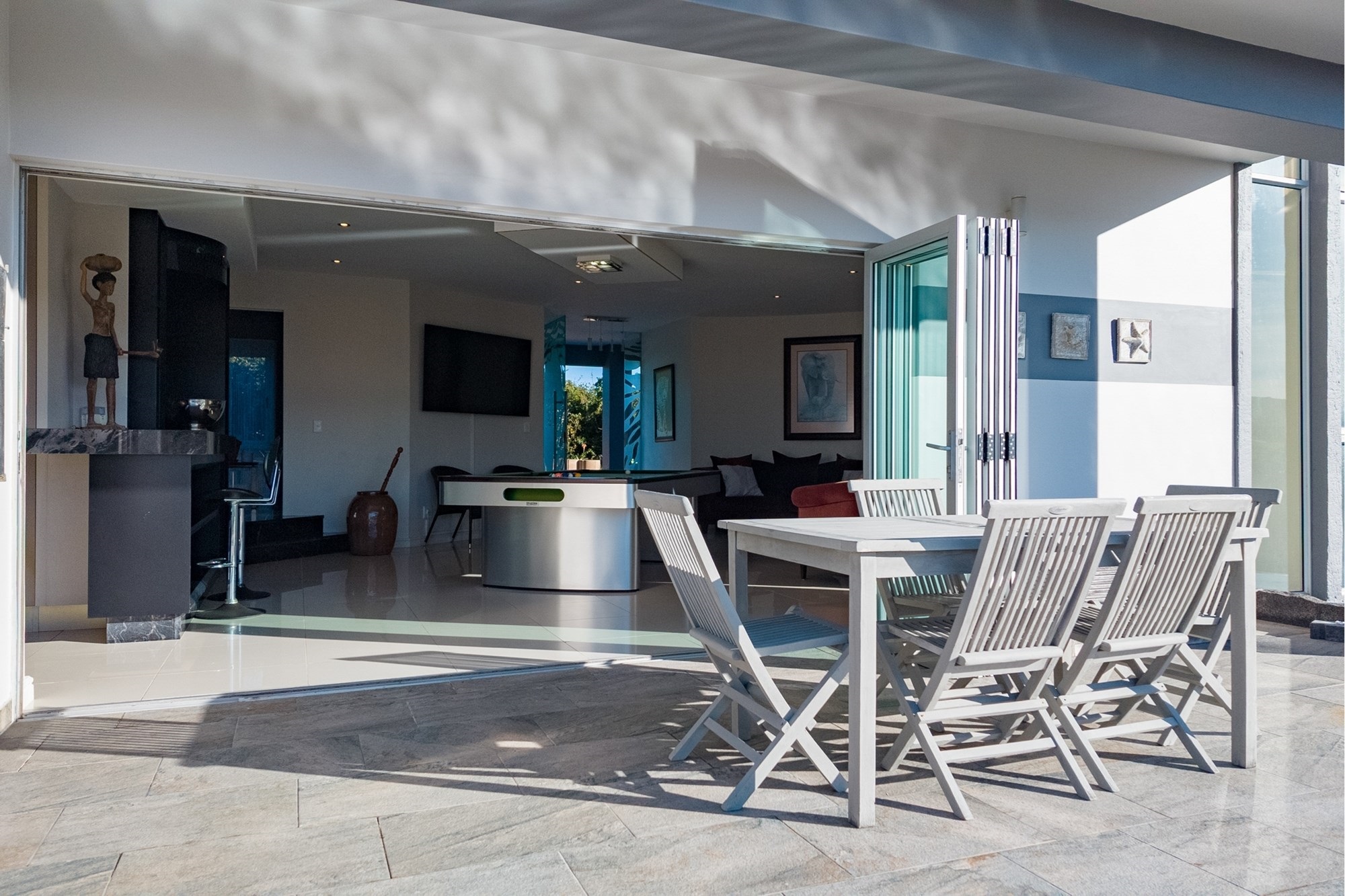 As you step inside, you are greeted by a spacious open-plan entertainment area that features a custom-built bar, a pool table, and a striking architectural granite-topped helical staircase that serves as a captivating centerpiece. Fold-away stacker doors seamlessly connect the interior to an expansive outdoor entertainment space, where a sparkling rim-flow pool overlooks the mesmerizing Indian Ocean and the lush fairways of the award-winning golf course. The ground floor includes a modern gourmet kitchen with a wine cooler and separate scullery, as well as three comfortable bedrooms, two of which are en-suite and offer uninterrupted sea views.