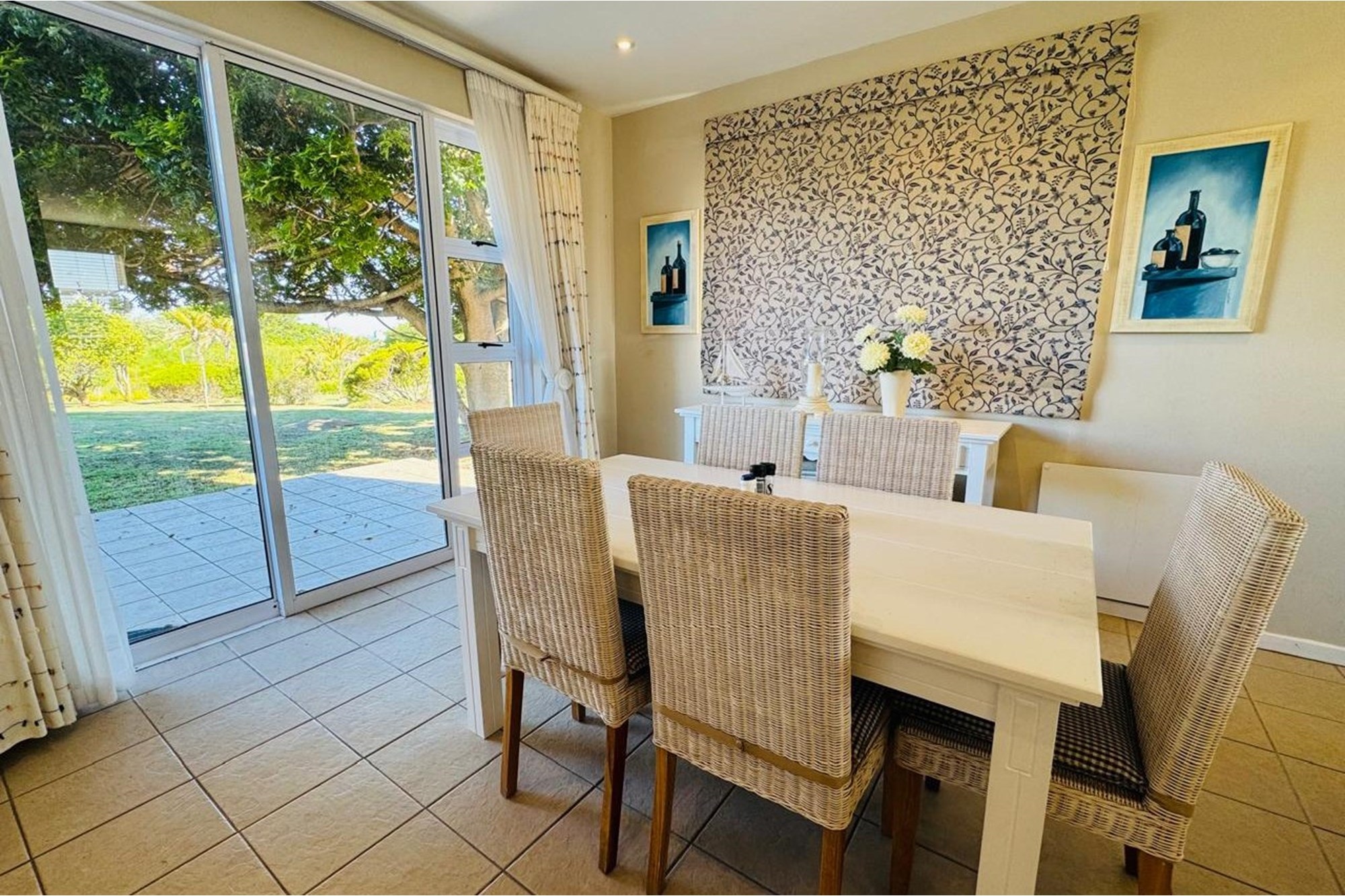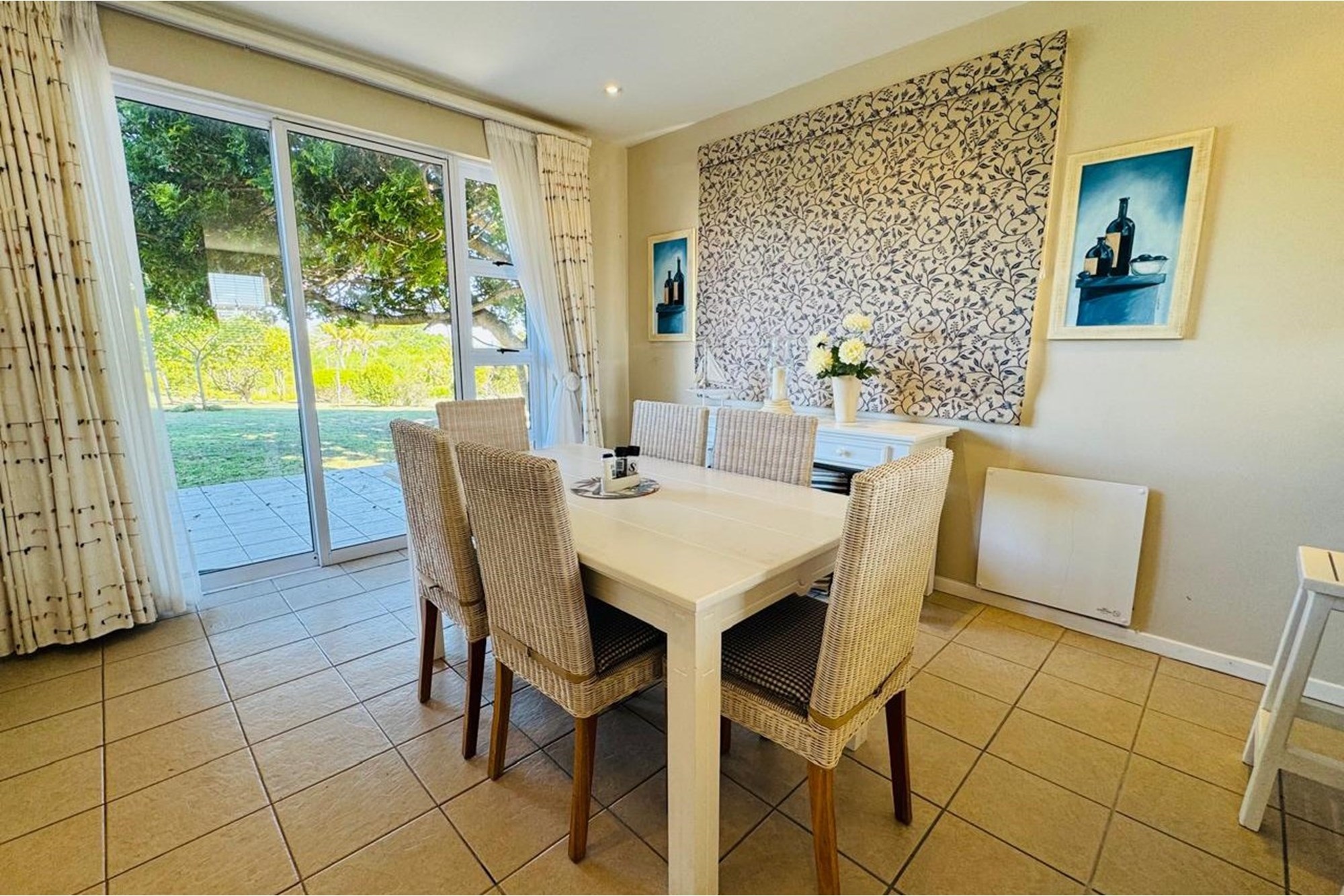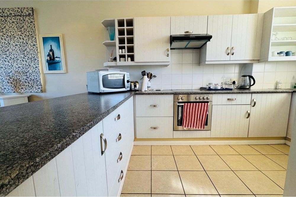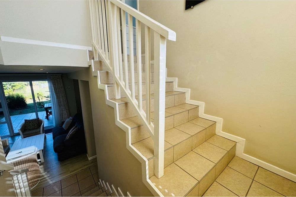 On the ground floor, you`ll find an open-plan living area that includes a spacious lounge opening onto a private patio, complete with a built-in braai and a generous lawn that leads directly to the pool. The adjoining dining area and well-appointed kitchen, equipped with a breakfast nook, under-counter oven, and hob, create a harmonious living space.