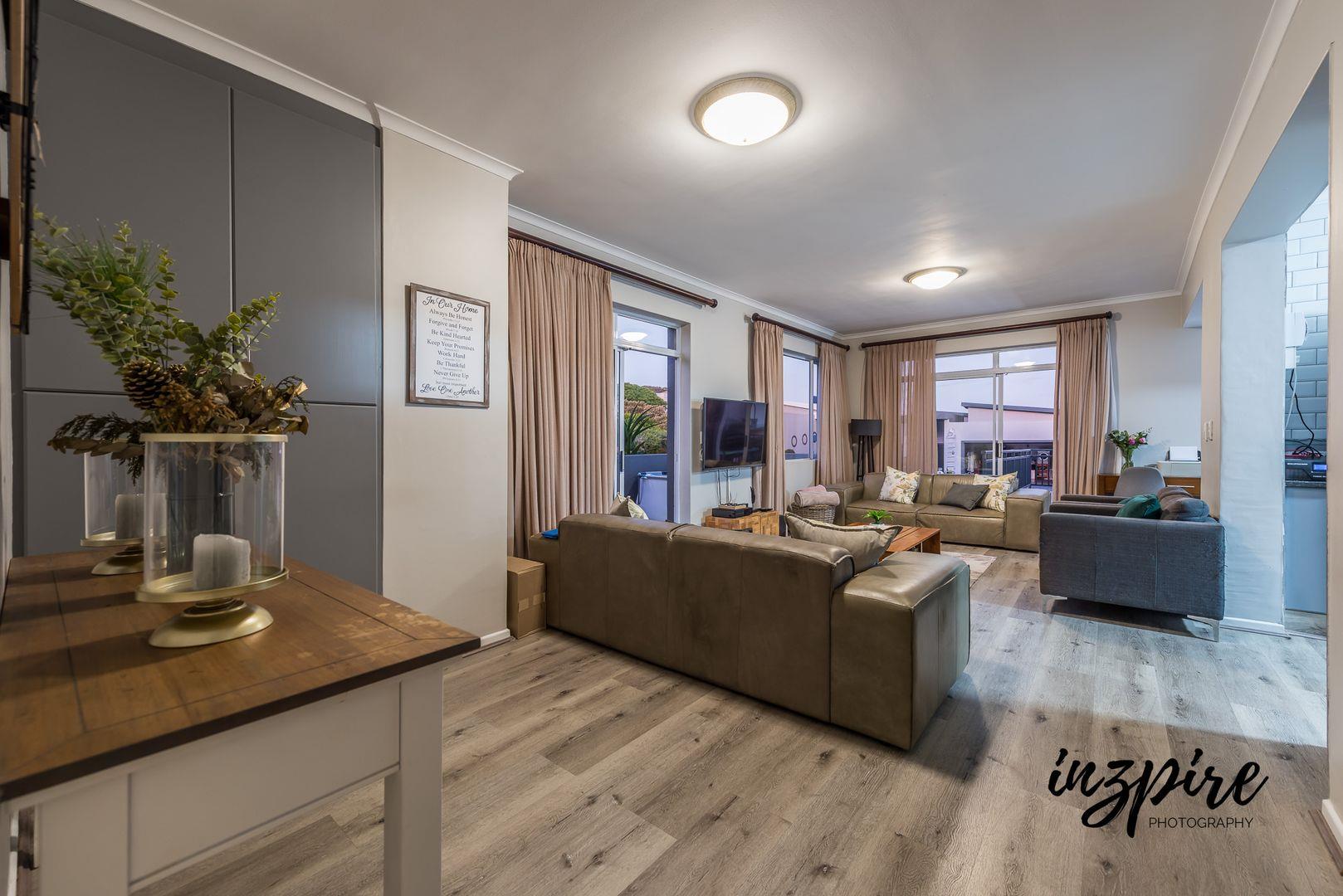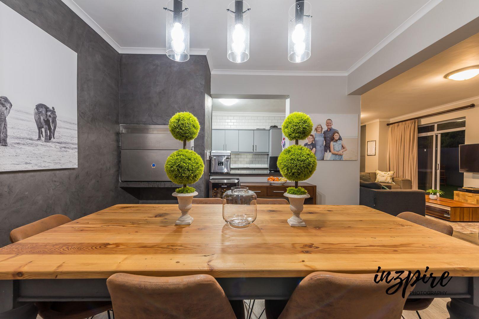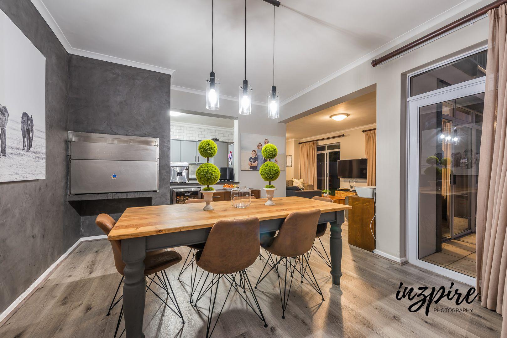 The spacious living room flows into a family dining room with a standout modern light fixture and textured wall, the built-in braai/fireplace extends to a fabulous entertaining area complete with tiled patio.