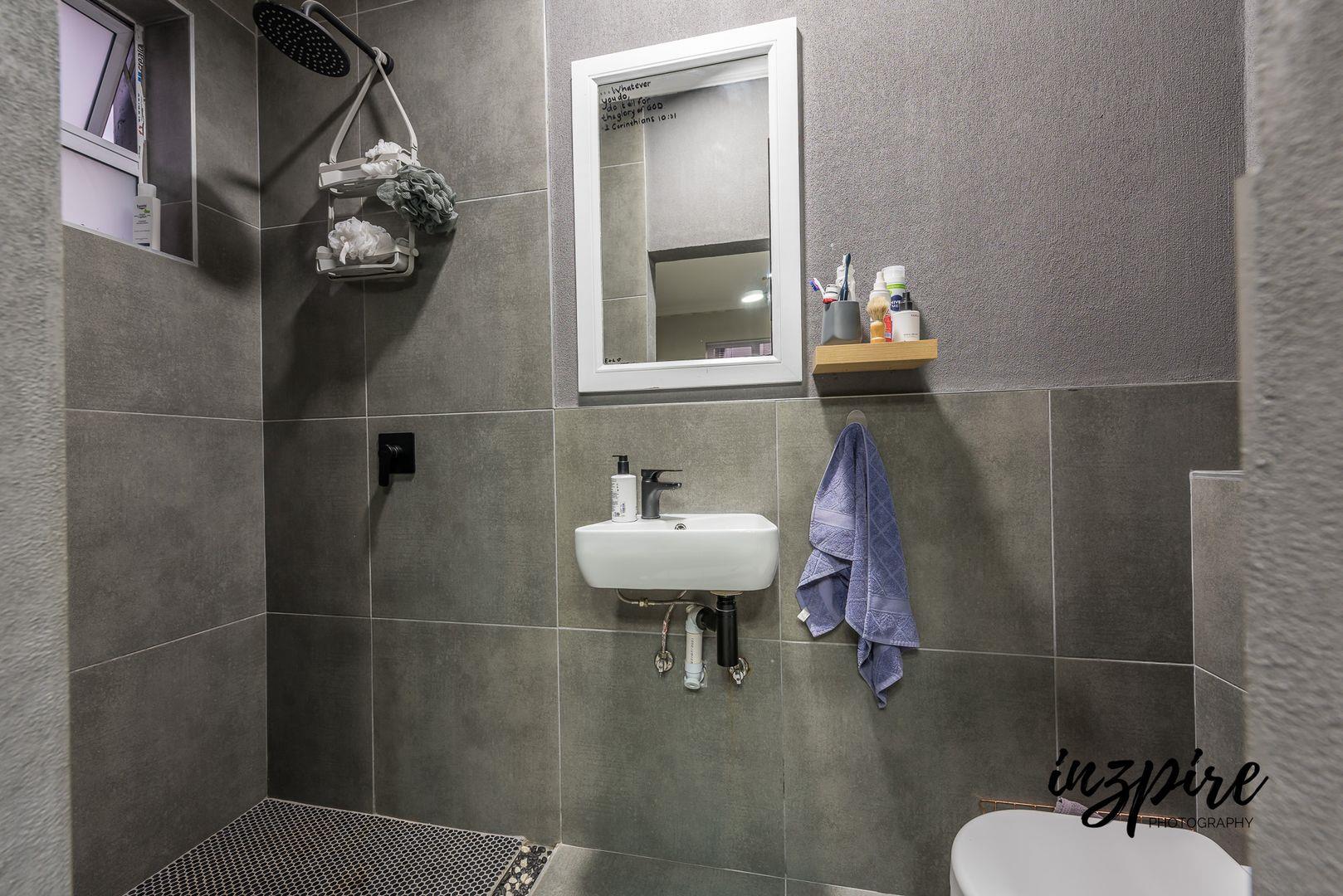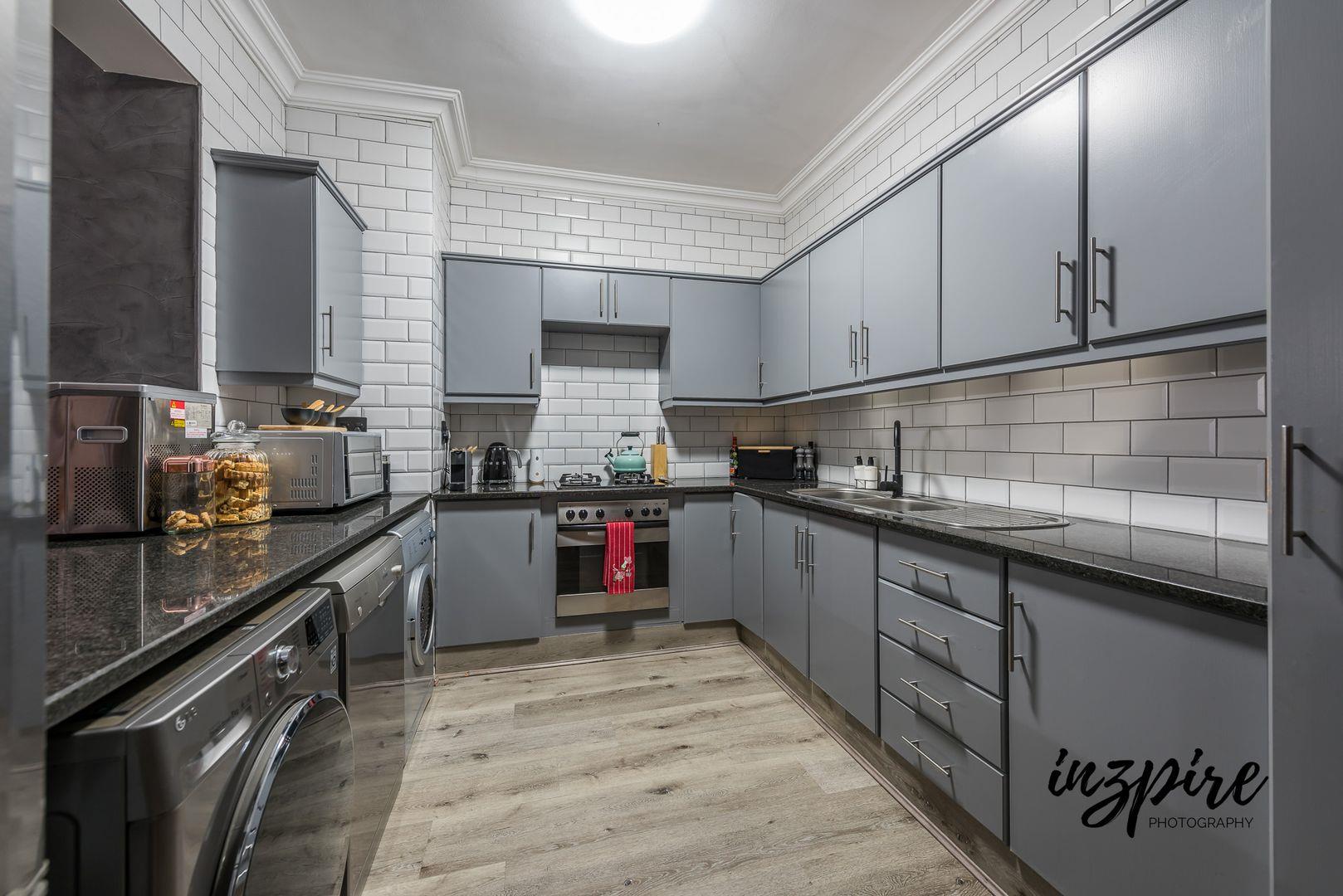 The gourmet kitchen is incorporated within the open-plan living and dining, and features glistening granite countertops, modern subway tiles and elegant grey cabinetry.