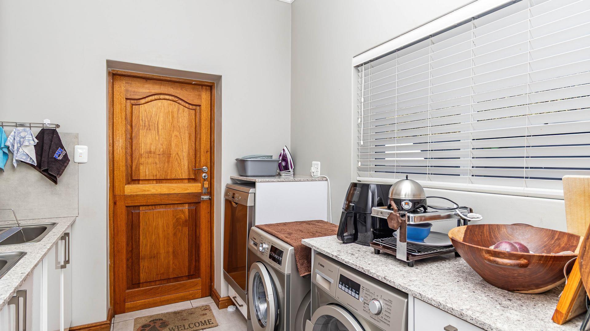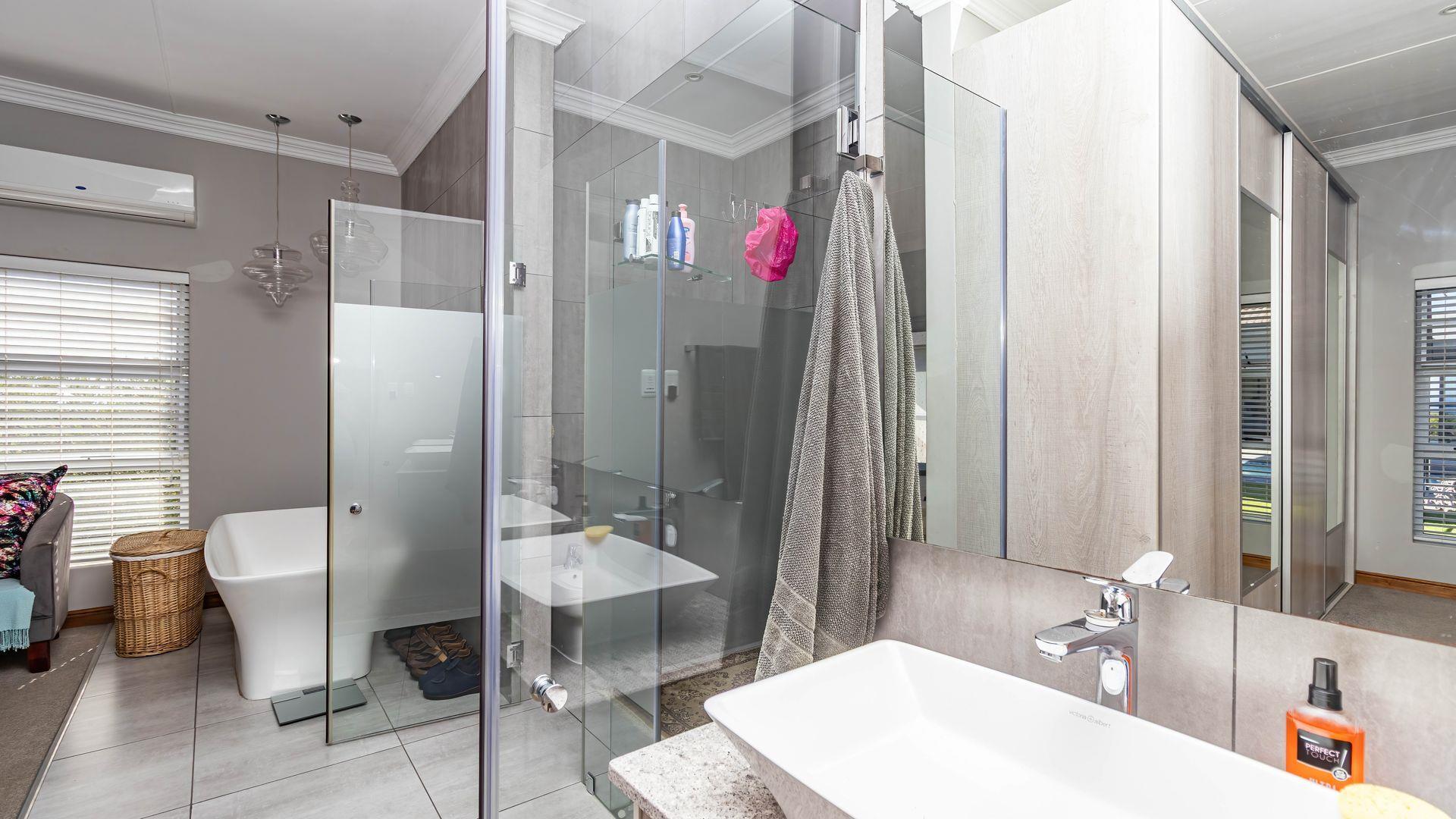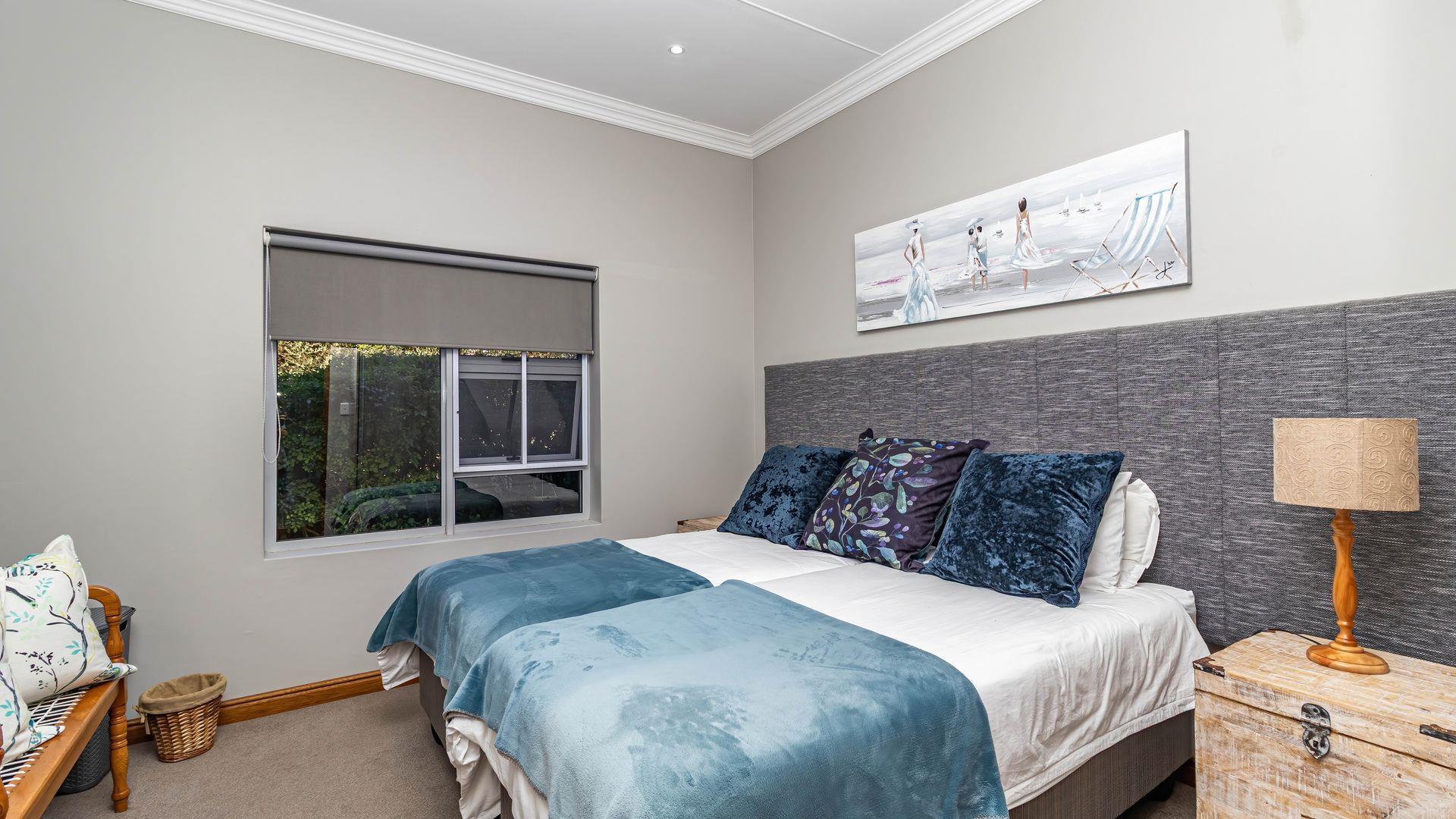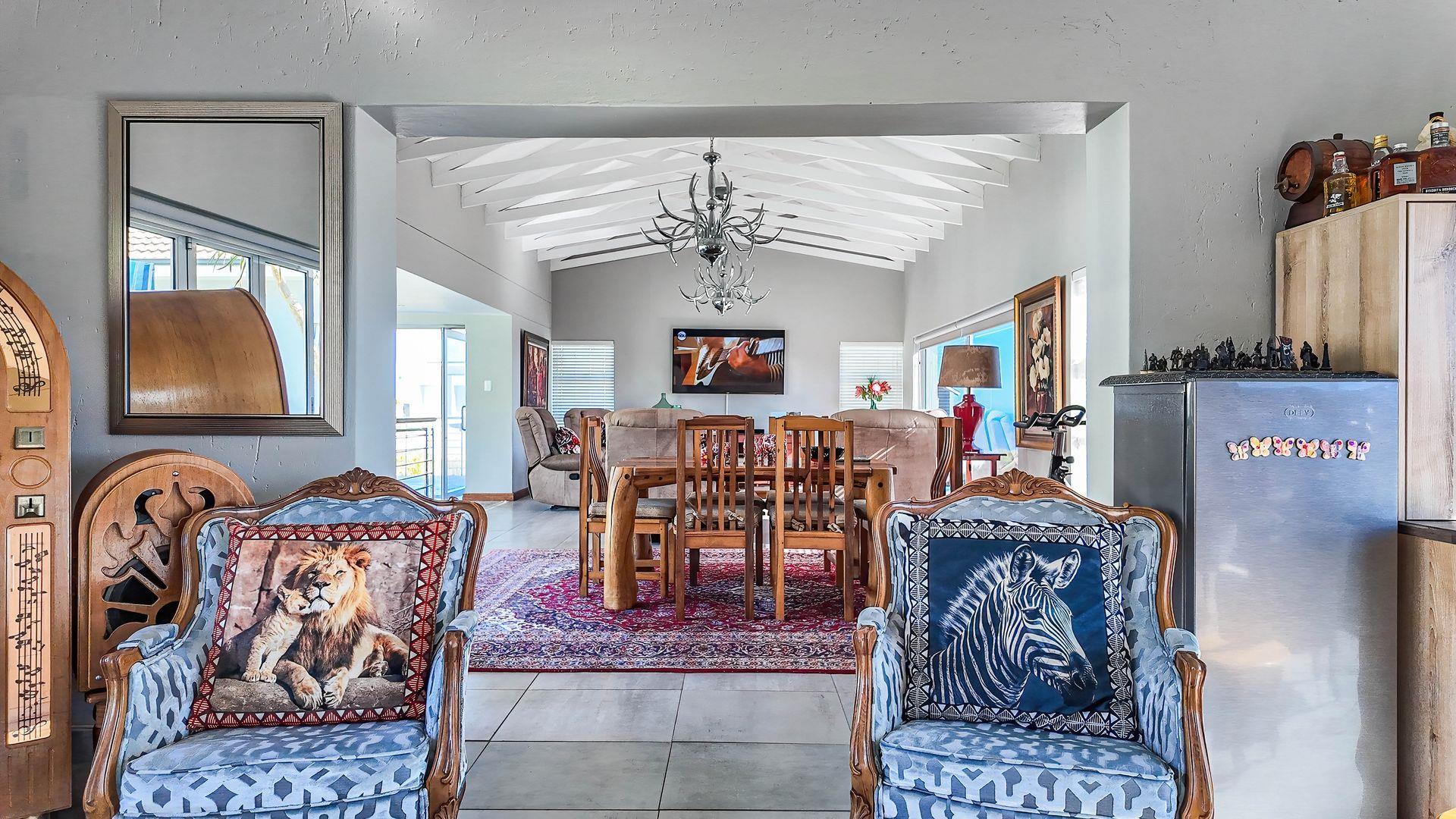 This stunning single-level home offers an open layout that surrounds a central courtyard with a pool, creating a serene flow between all living spaces. Sliding and stacking doors enhance the interior with natural light, while the indoor braai area seamlessly connects to the dining room, lounge, and an entertainment room featuring a built-in bar. Each area is adorned with generous windows that frame the picturesque surroundings. The residence boasts four bedrooms, each with direct outdoor access, including two with en-suite bathrooms. The main bedroom and lounge are equipped with air-conditioning, and the property benefits from a full solar system. Ample garaging and organized storage areas complete this thoughtfully designed home.