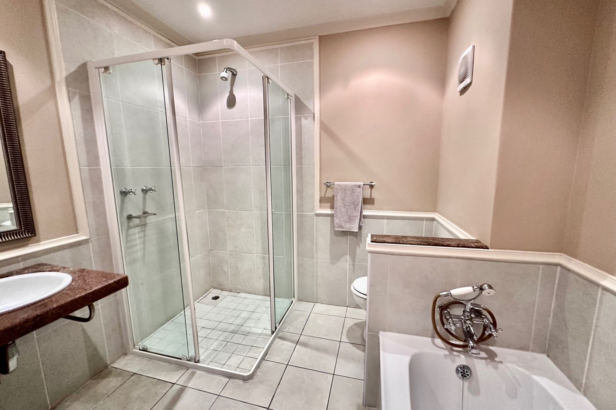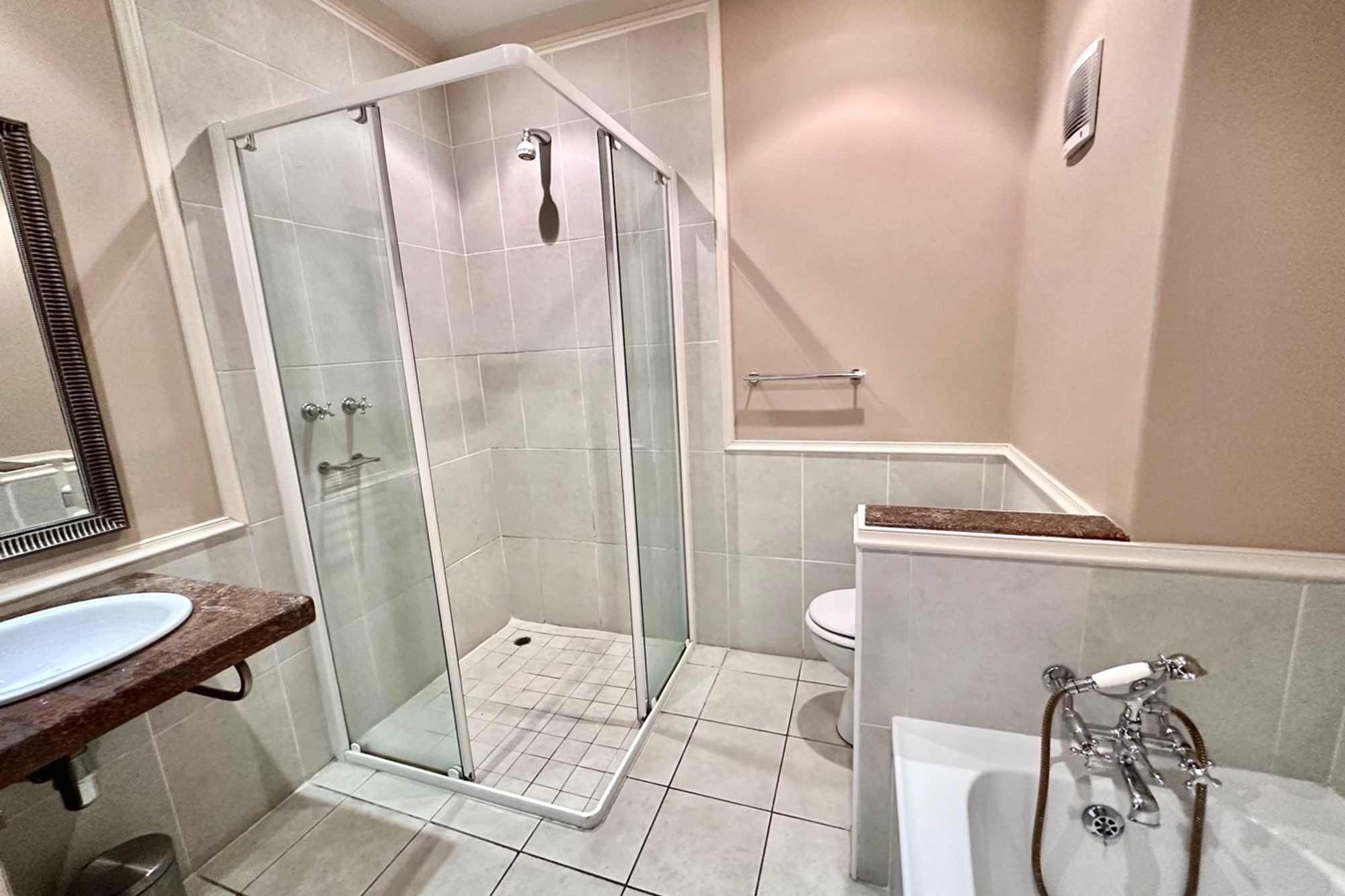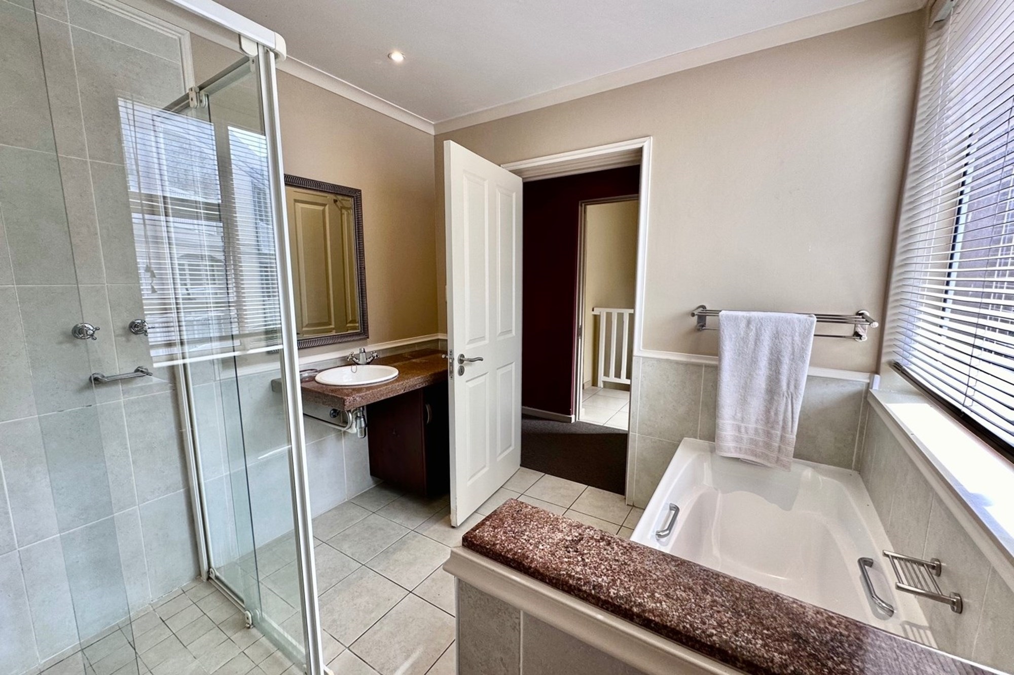 The ground-floor en-suite bedroom provides direct access to the garden, while the main suite upstairs boasts a generous private with breathtaking vistas, ample cupboard space, and a luxurious en-suite bathroom. The third bedroom opens to the balcony and includes its own full bathroom.