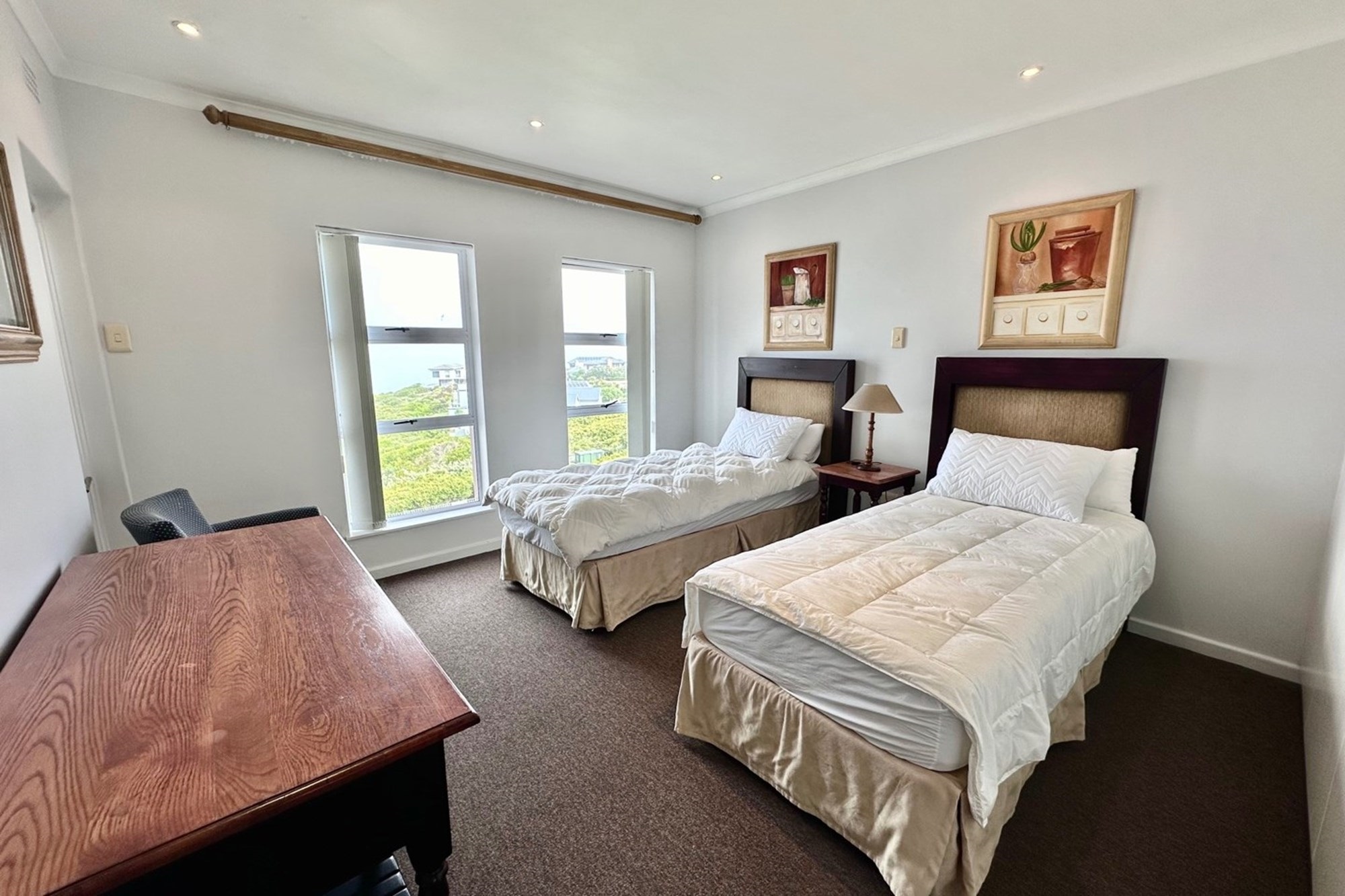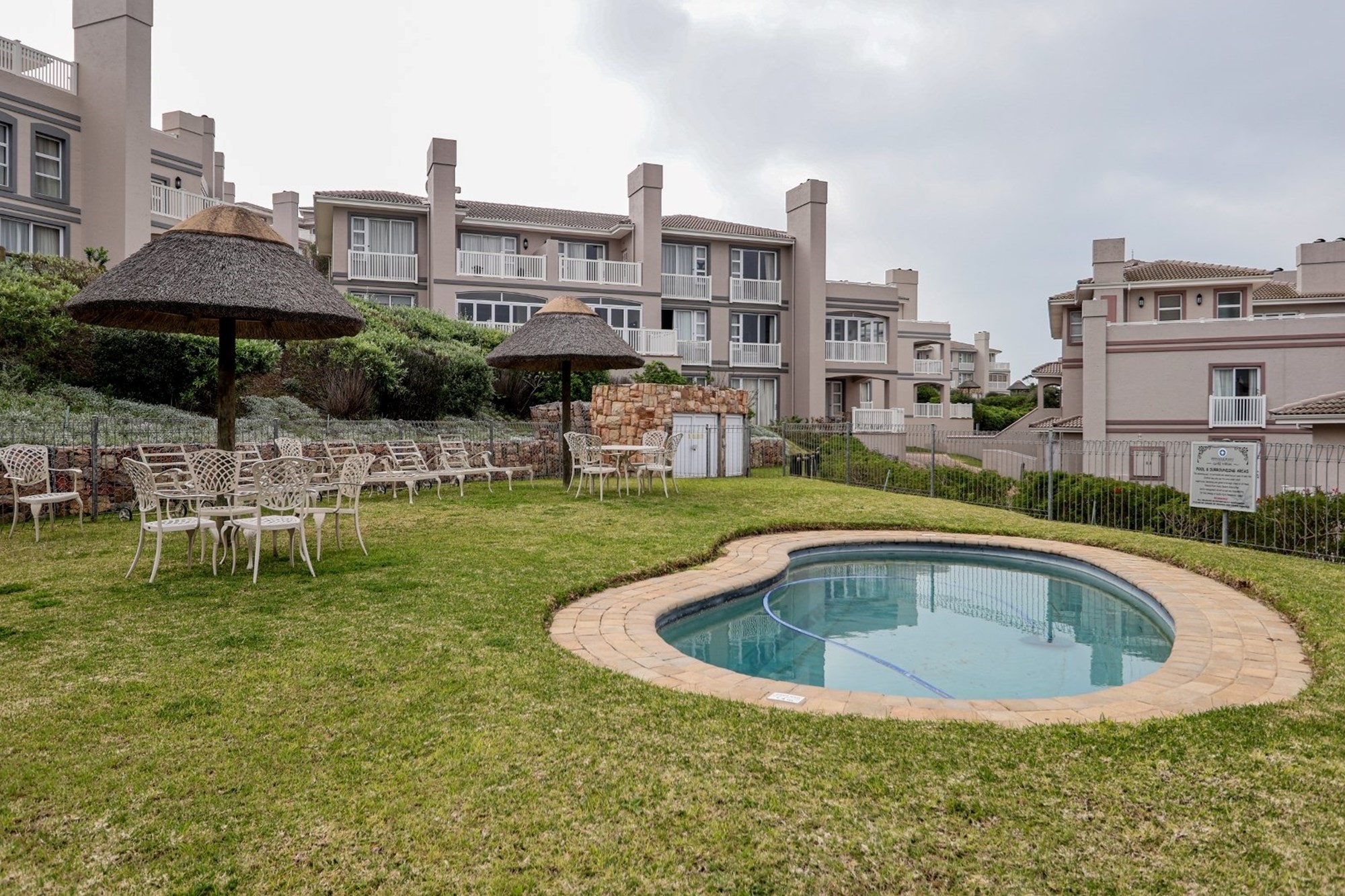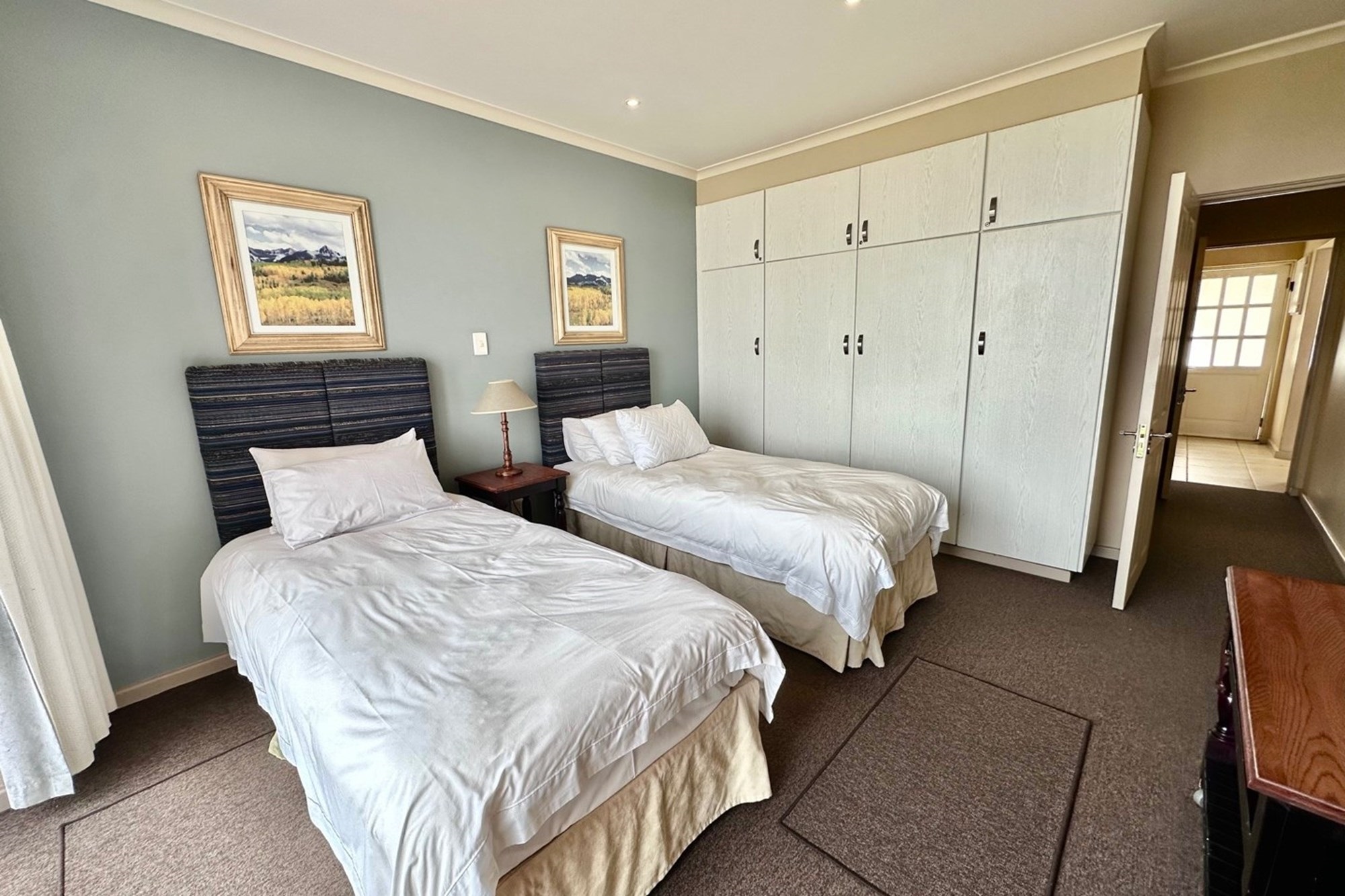 Featuring three spacious bedrooms and three en-suite bathrooms, the open-plan design seamlessly connects the modern kitchen to the dining and living areas, both of which lead out to a lush lawn and a patio equipped with a built-in braai and stunning sea views. Very close to communal swimming pool.