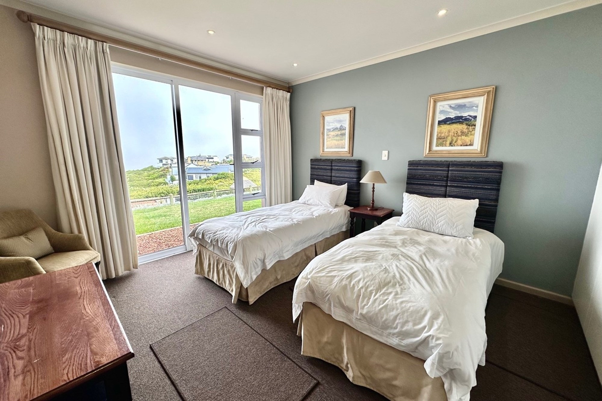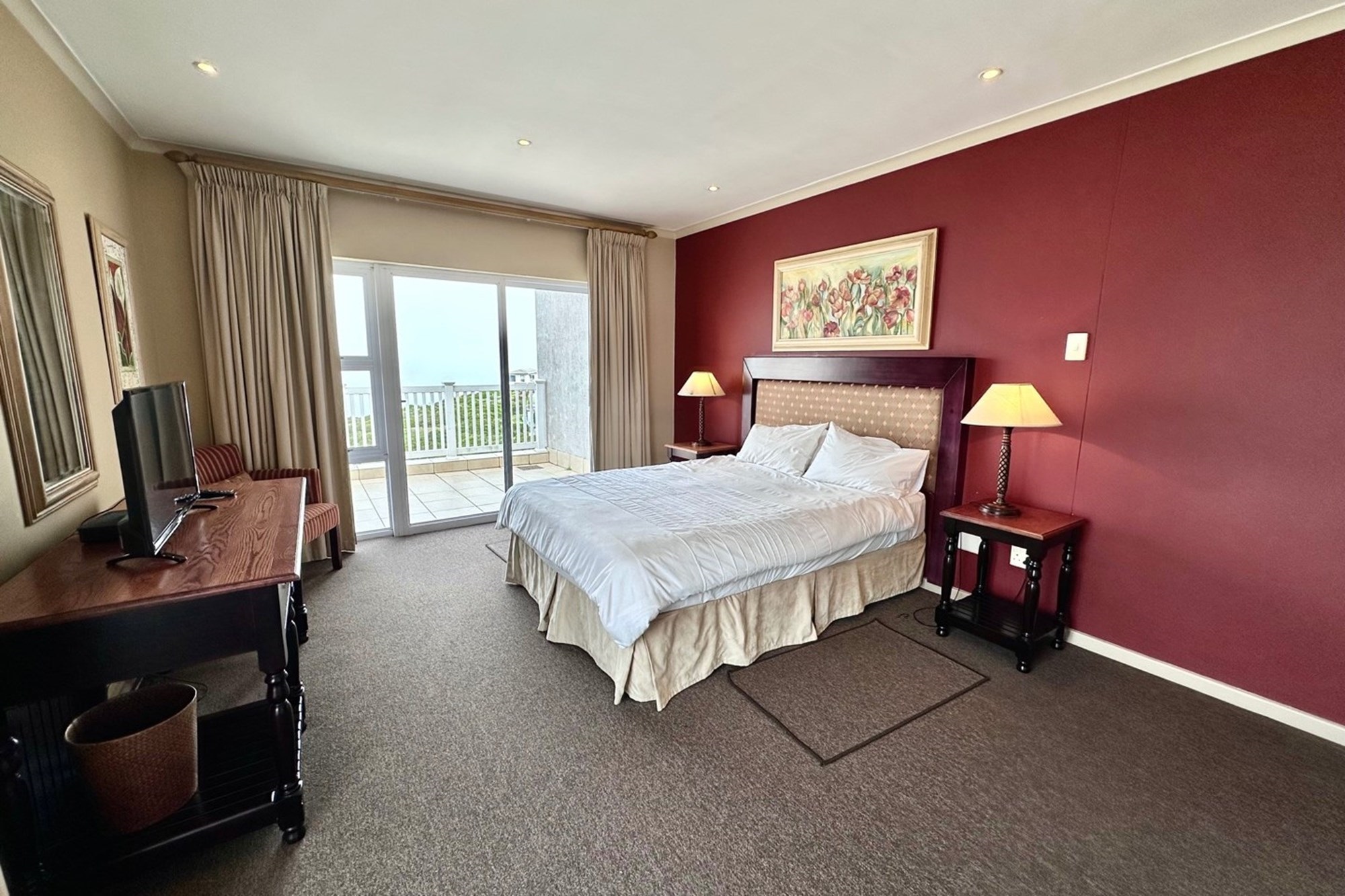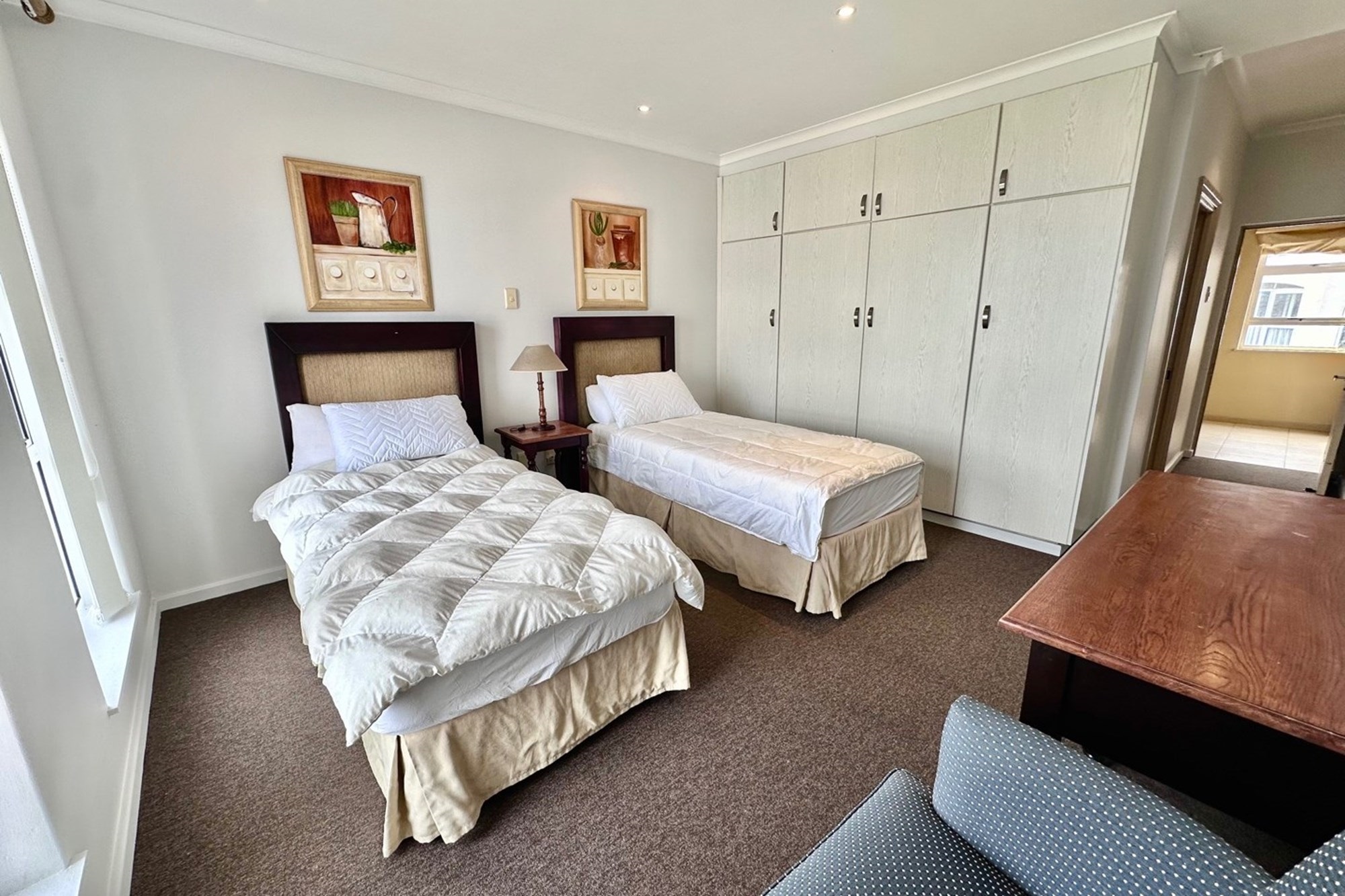 Featuring three spacious bedrooms and three en-suite bathrooms, the open-plan design seamlessly connects the modern kitchen to the dining and living areas, both of which lead out to a lush lawn and a patio equipped with a built-in braai and stunning sea views. Very close to communal swimming pool.