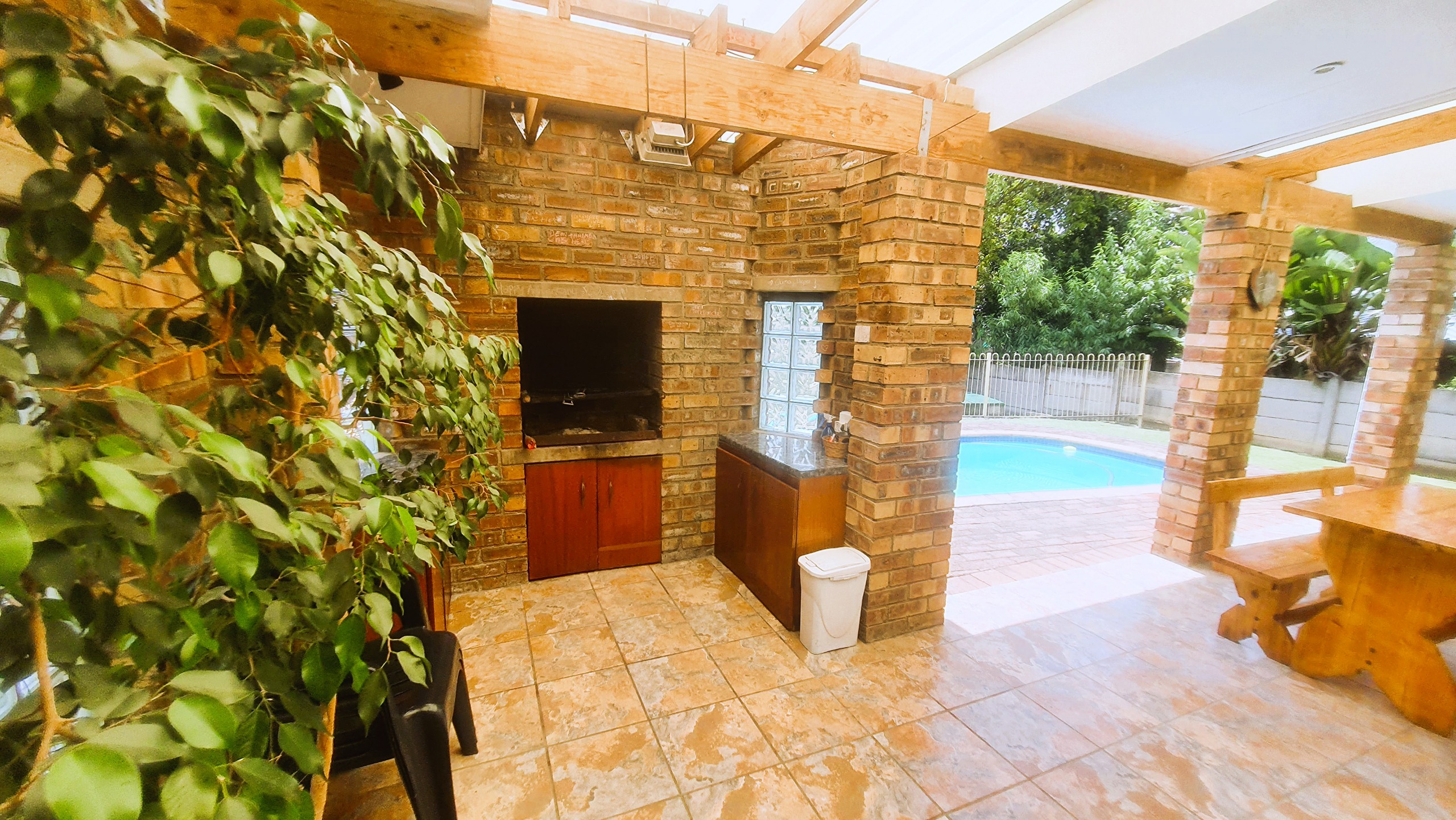 The cherry on top is the beautifully finished granny flat, ideal for extended family, guests or extra income. It includes a lounge, a stylish kitchen with fittings for a washing machine or dishwasher, a main bedroom with en-suite bathroom, a second smaller bedroom or study, and a second bathroom. All rooms have air-conditioning, and sliding doors open onto a stunning verandah overlooking the pool, complete with a built-in braai — because weekends should be enjoyed properly. Extras include a double carport, a massive double workshop/garage (yes, it fits two caravans), two 2 500-litre JoJo tanks, an outside toilet with sauna and shower, plus a large tool shed.