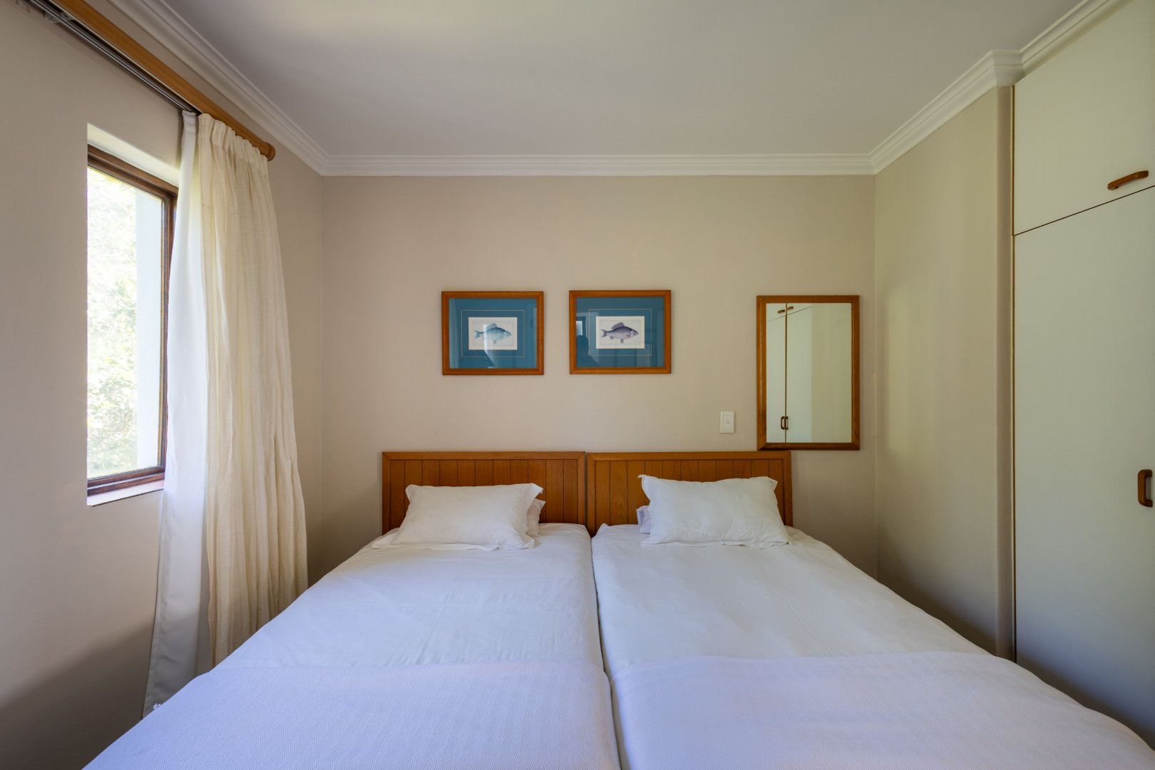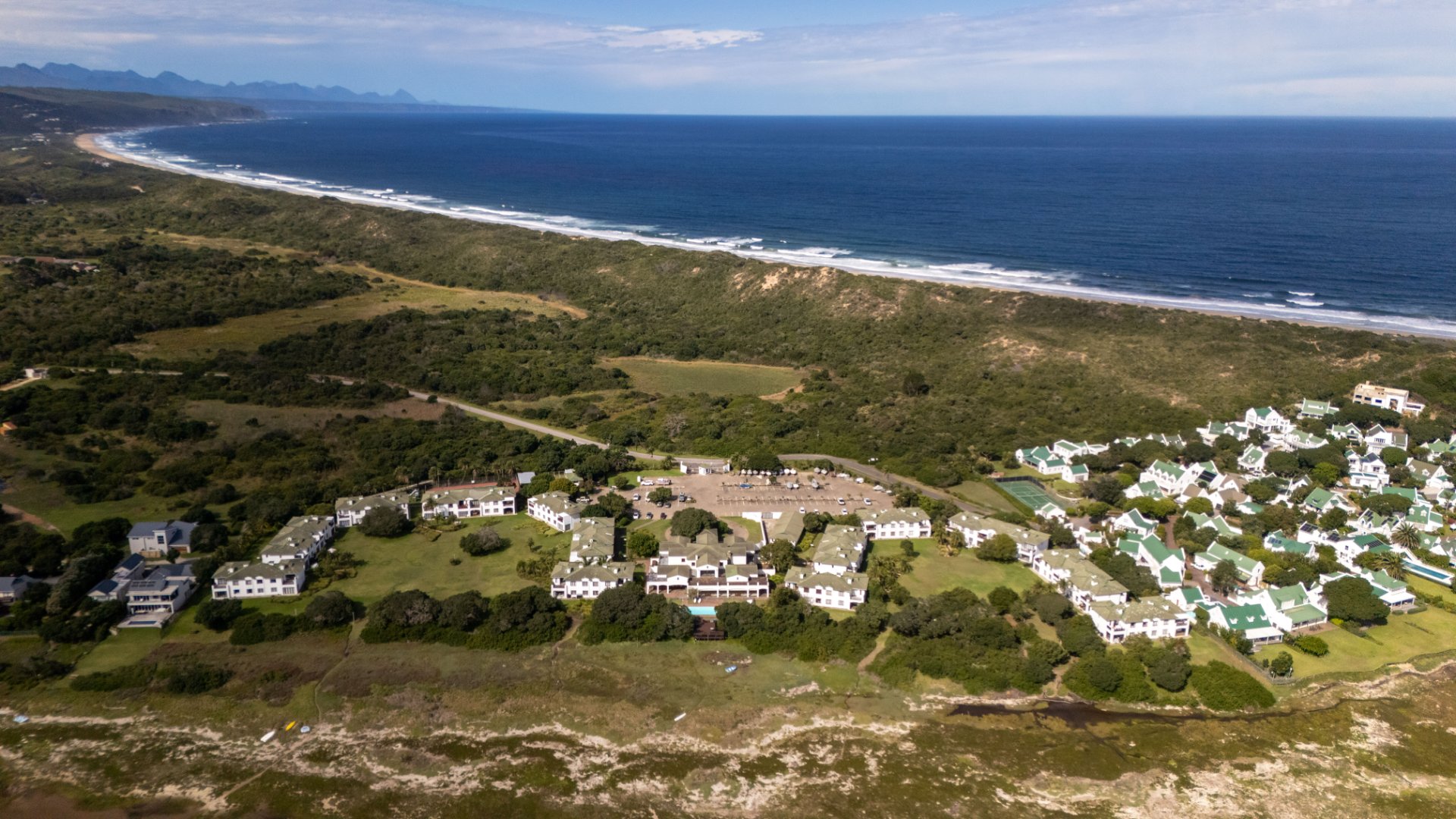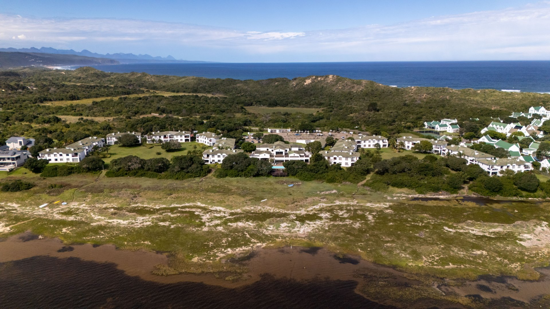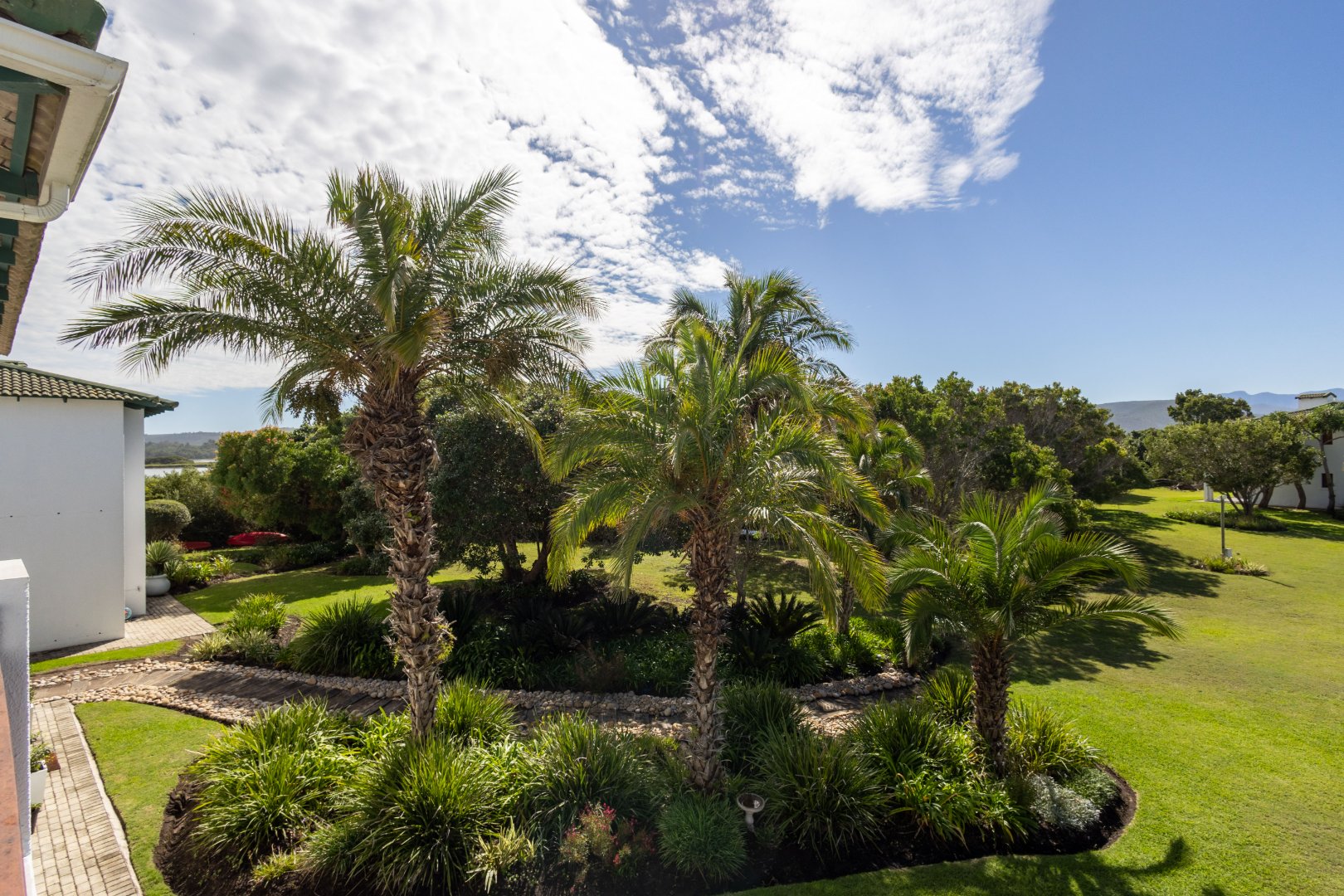 This upstairs unit offers stunning views of the mountains, river and beautiful gardens. The two-bedroom, two-bathroom unit, faces north so it is warm and welcoming. This tranquil setting on the Keurbooms River Lagoon is rare and special. The beautiful Keurbooms Beach is a mere 15 stroll over the sand dune.