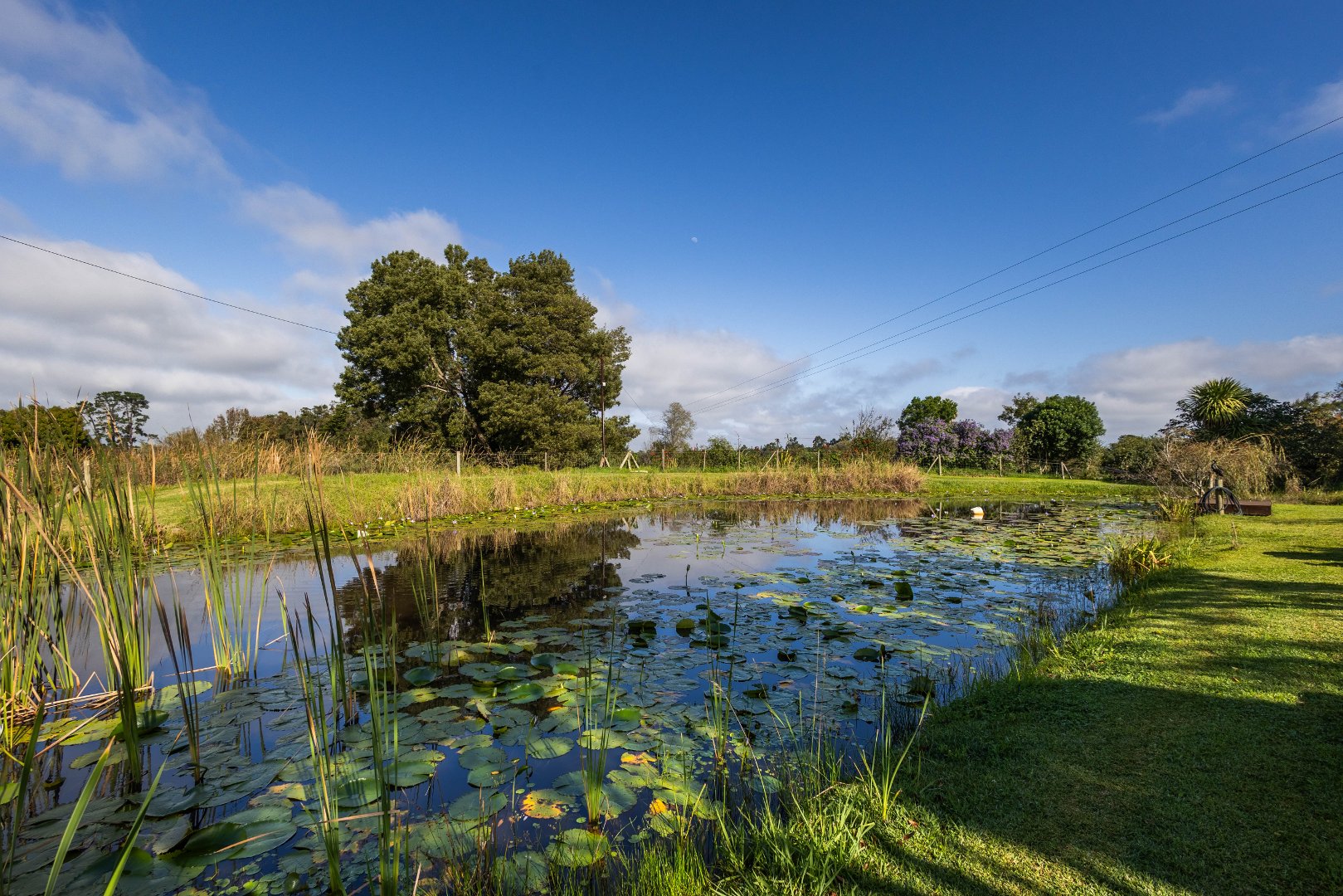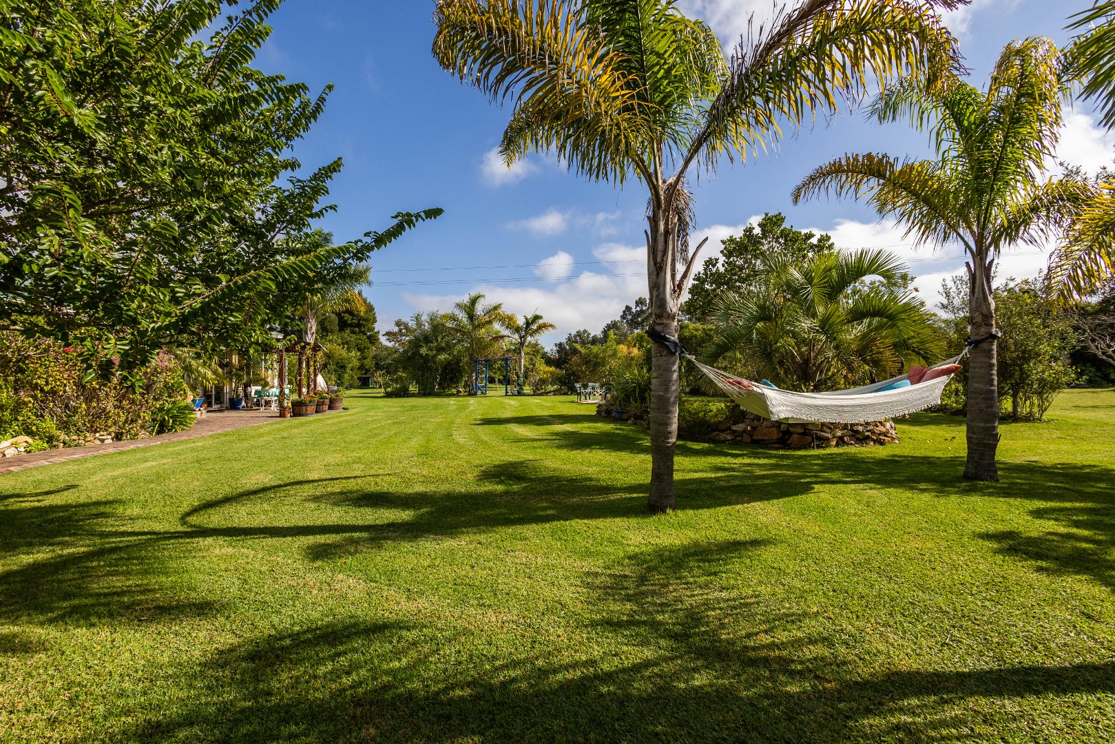 This array of fruit trees along with the pretty dam attract prolific birdlife. Strung between a pair of palms the idyllic hammock beckons to take some time out.