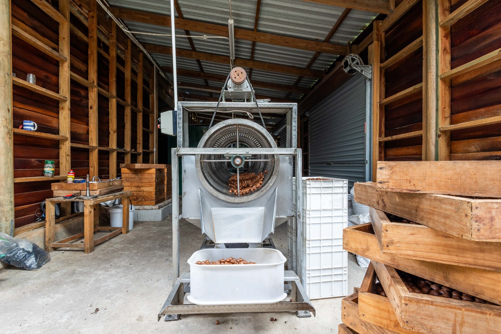 Processing Shed: The well-equipped shed includes all necessary tools for drying, sorting, and storing the nuts, streamlining the production process.