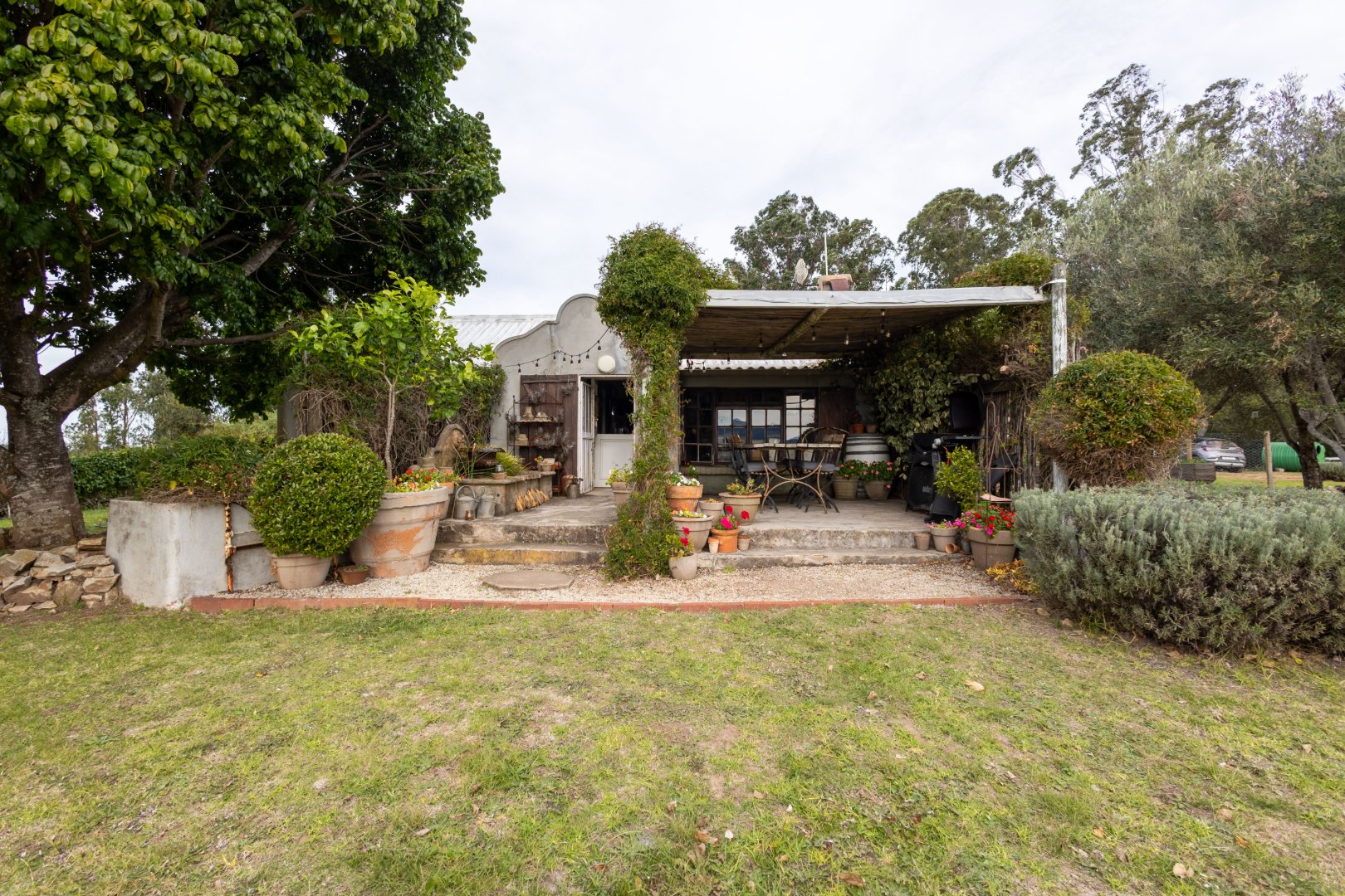 North facing covered patio with a trickling fountain looking onto the garden