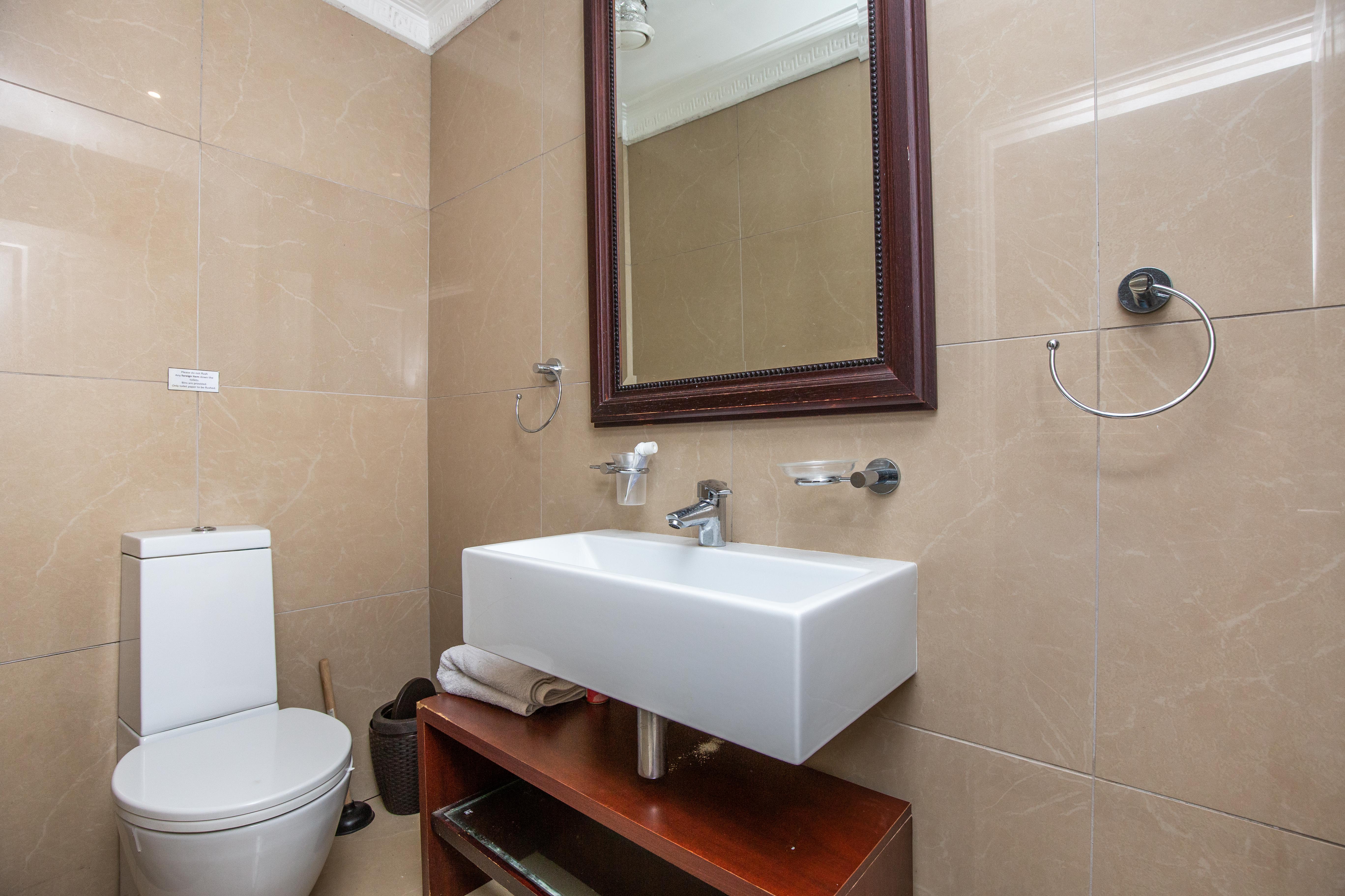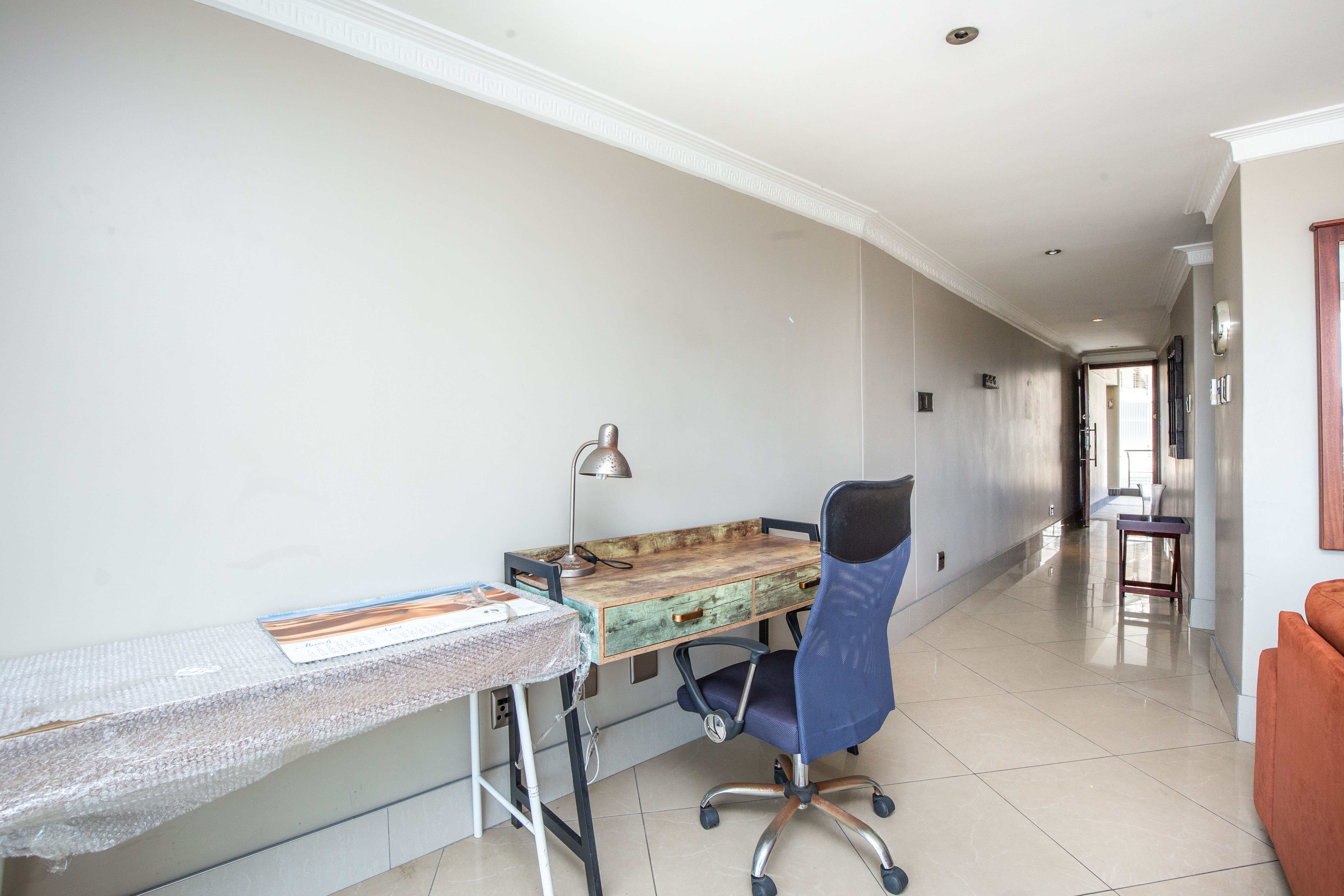 The well-proportioned bedroom includes three built-in cupboards and air-conditioning, while the modern bathroom is fitted with a glass-fronted shower, designer mirror, and premium Grohe fittings throughout. Air-conditioning in both the living area and bedroom ensures year-round comfort.
