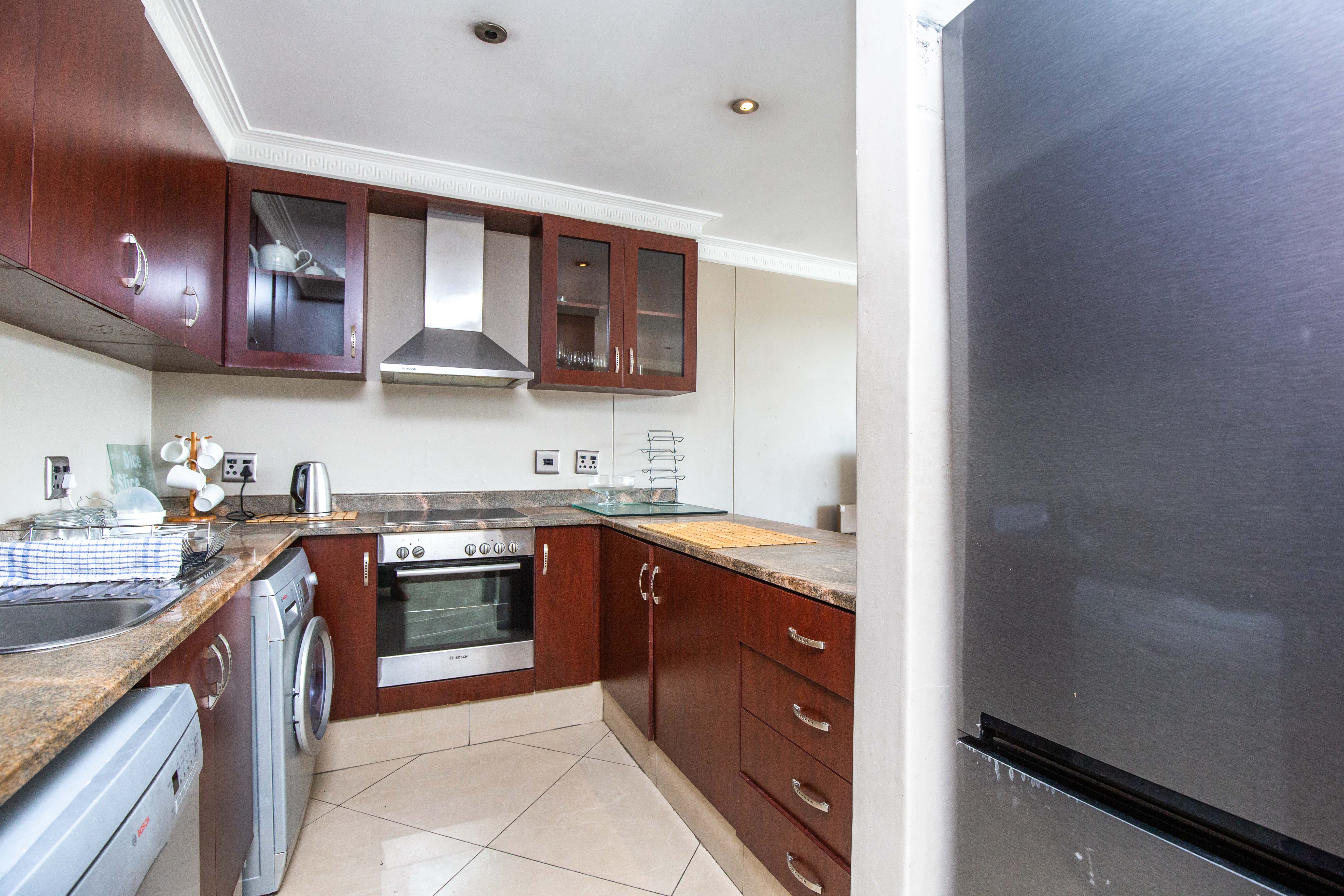 The contemporary kitchen is thoughtfully designed to accommodate both a dishwasher and washing machine, with quality fixed appliances and ample cupboard space — ideal for long-term living or short-term rentals.