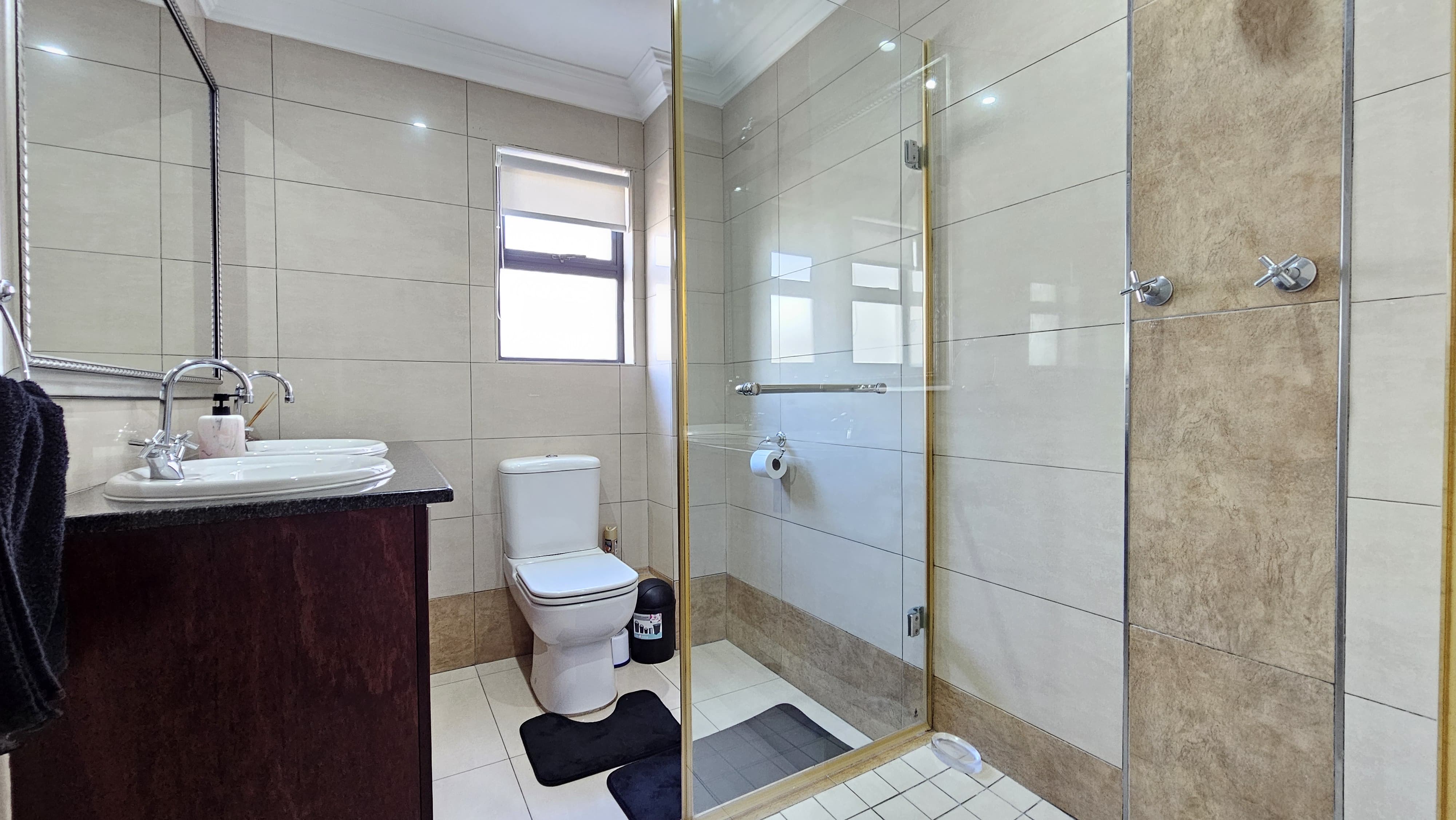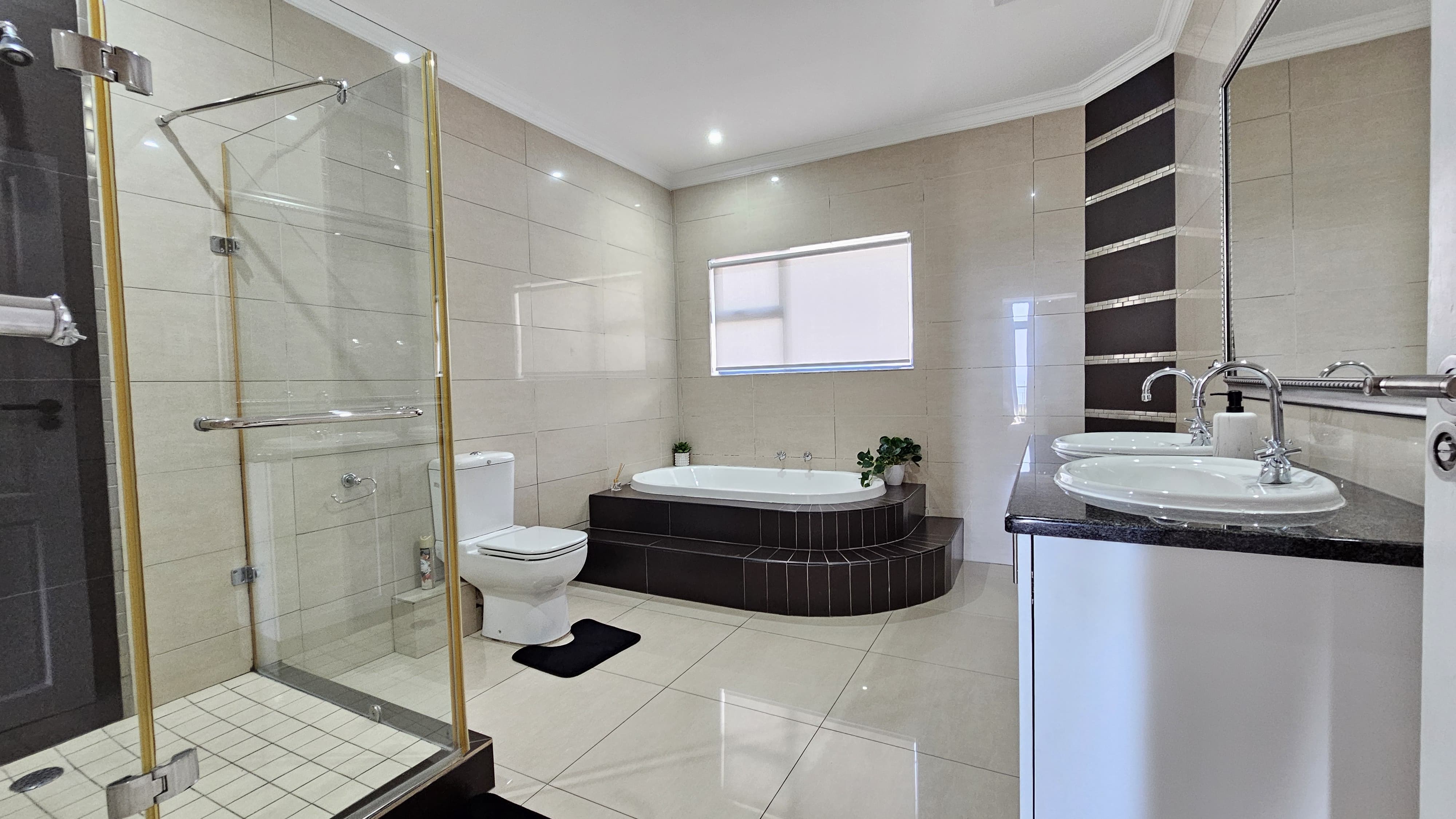 The apartment features three bathrooms, all fitted with elegant tiles, modern showers, and luxurious bathtubs, perfect for unwinding after a long day.