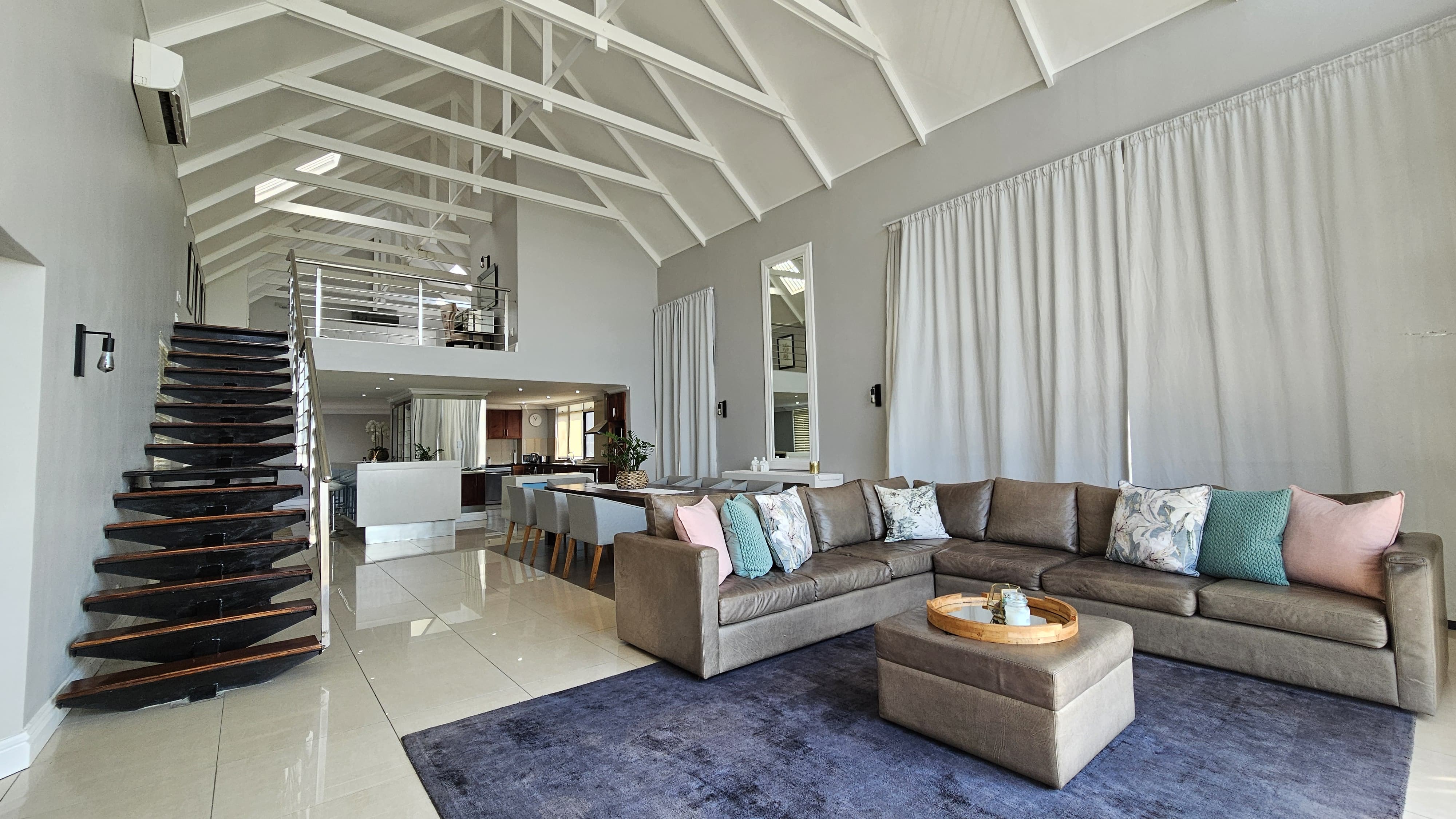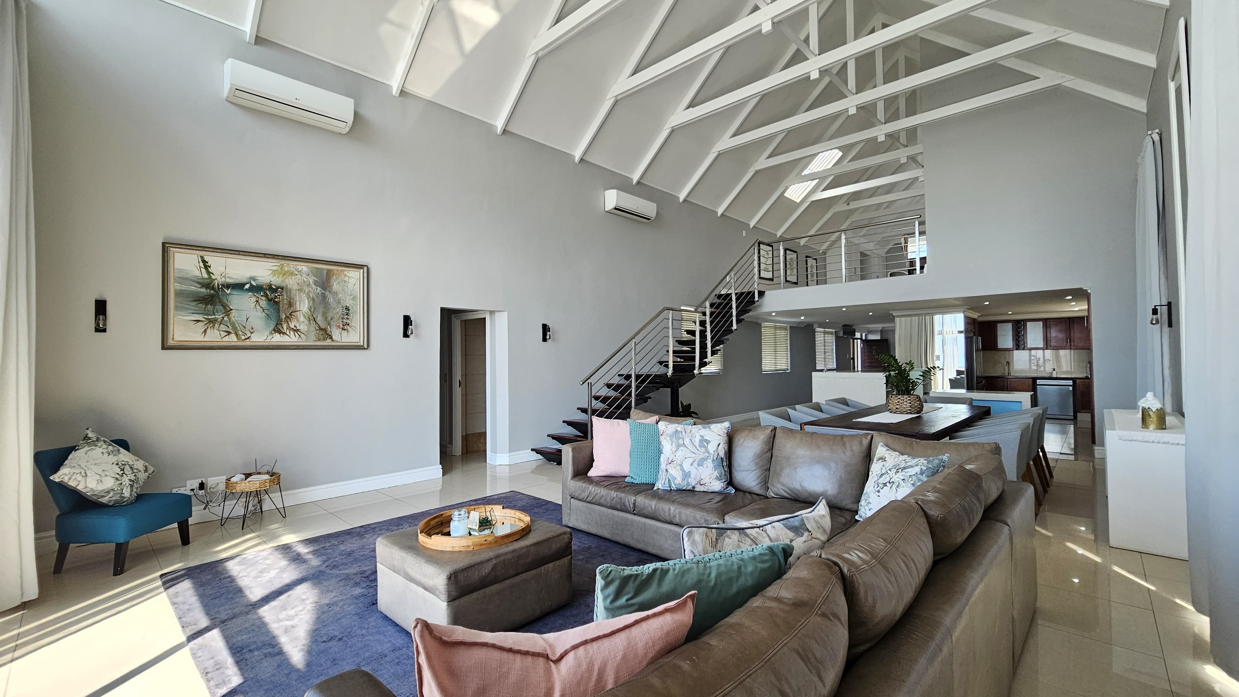 The lounge flows seamlessly into the dining area, which features a large table for family meals or gatherings.