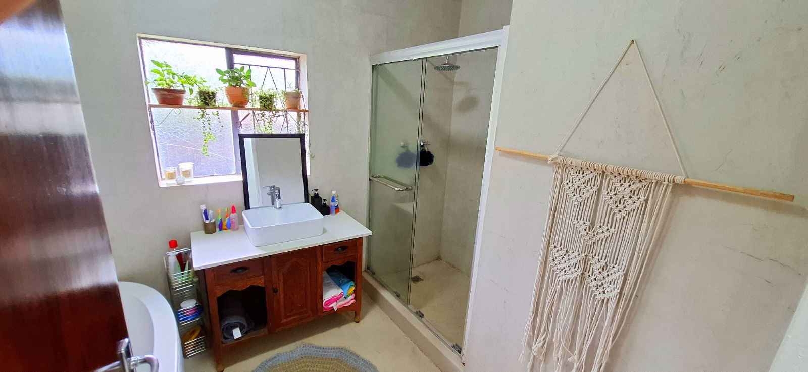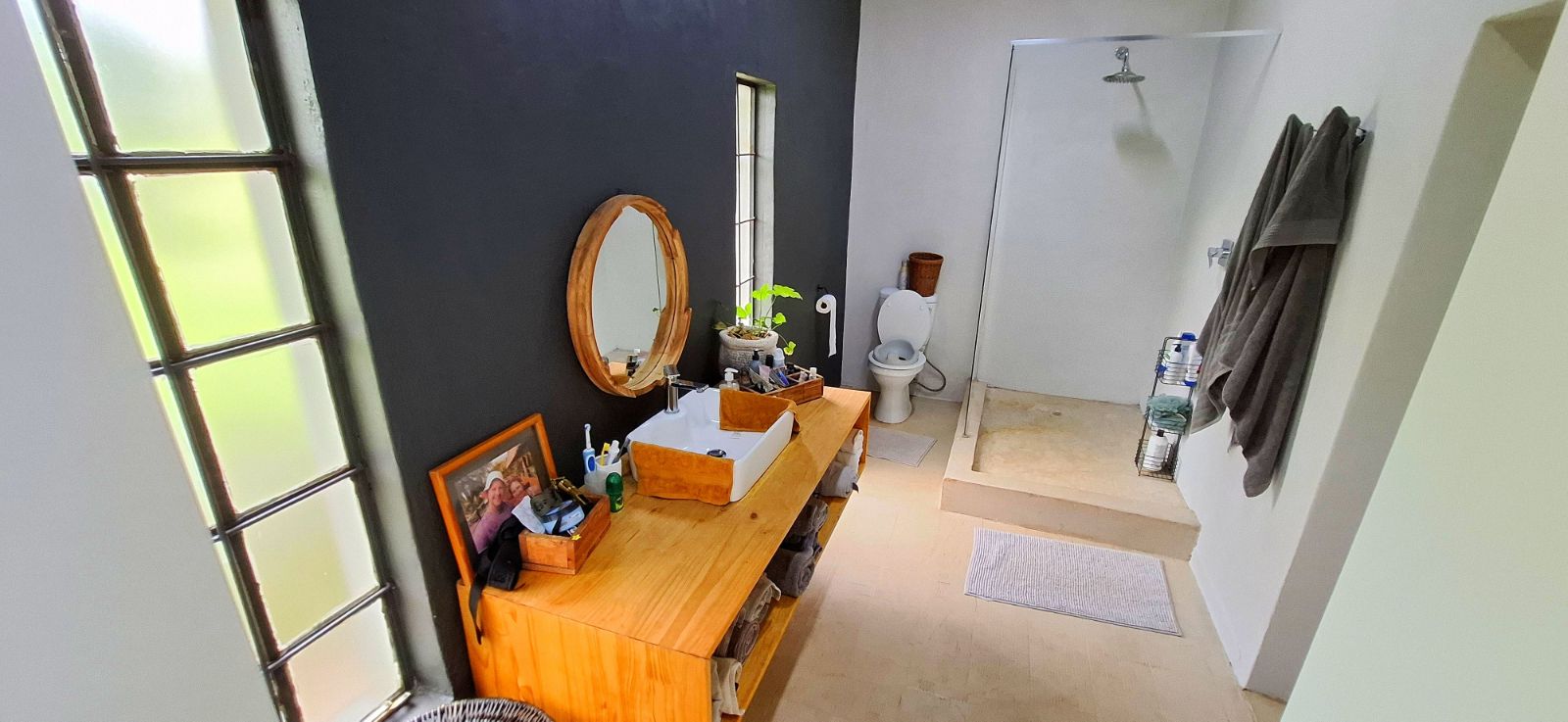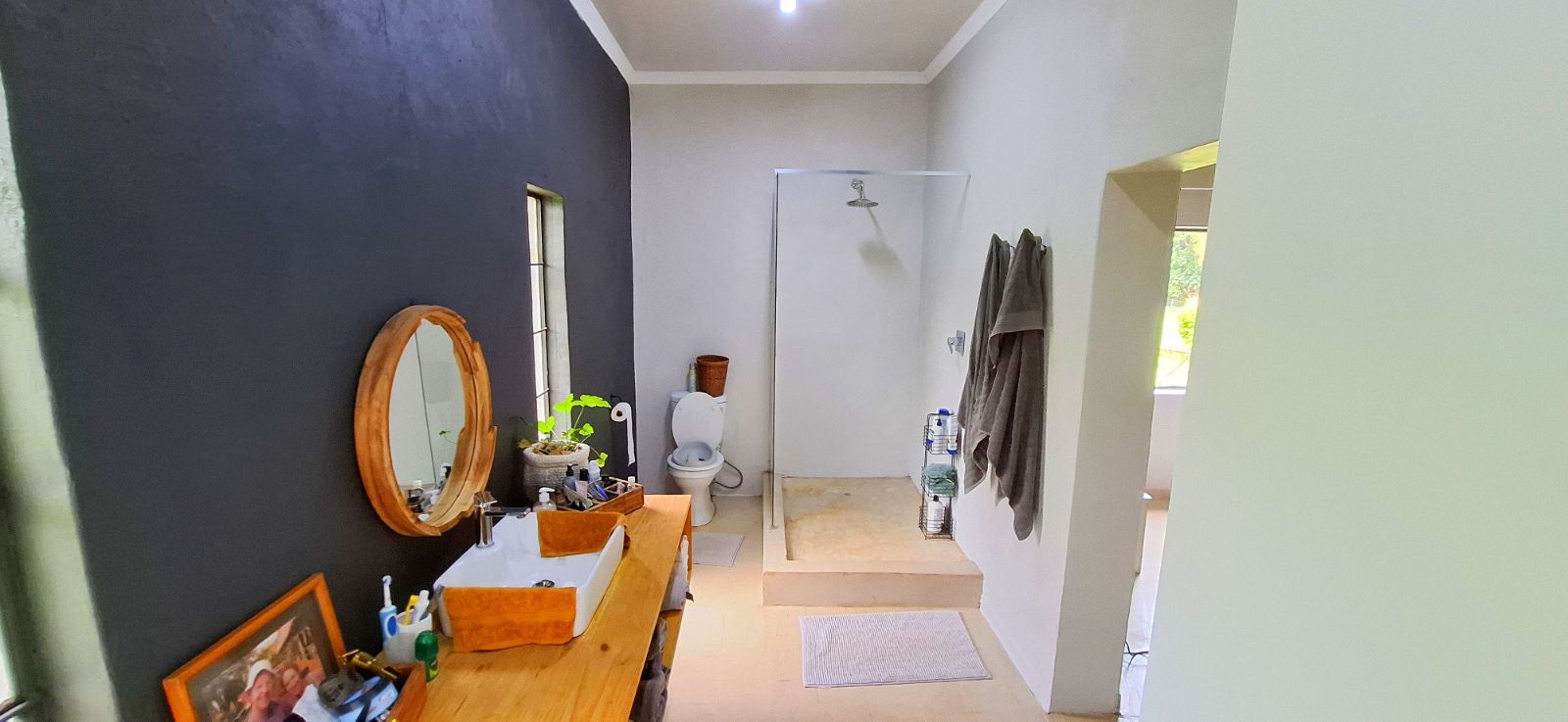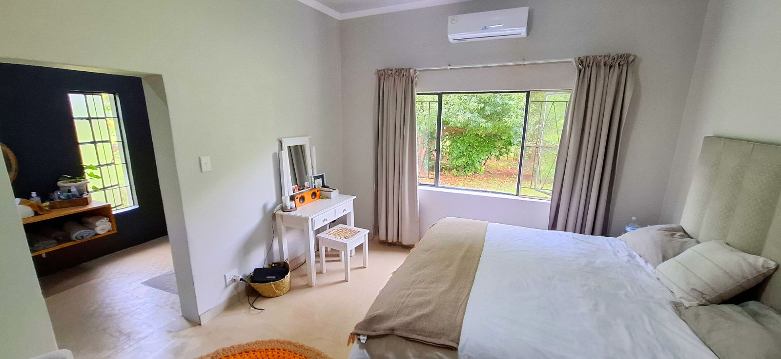 The main bedroom features a 12,000 BTU air conditioner and a luxurious en-suite bathroom with a spacious shower.