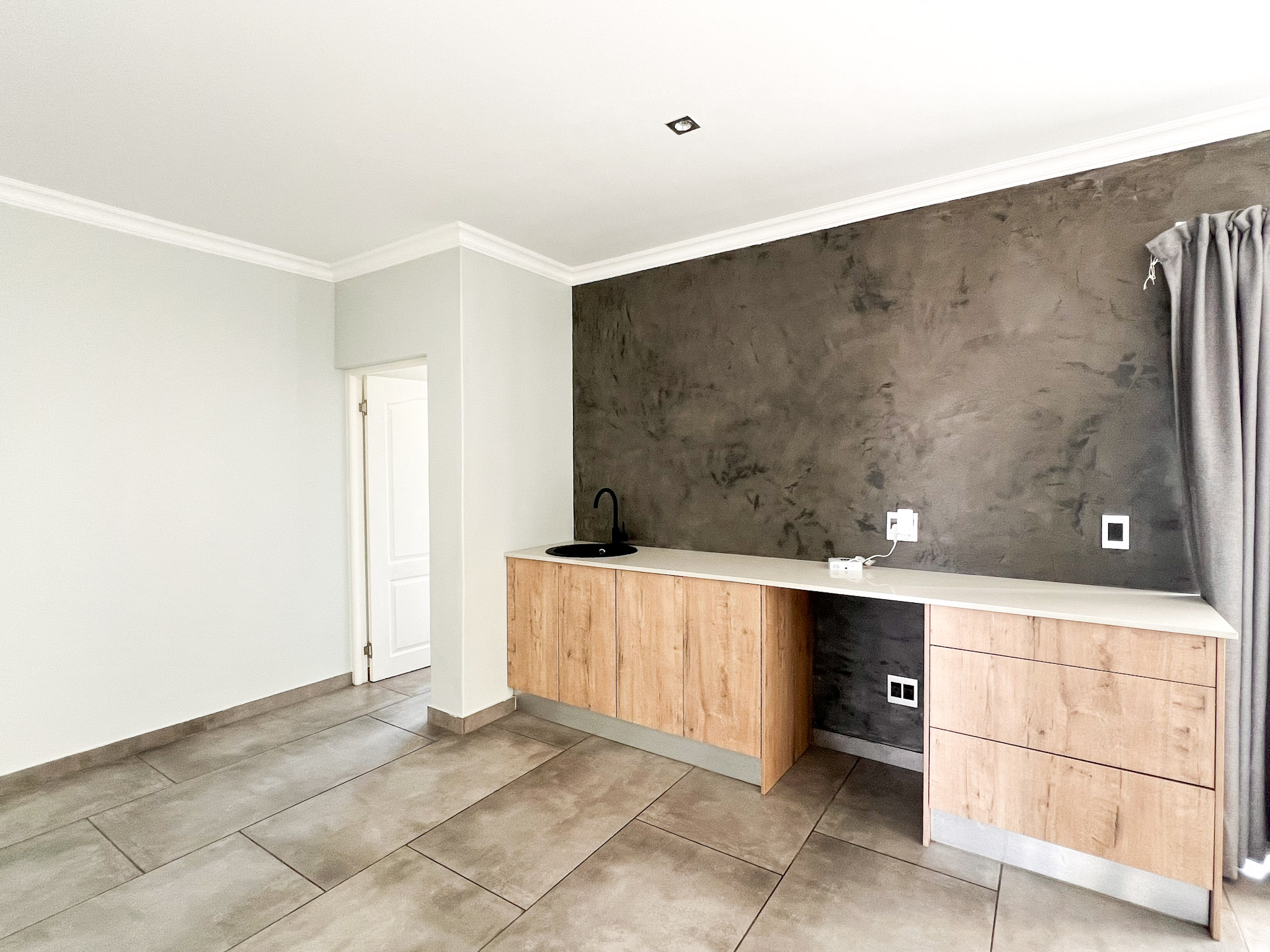 A small lounge and kitchenette with prep bowl – perfect as a coffee station